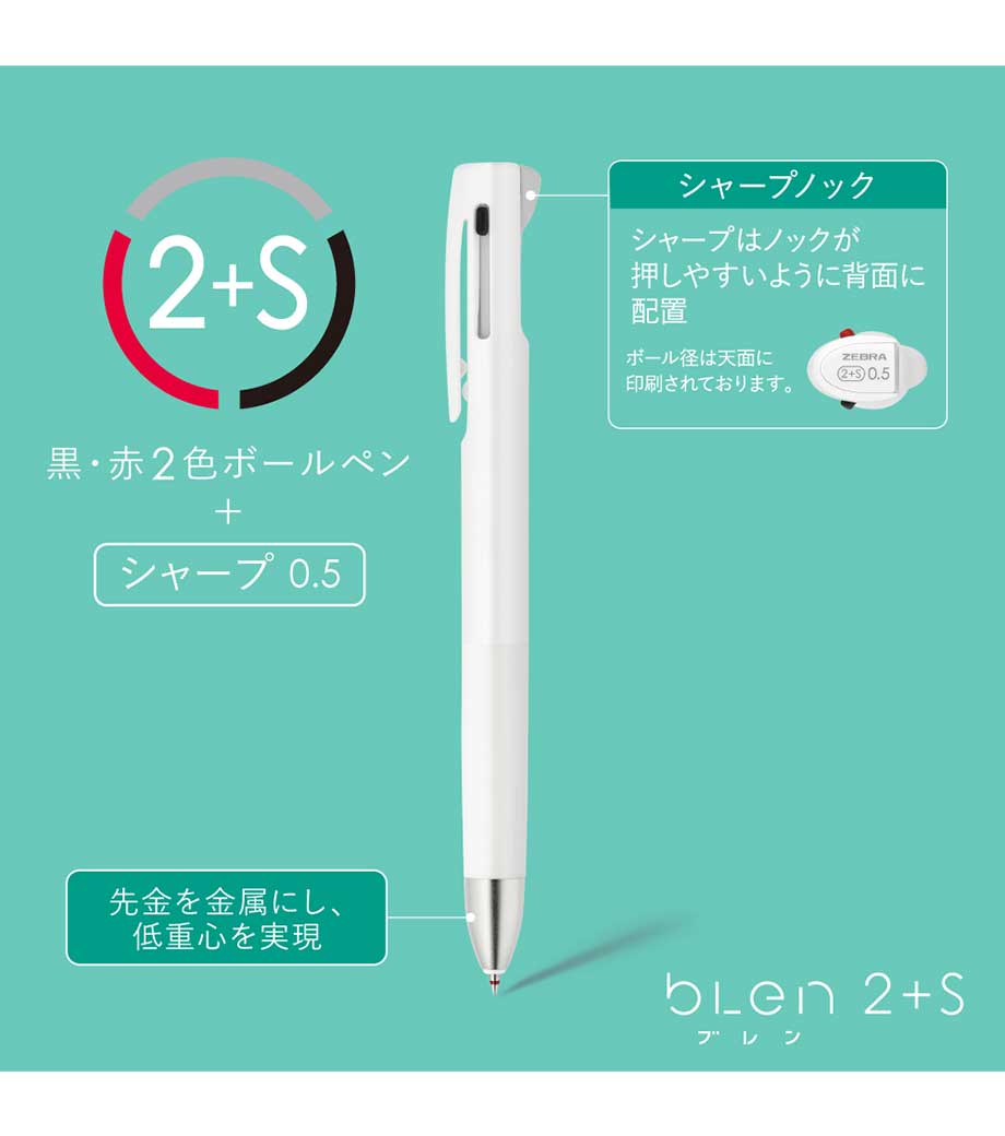 ゼブラ独自の「ブレンシステム」を搭載した多機能ペンです。筆記時の振動をしっかり抑え、ストレスフリーな書き心地を実現。ボールペンは耐水性・耐光性に優れたエマルジョンインクで、公式文書への書き込みもOK。視認性の高い0.7mmのボール径です。背面のノックを押せばシャーペンも使えます。単色タイプと変わらないスマートボディで携帯性も抜群!