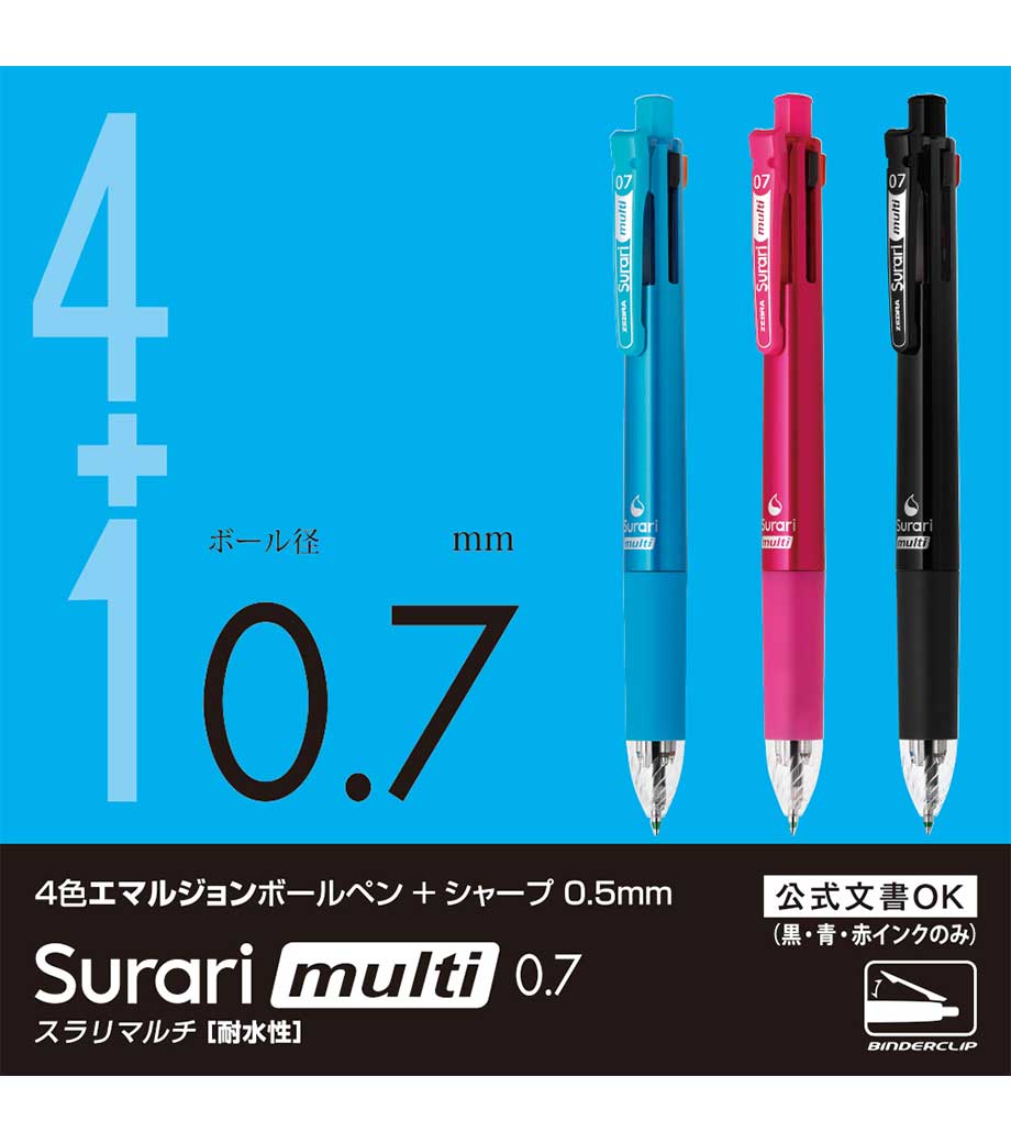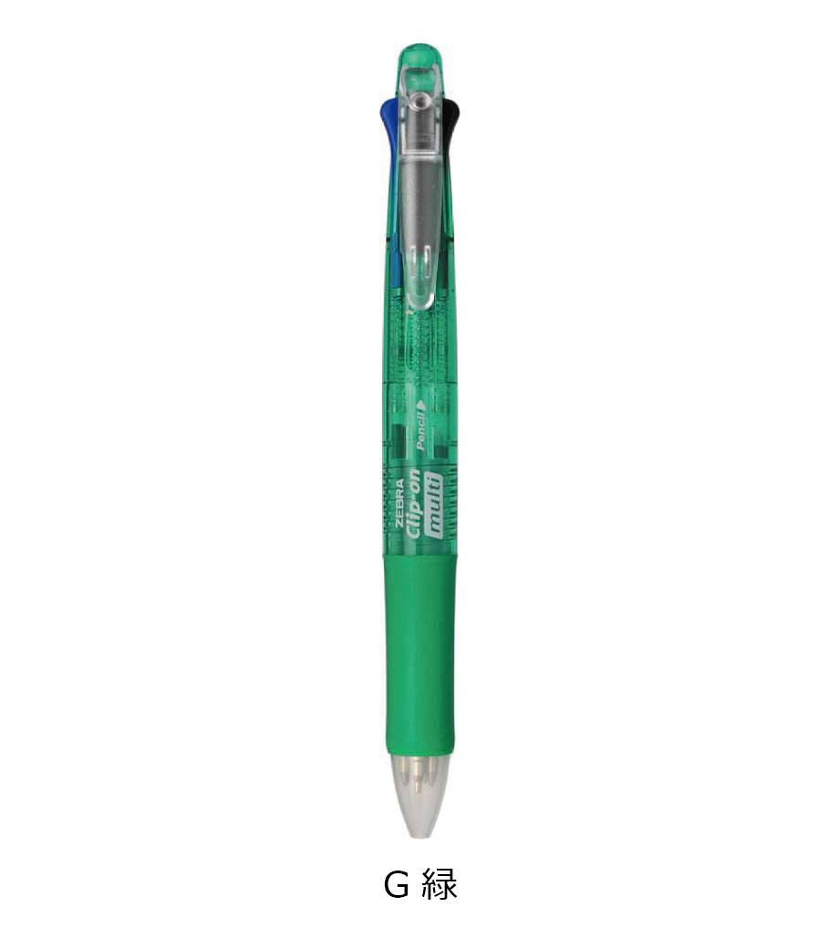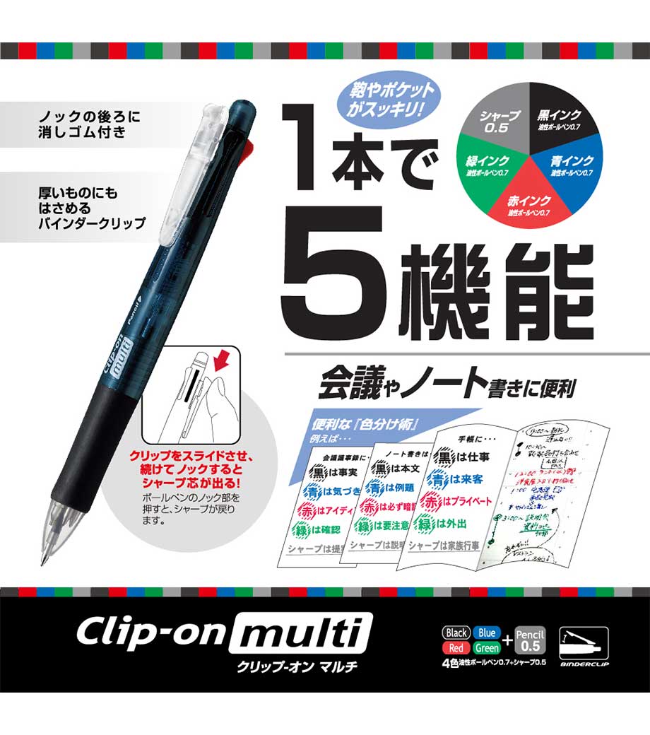 ゼブラ クリップ-オン マルチ 0.7mmは1本で5機能使える多機能ボールペンです。黒、赤、青、緑4色の0.7mmボールペンと、0.5mmシャープペンを搭載。滲みに強く耐水性に優れ、速乾性も高い油性インクを採用しています。油性インクは耐光性にも優れているので、長期間保存される文書の使用におすすめです。軸等には再生材を使用しています。