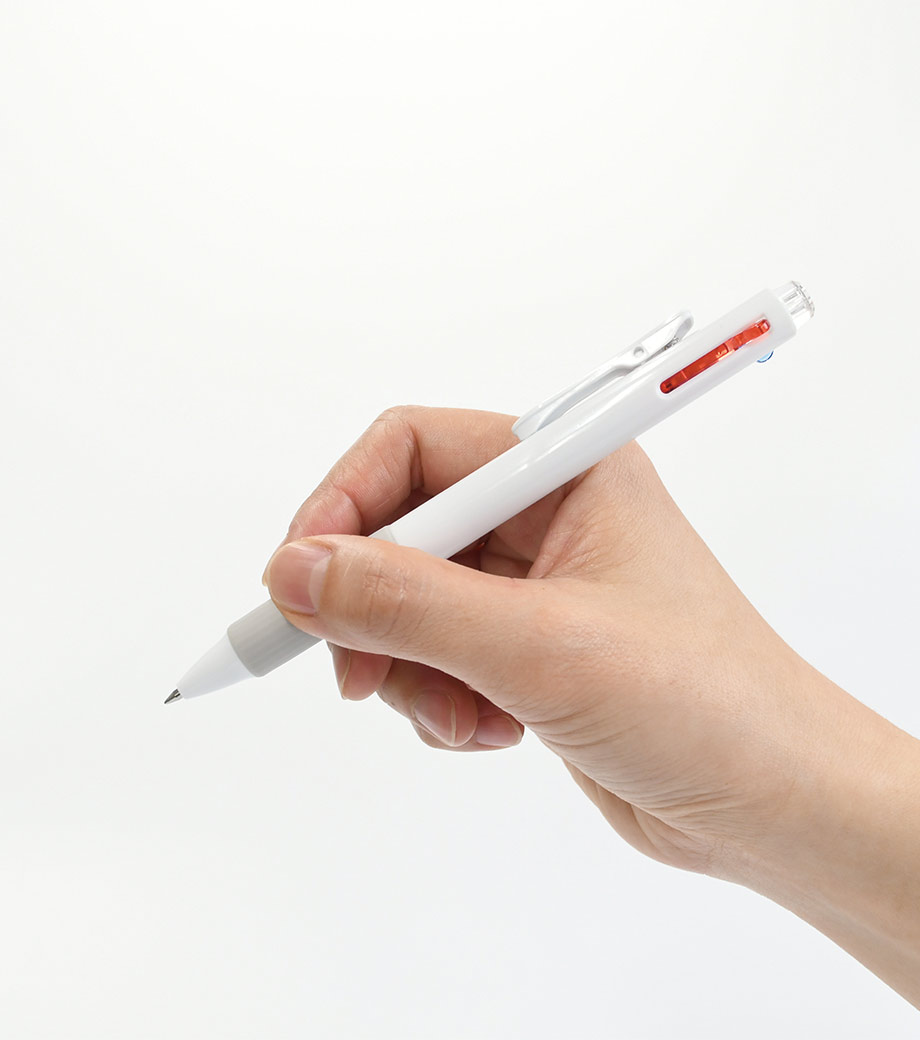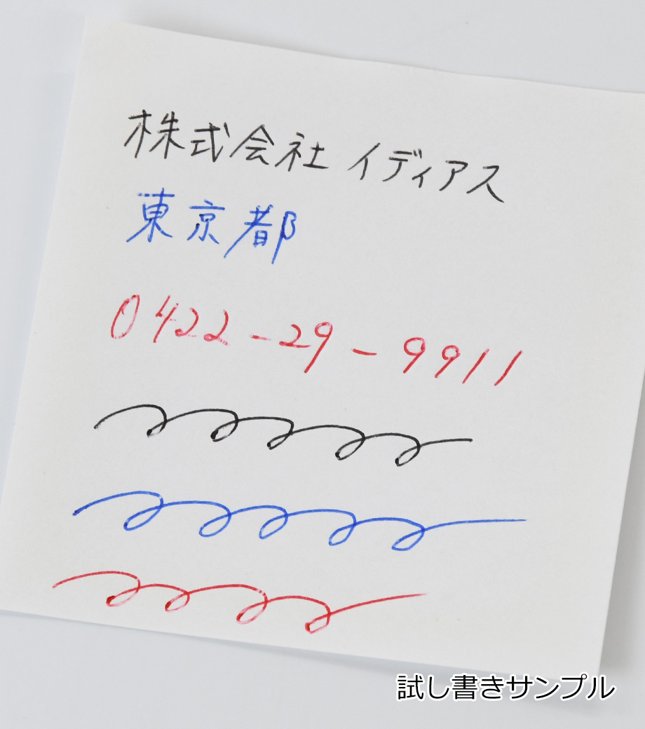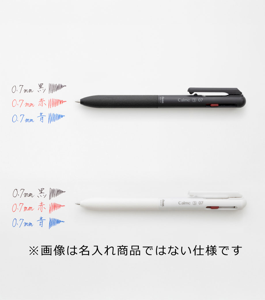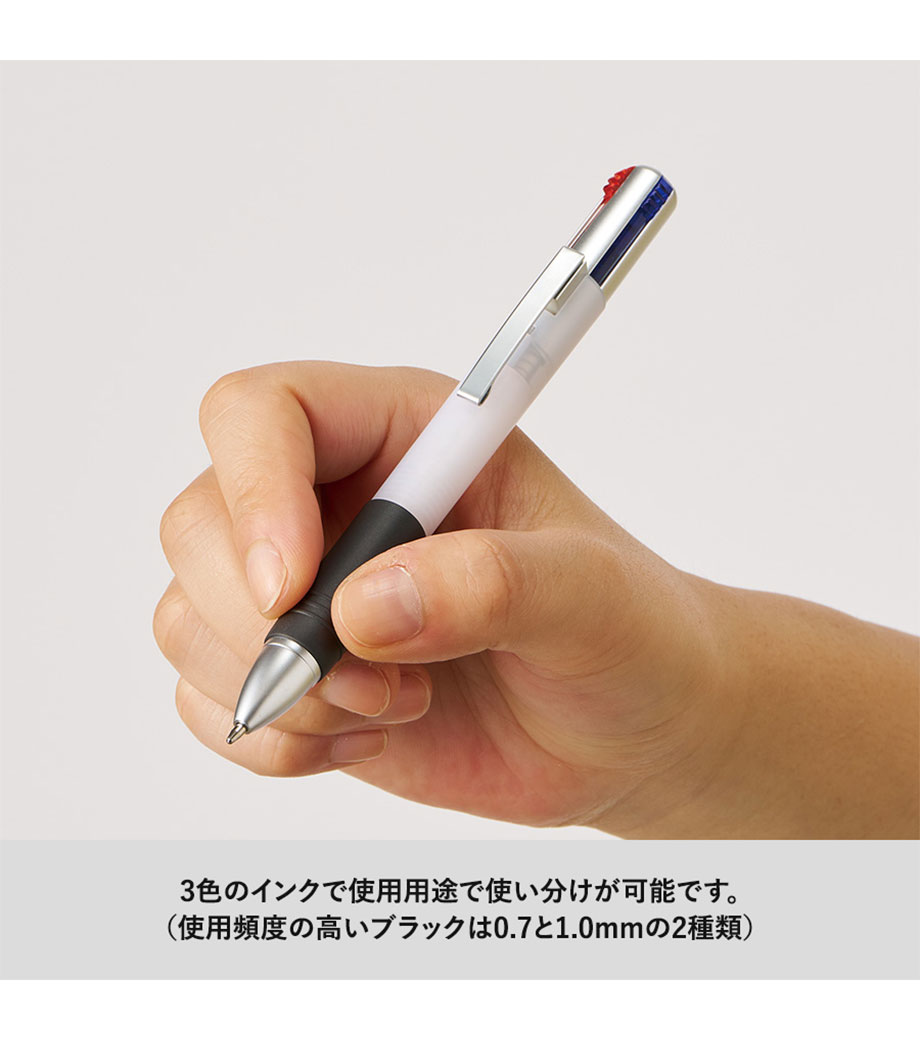 インクはエマルジョンインクを採用。乾きやすくかすれにくいのが特徴で、油性インクと水性インクを「7:3」で配合した"いいところどり"なインクです。1色印刷とフルカラー印刷(白軸のみ)可能。会社名や学校名を入れてオリジナルの3色ボールペンが作れます。
