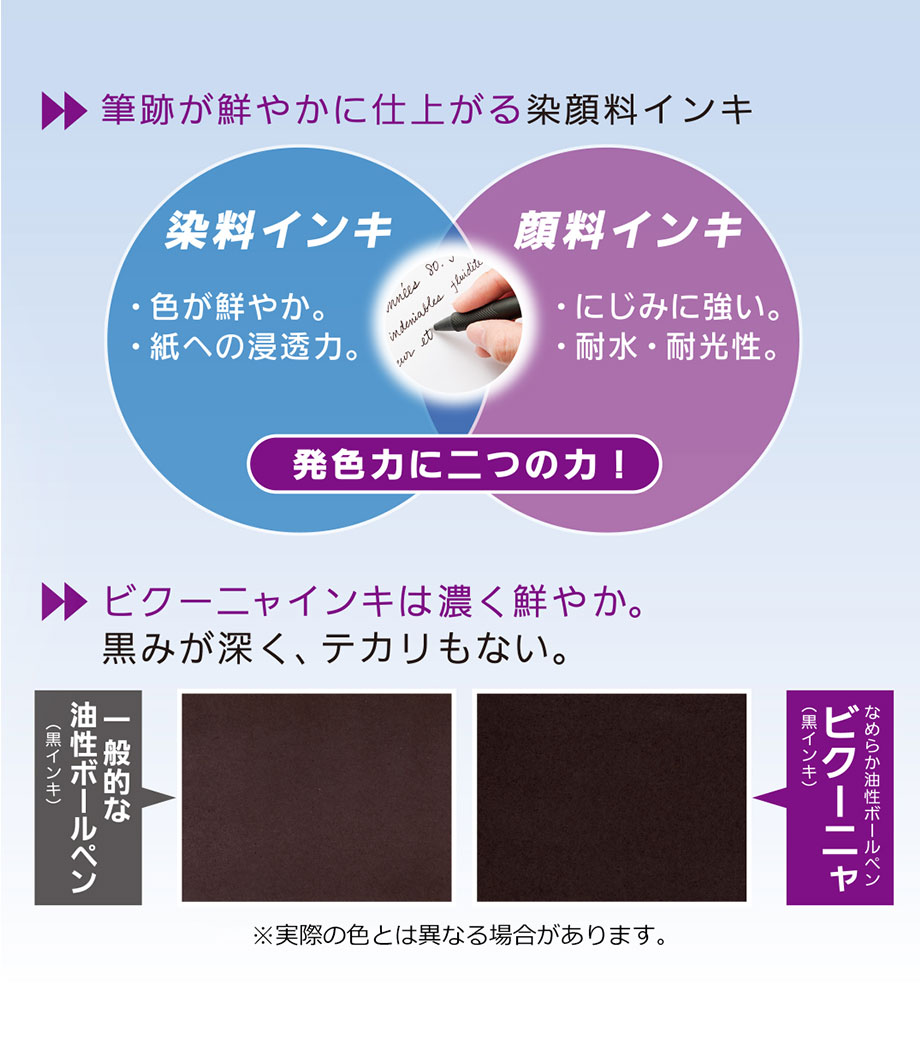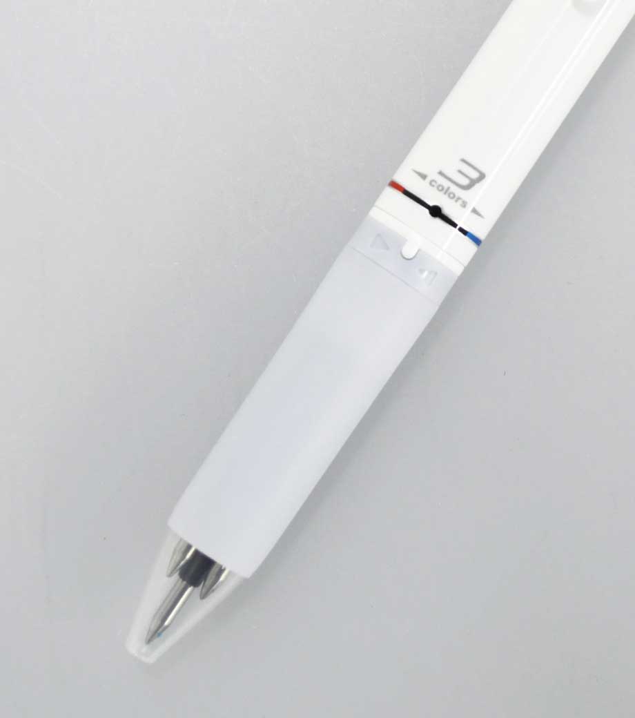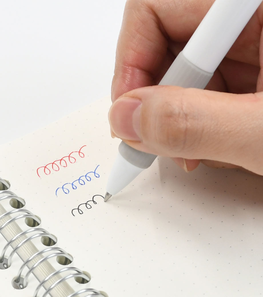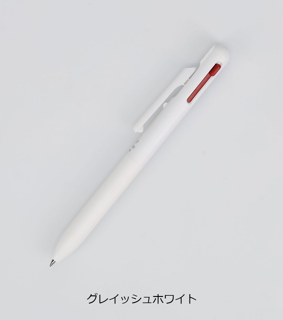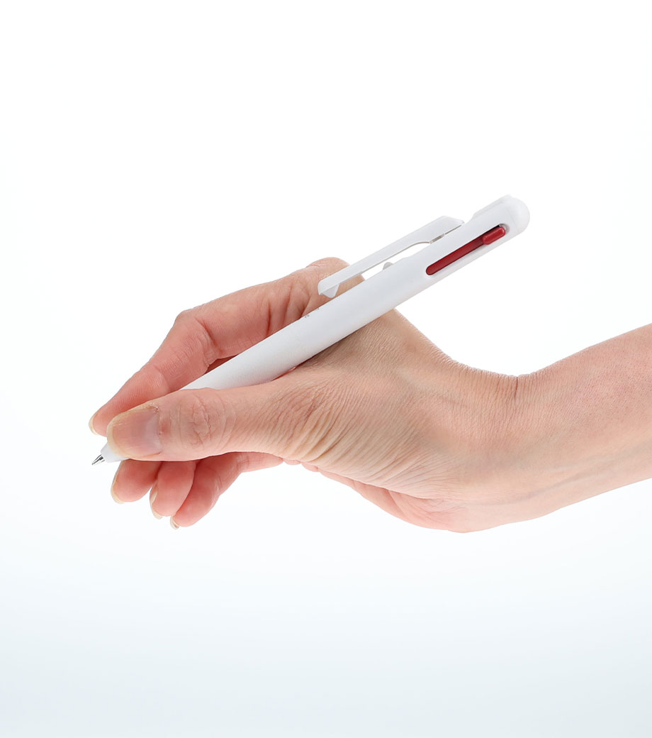 インクはエマルジョンインクを採用。乾きやすくかすれにくいのが特徴で、油性インクと水性インクを「7:3」で配合した"いいところどり"なインクです。1色印刷とフルカラー印刷(白軸のみ)可能。会社名や学校名を入れてオリジナルの3色ボールペンが作れます。