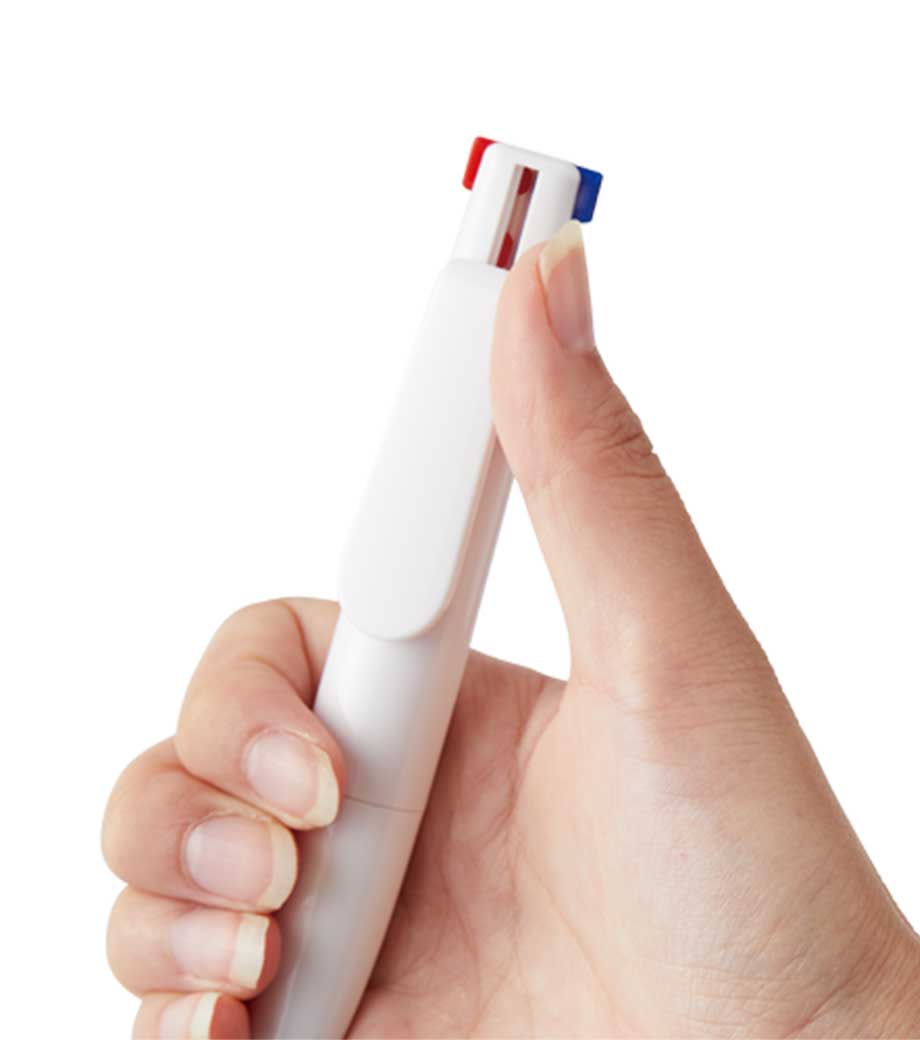 多色ボールペンは2色や3色、4色が1本に搭載された便利アイテム。持ち歩くペンの量を減らせるので、営業先のお客様や周年記念品をお渡しした相手に使ってもらいやすくなります。