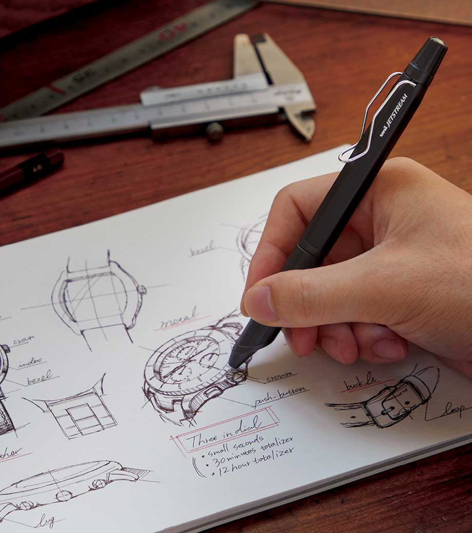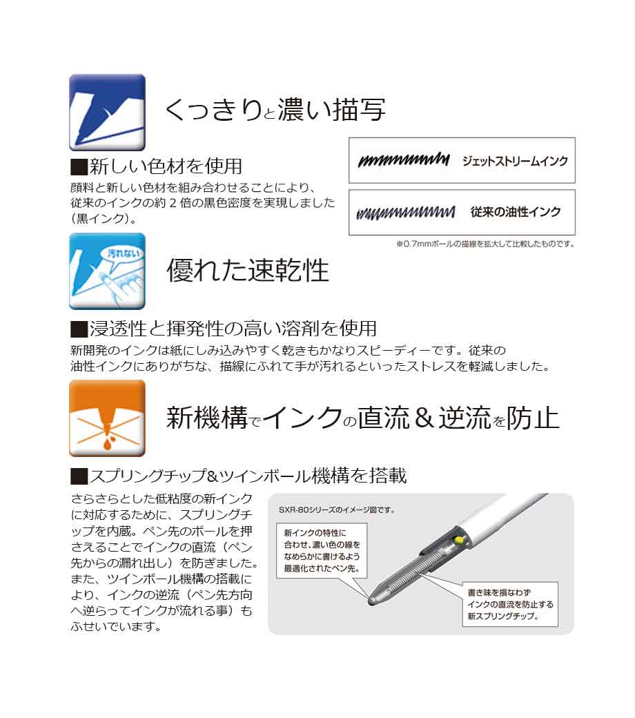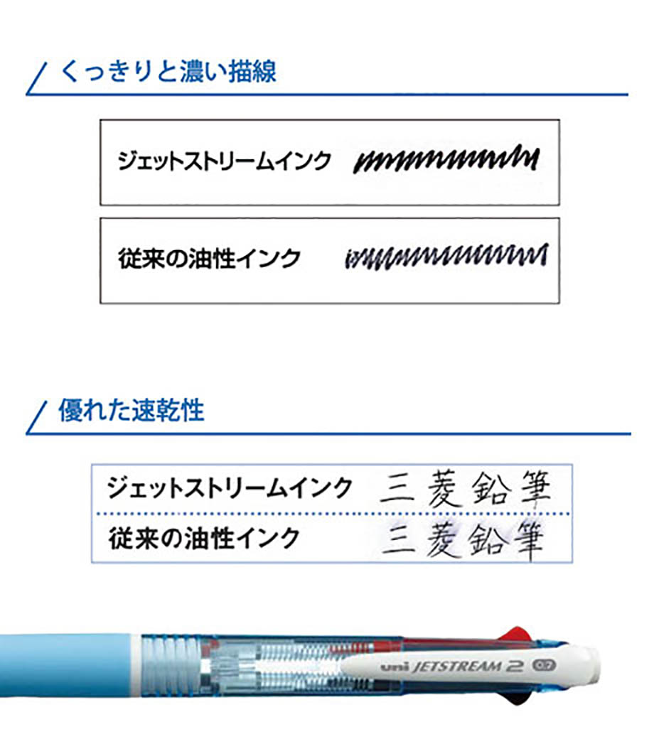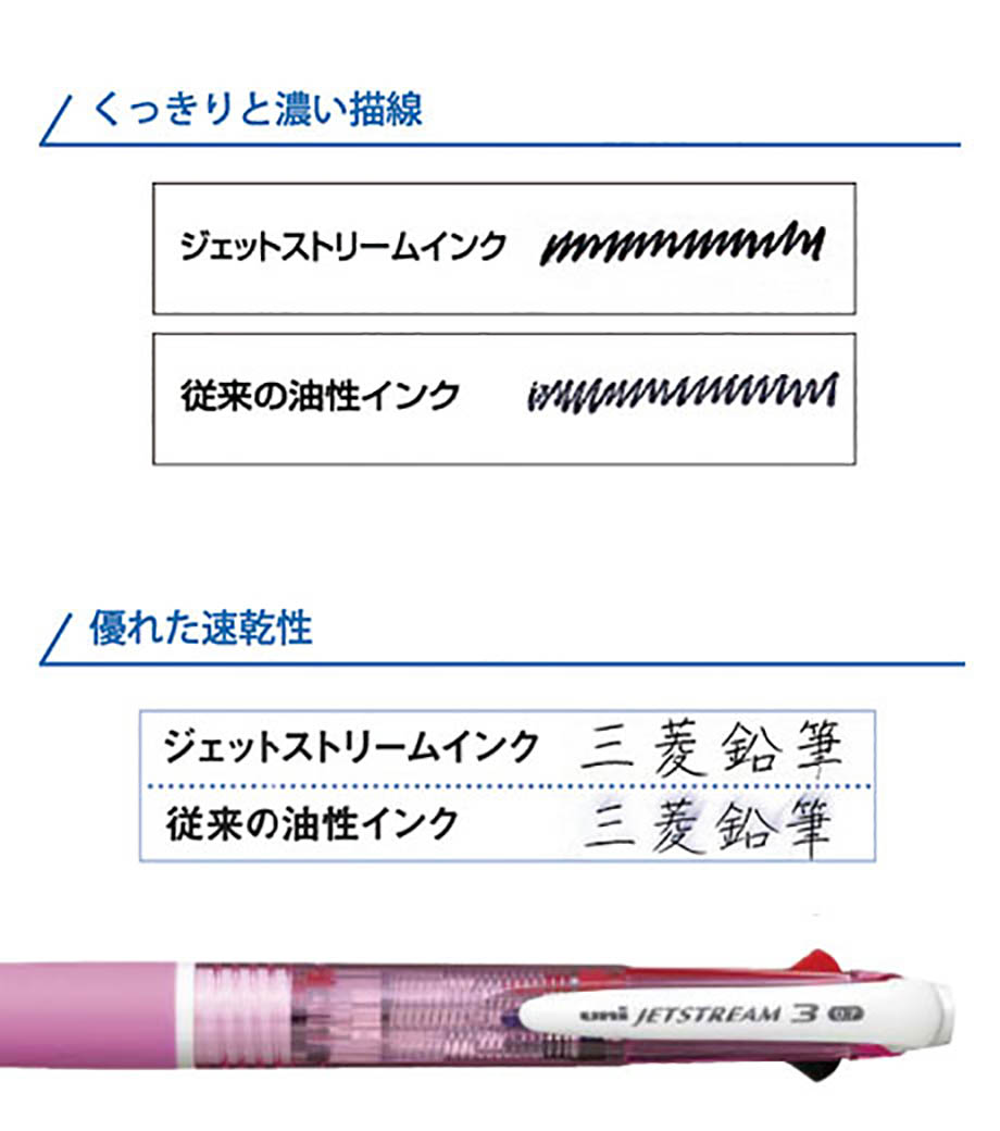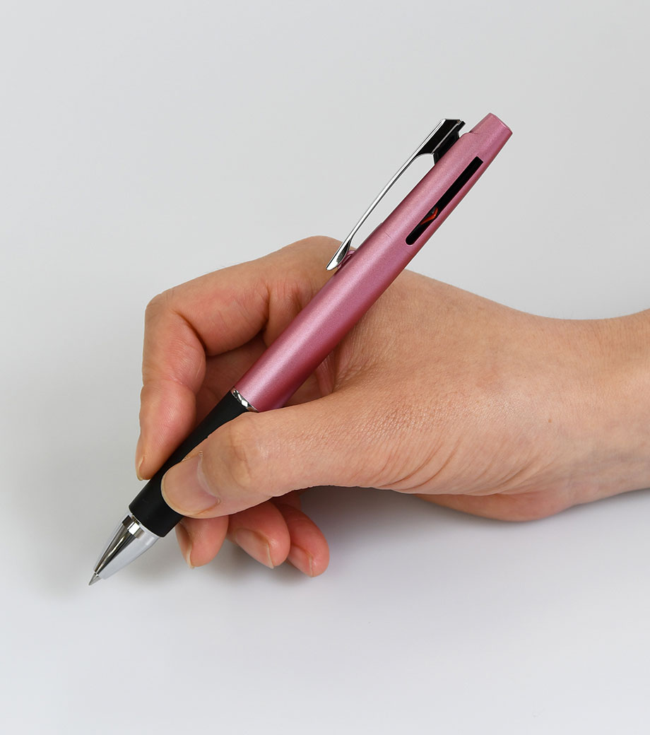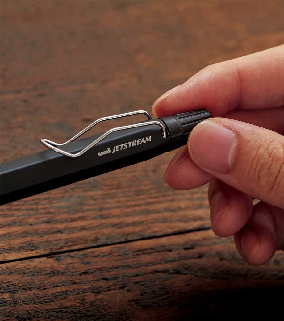 インクは“クセになる、なめらかな書き味。”でお馴染みのジェットストリームインクを使用。0.38mmのペン先で手帳などに使いやすく携帯しやすいスリムな軸。先軸と同色系のゴムグリップは軸全体で統一感があり、なんともお洒落な仕上がりです。