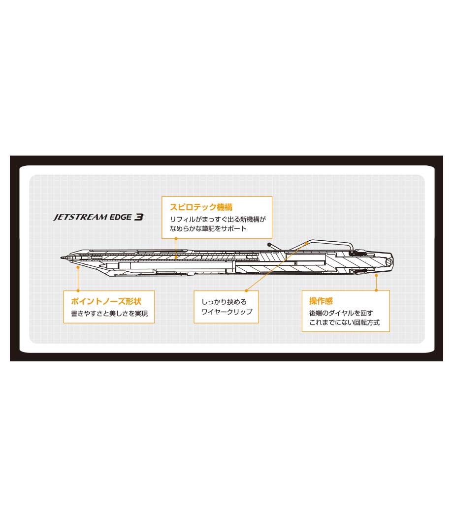 三菱鉛筆 ジェットストリーム エッジ 3 0.28mmは、世界初の超極細ボール径0.28mmの3色モデル。ペン先はアシンメトリーな見た目の「ポイントノーズ形状」を搭載。リフィルがまっすぐ出るので、単色ボールペンのような安定した筆記感が得られます。後端のダイヤルを回して芯を繰り出す「スピロテック機構」により、この独特な形状でもスムーズな芯の出し入れが可能に。ひと味違った多色ボールペンをお探しの方必見です。