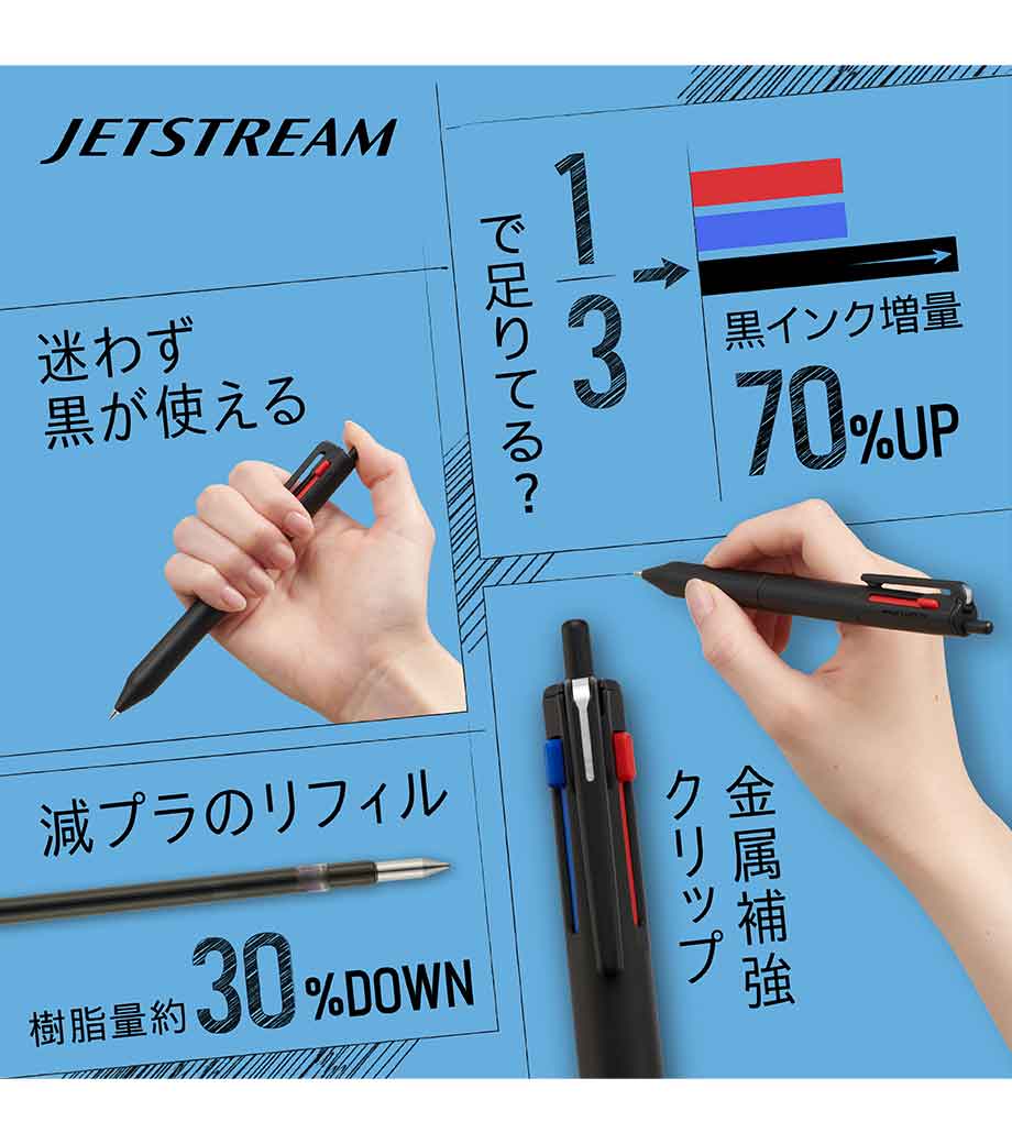 三菱鉛筆 ジェットストリーム 3色ボールペン 0.7mmは、単色ボールペンと多色ボールペンの構造が一体化。使用頻度が高い「黒」は後端をノックするだけでサッと繰り出せます。さらに黒インクは通常より70%増量の「長持ちリフィル」搭載。チューブの樹脂量を30%減らしているので、プラスチック削減にもつながります。