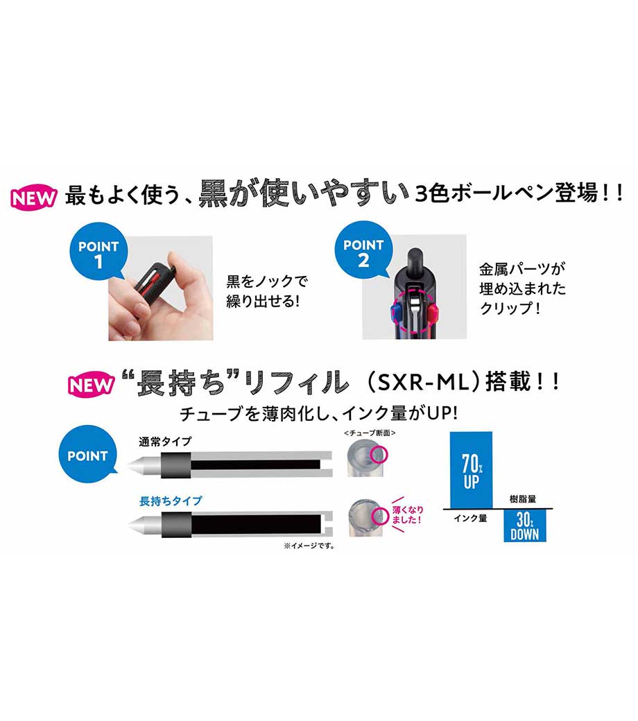 さらに黒インク70%増量の「長持ちリフィル」も搭載。チューブを薄くしてリフィルの樹脂量を30%減らし、インク量を増やしています。多色ボールペンでありがちな黒インクだけすぐ無くなる悩みを解消する優れもの。