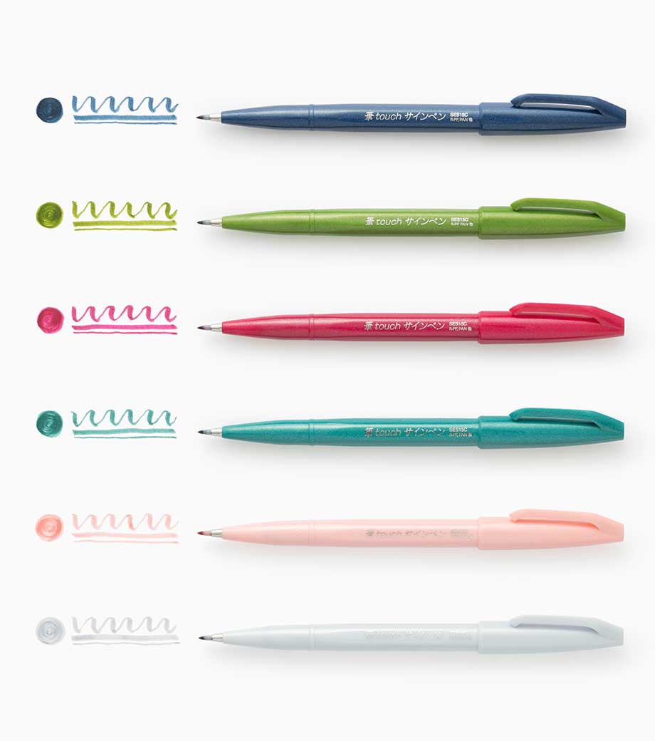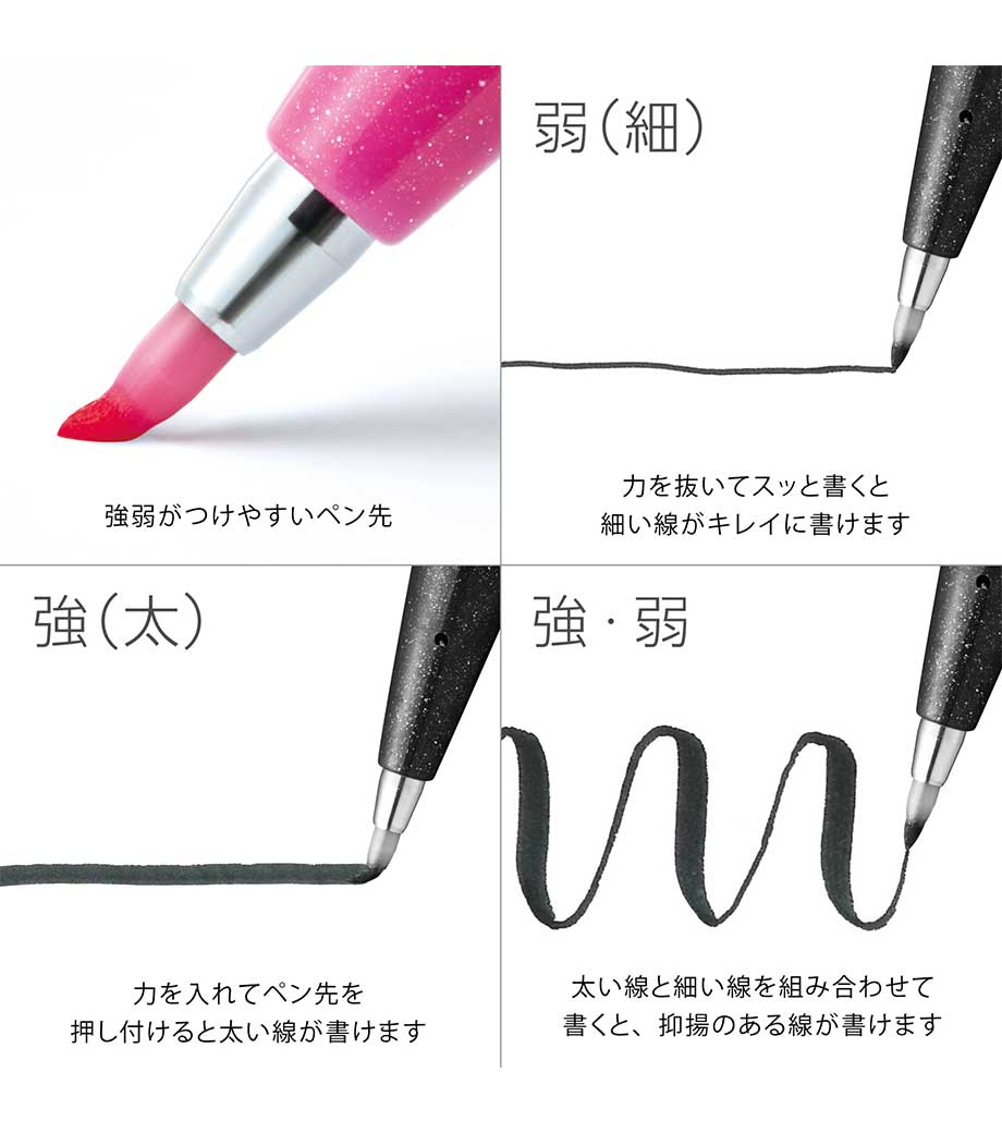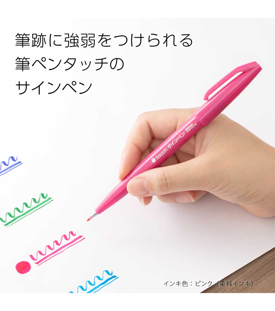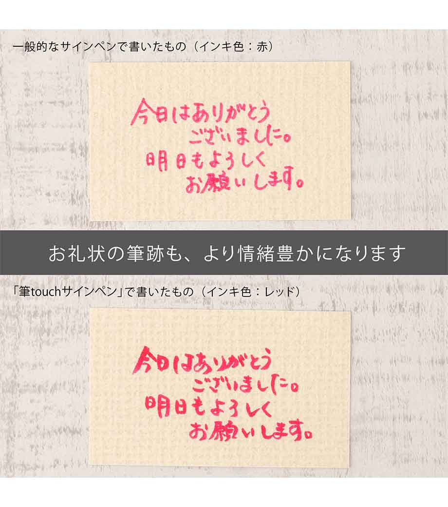 「筆タッチサインペン」は筆のタッチをサインペン感覚で手軽に楽しめるカラフルな水性ペン。しなやかで扱いやすい弾力のペン先で、カラーペンと同じ感覚で、メリハリのある筆タッチの文字、線が書けます。インクジェット用はがきにもきれいに書けて、優れた速乾性を発揮。なめらかでありながら、滑り過ぎない、心地よい運筆感をお試しください。