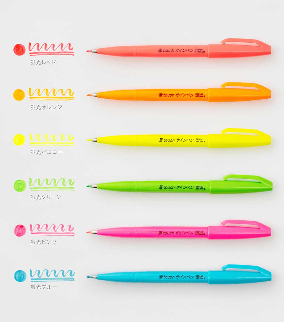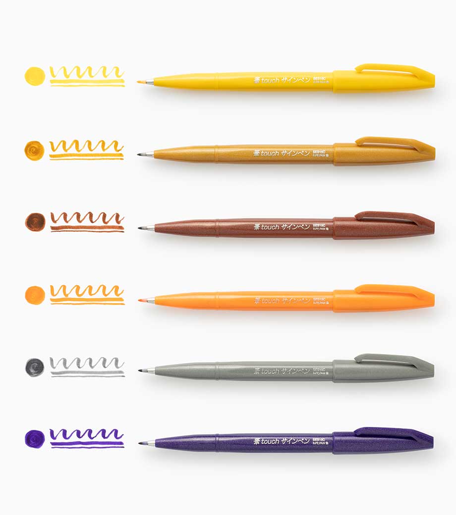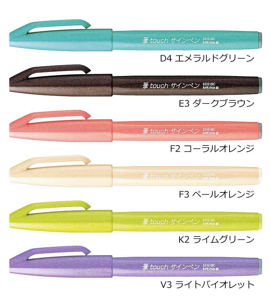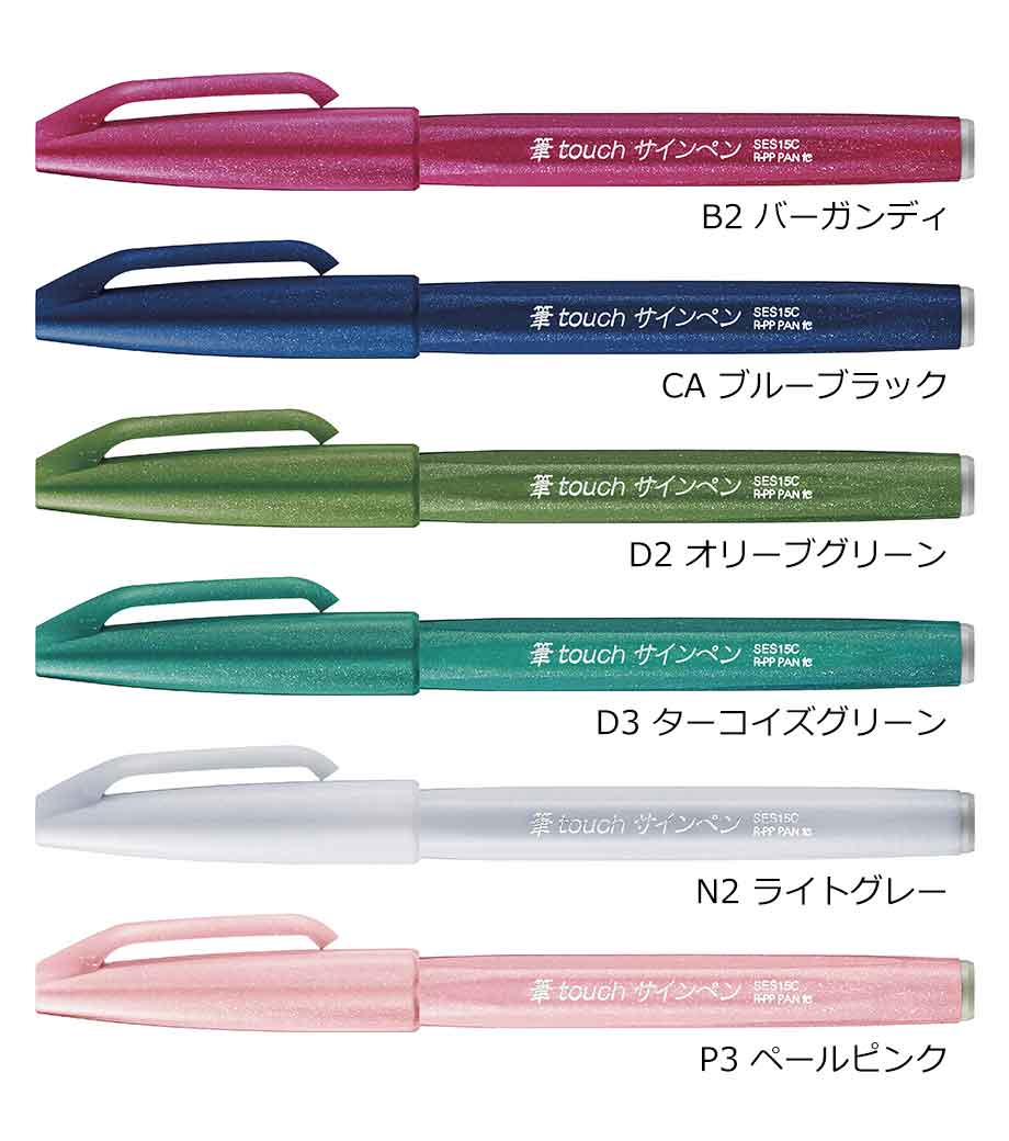 「筆タッチサインペン」は筆のタッチをサインペン感覚で手軽に楽しめるカラフルな水性ペン。しなやかで扱いやすい弾力のペン先で、カラーペンと同じ感覚で、メリハリのある筆タッチの文字、線が書けます。インクジェット用はがきにもきれいに書けて、優れた速乾性を発揮。なめらかでありながら、滑り過ぎない、心地よい運筆感をお試しください。
