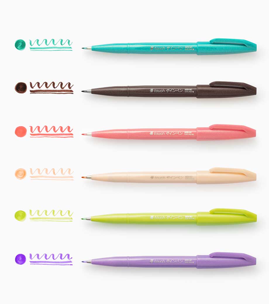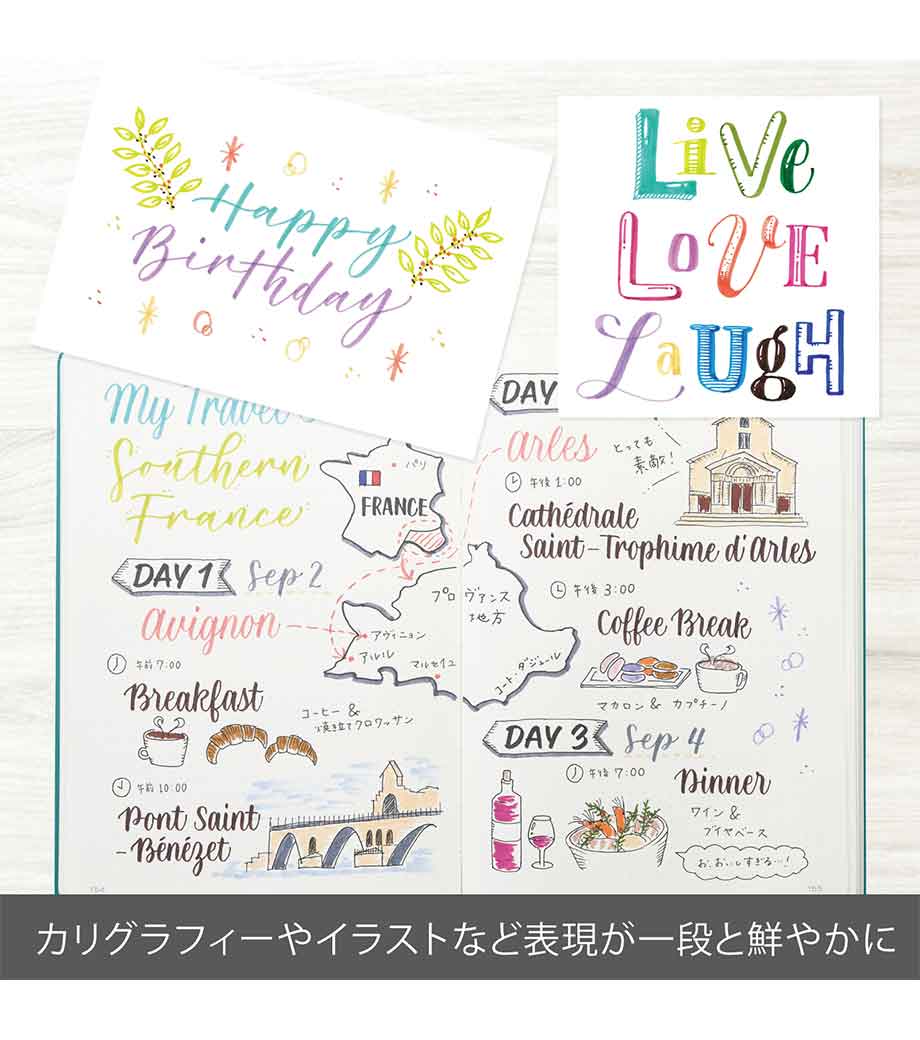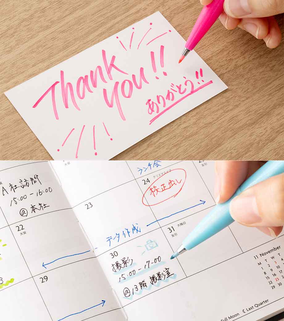 ゼブラ マイルドライナーブラッシュは、柔らかな書き心地の筆ペンと細めのラインが引けるペン先が一体になったマーカーペン。手帳やノートにイラストを描いたり、色を塗ったりするのに適しています。目に優しいおしゃれなカラーで全15色。重ねて塗れば濃淡や混色の表現ができ、手描きデコレーションの幅が広がりますよ。