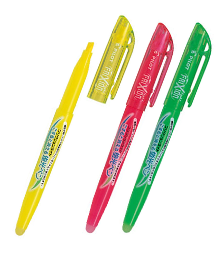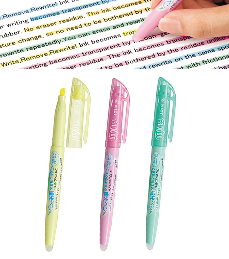 パイロット フリクションライト 3色セットは、新開発の「蛍光フリクションインキ」を搭載した、パイロットのフリクションシリーズの蛍光ペン。摩擦熱で筆跡を消去するので消しカスが出ず、鉛筆やシャープペンシルの消し跡と比べて消し残りが非常に少ないのも特長です。