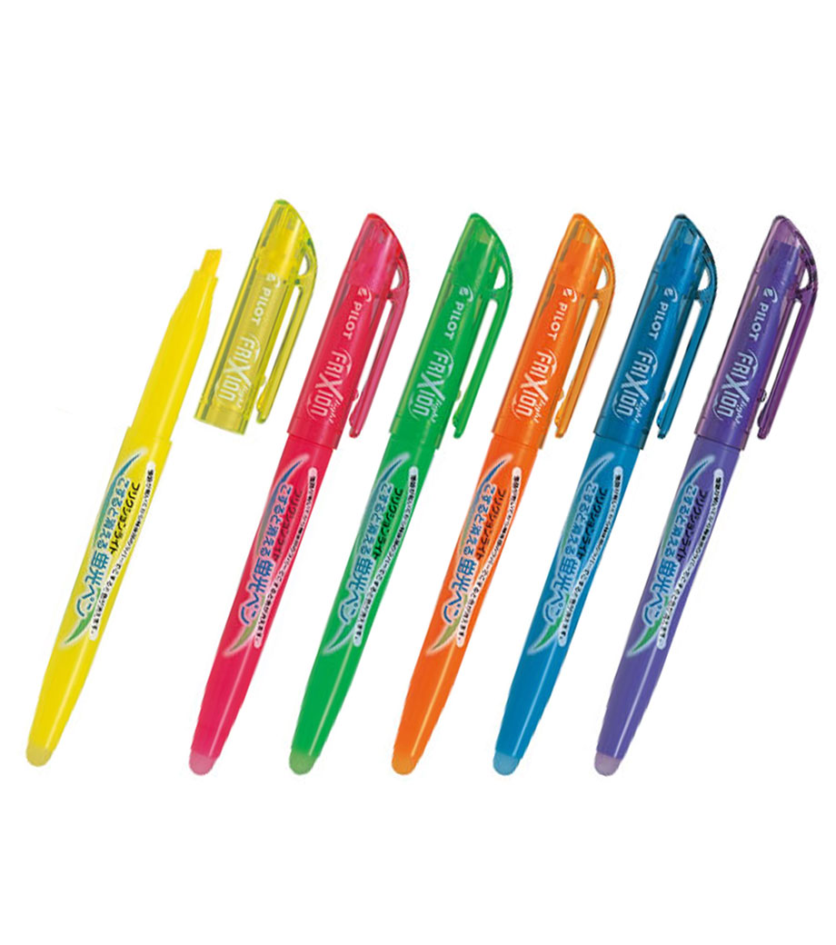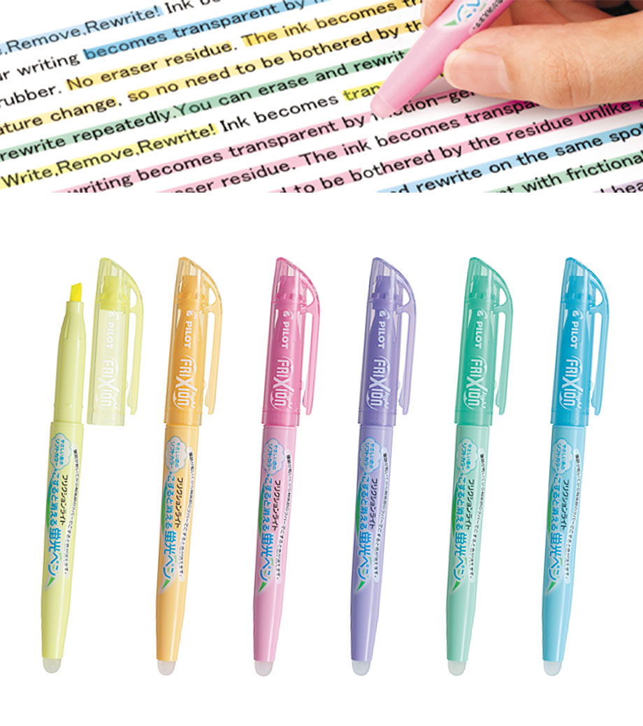 パイロット フリクションライト 6色セットは、新開発の「蛍光フリクションインキ」を搭載した、パイロットのフリクションシリーズの蛍光ペン。摩擦熱で筆跡を消去するので消しカスが出ず、鉛筆やシャープペンシルの消し跡と比べて消し残りが非常に少ないのも特長です。