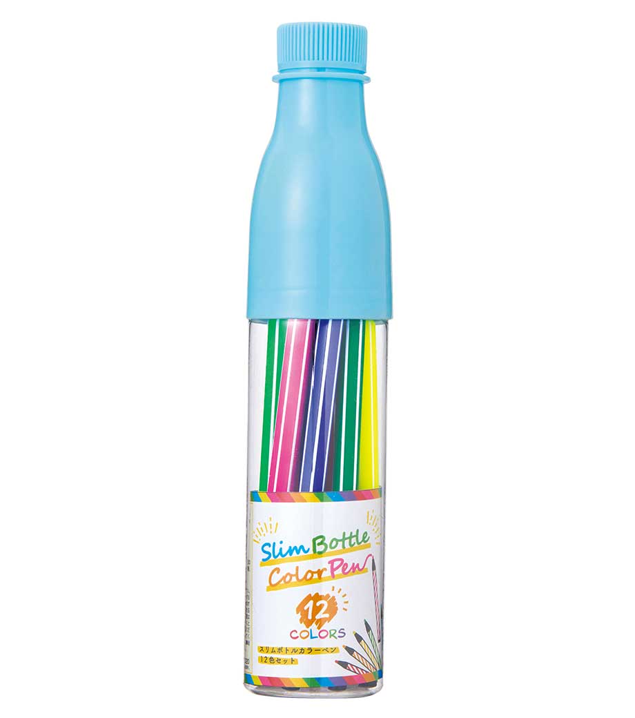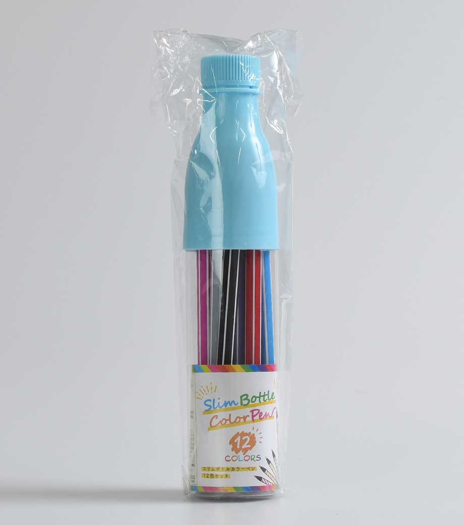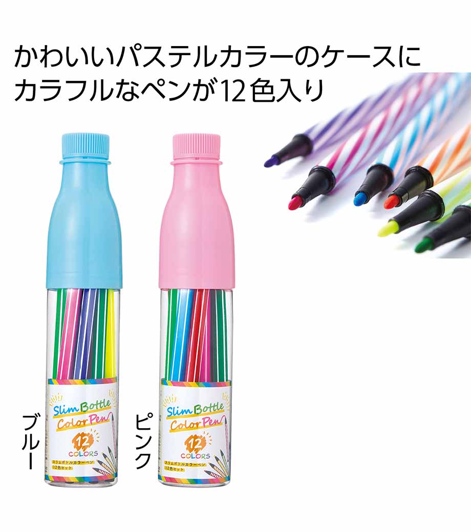 ポップな見た目が可愛いボトル入り。お絵描きが楽しくなる12色のカラーペンセット。配布しやすいスリムサイズで、お子さま向けイベントのノベルティにおすすめです。