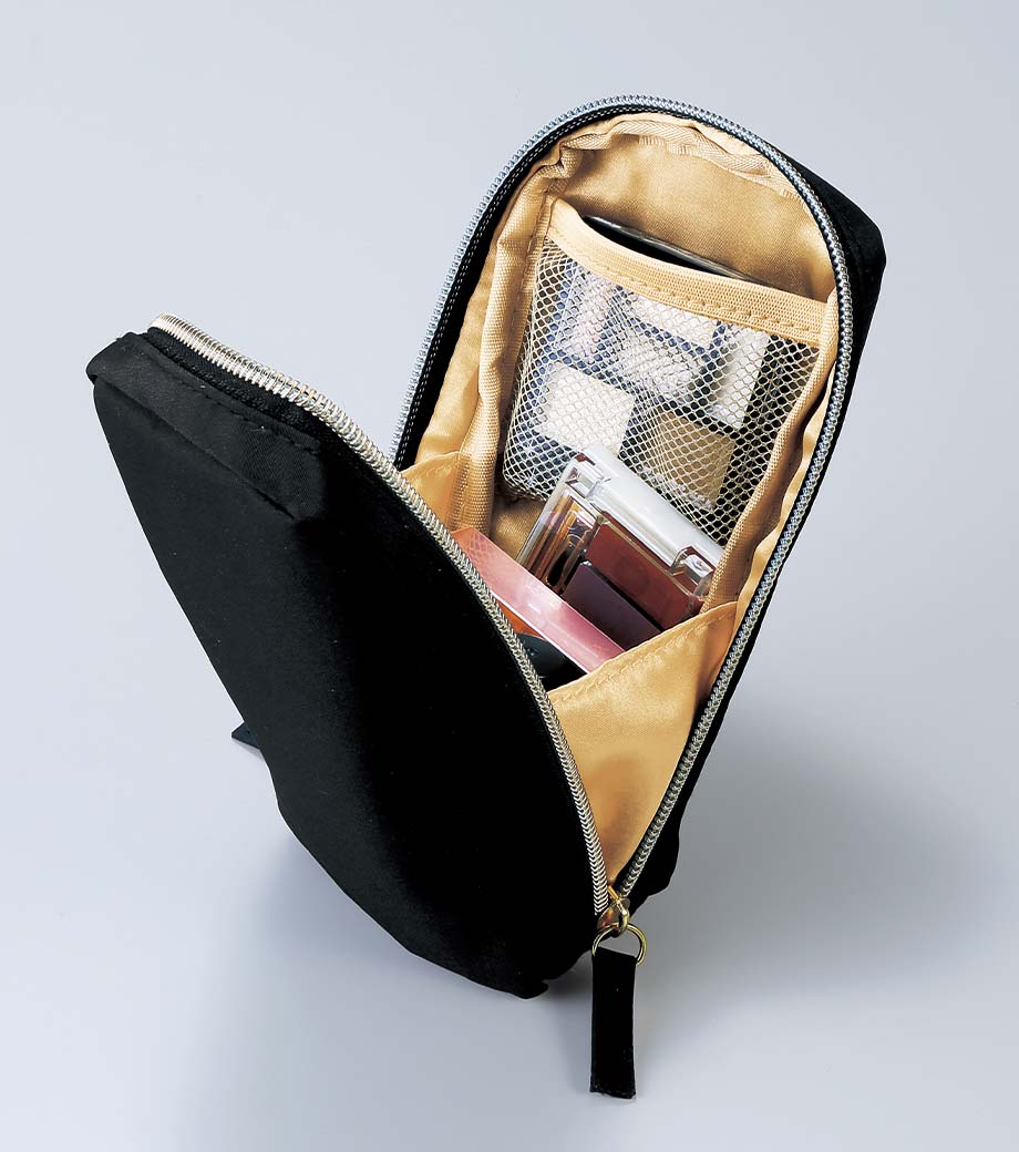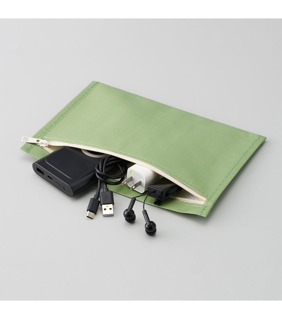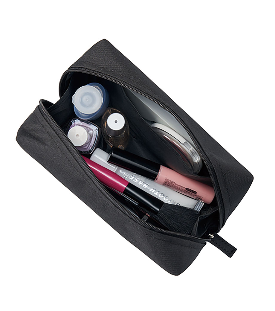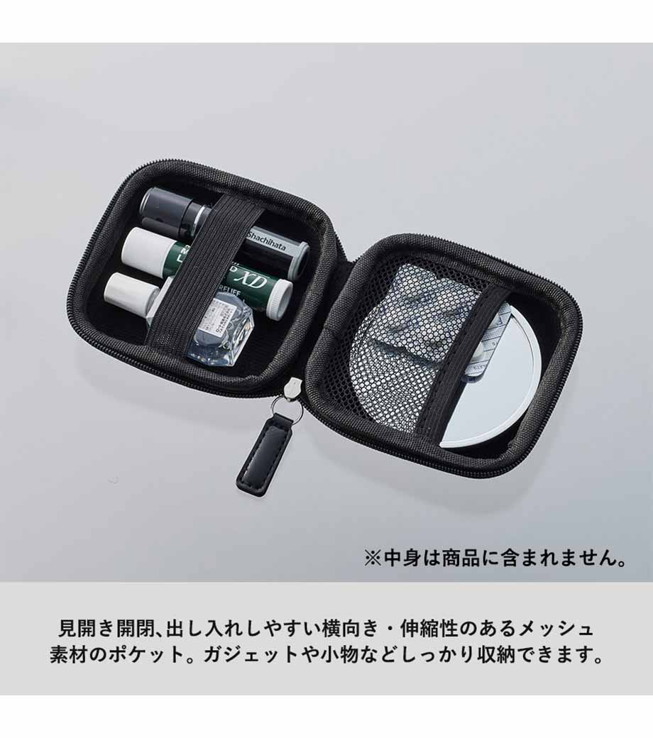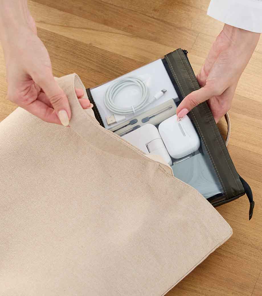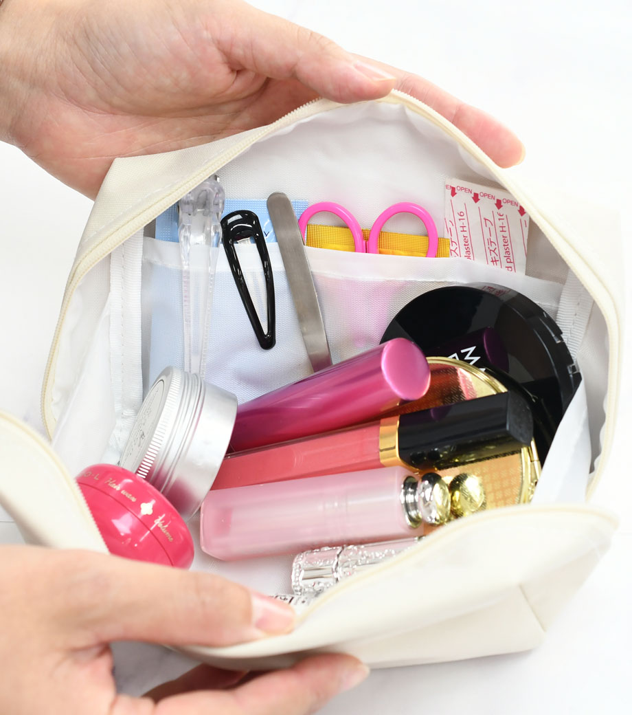すっきり収納マルチポーチは、バッグの中で場所を取らない薄型でシンプルなデザイン。内側左はペンやコスメの分別にピッタリのゴムバンド、右は通帳サイズのポケットと中身が見えるメッシュポケット付きです。三面ファスナーでパカッと開き何が入っているか一目瞭然。イヤホンやSDカードのような小物もすぐ見つかります。ガジェットポーチや化粧ポーチなどアイデア次第で使い方が広がります。