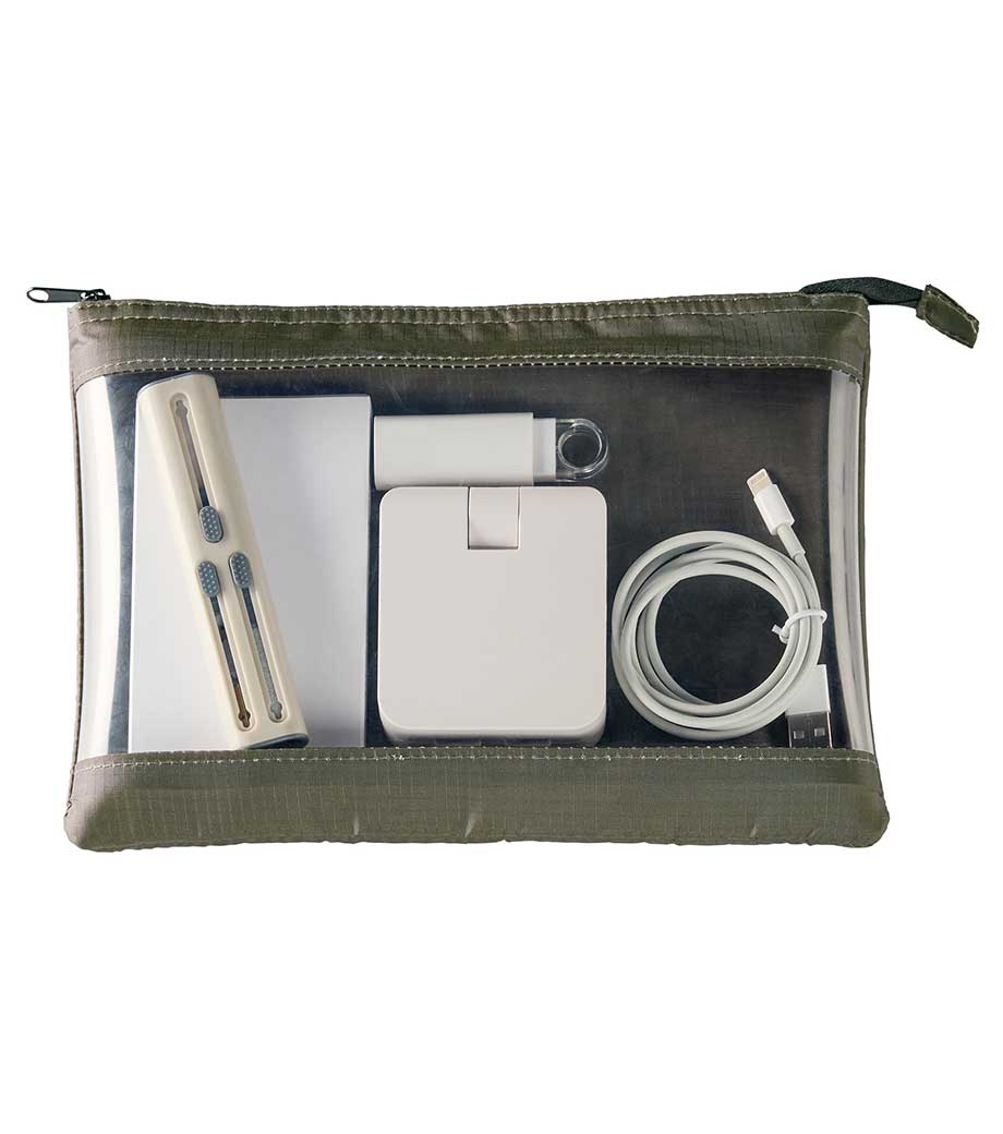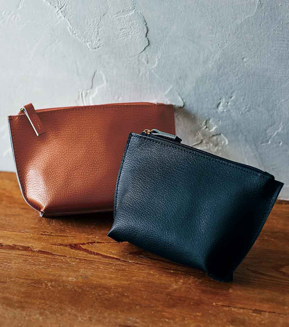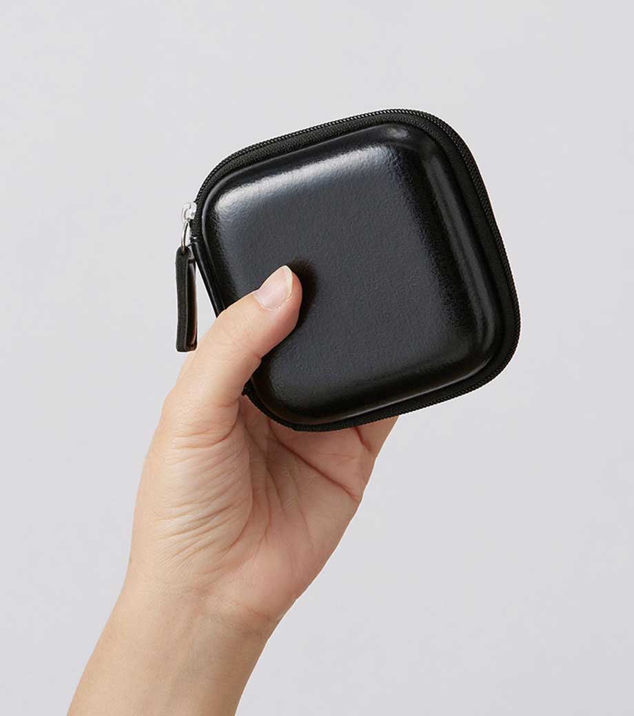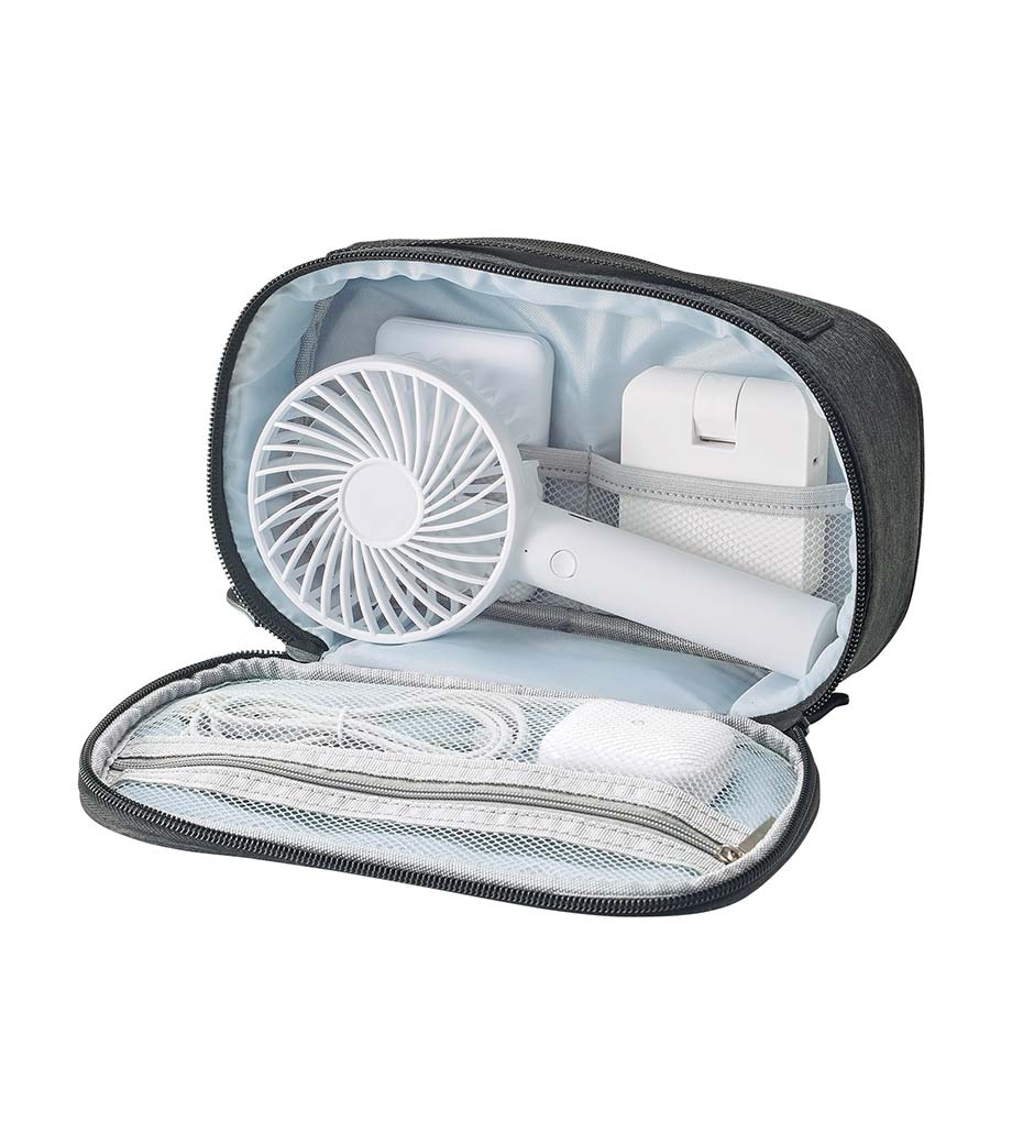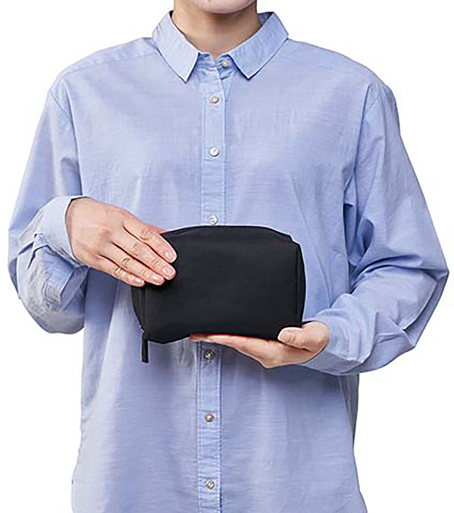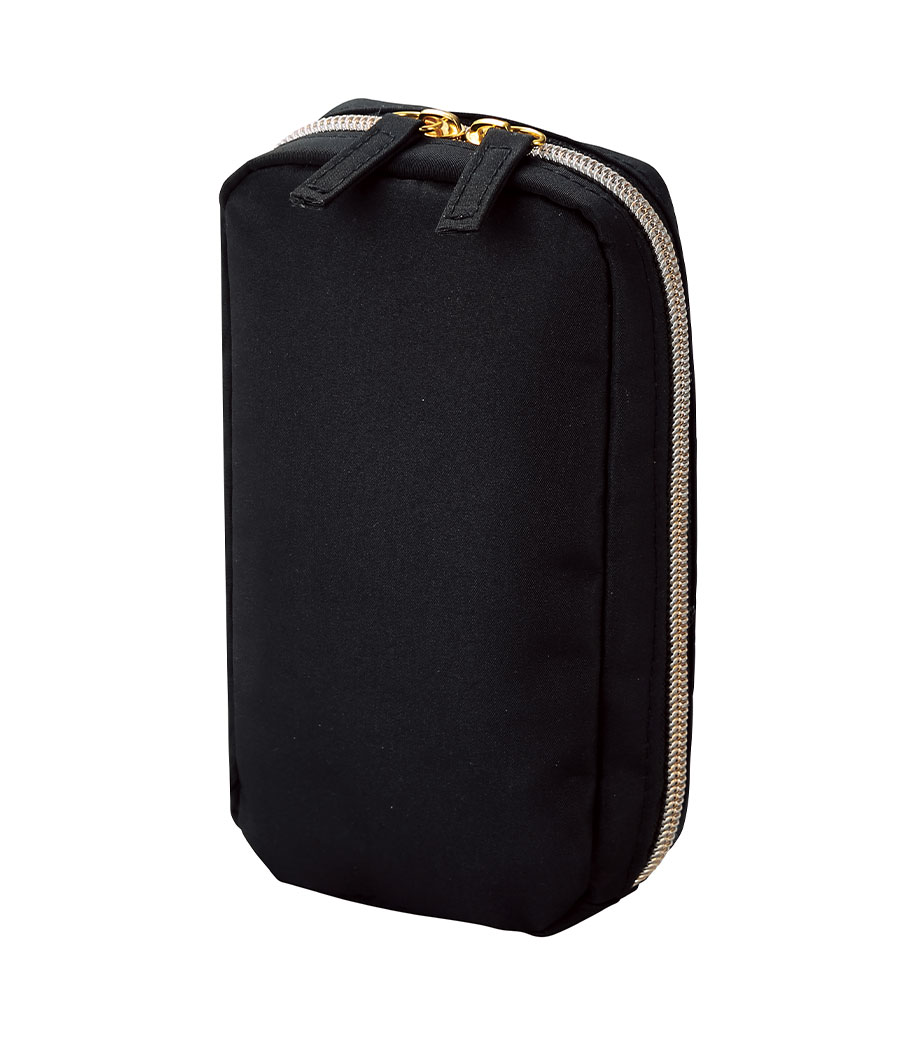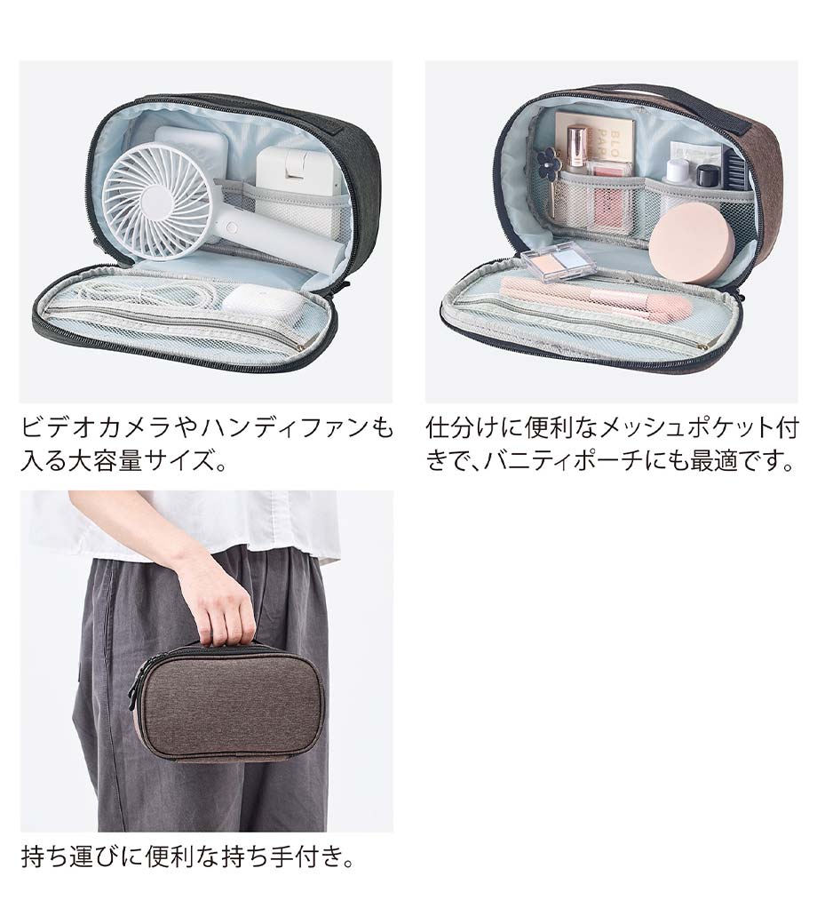 すっきり収納マルチポーチは、バッグの中で場所を取らない薄型でシンプルなデザイン。内側左はペンやコスメの分別にピッタリのゴムバンド、右は通帳サイズのポケットと中身が見えるメッシュポケット付きです。三面ファスナーでパカッと開き何が入っているか一目瞭然。イヤホンやSDカードのような小物もすぐ見つかります。ガジェットポーチや化粧ポーチなどアイデア次第で使い方が広がります。