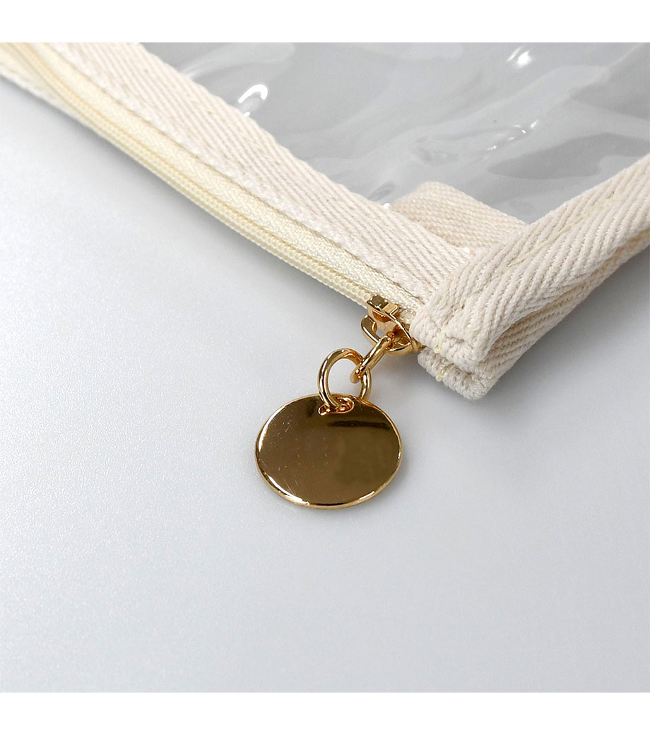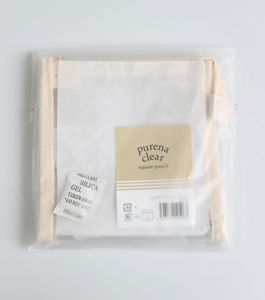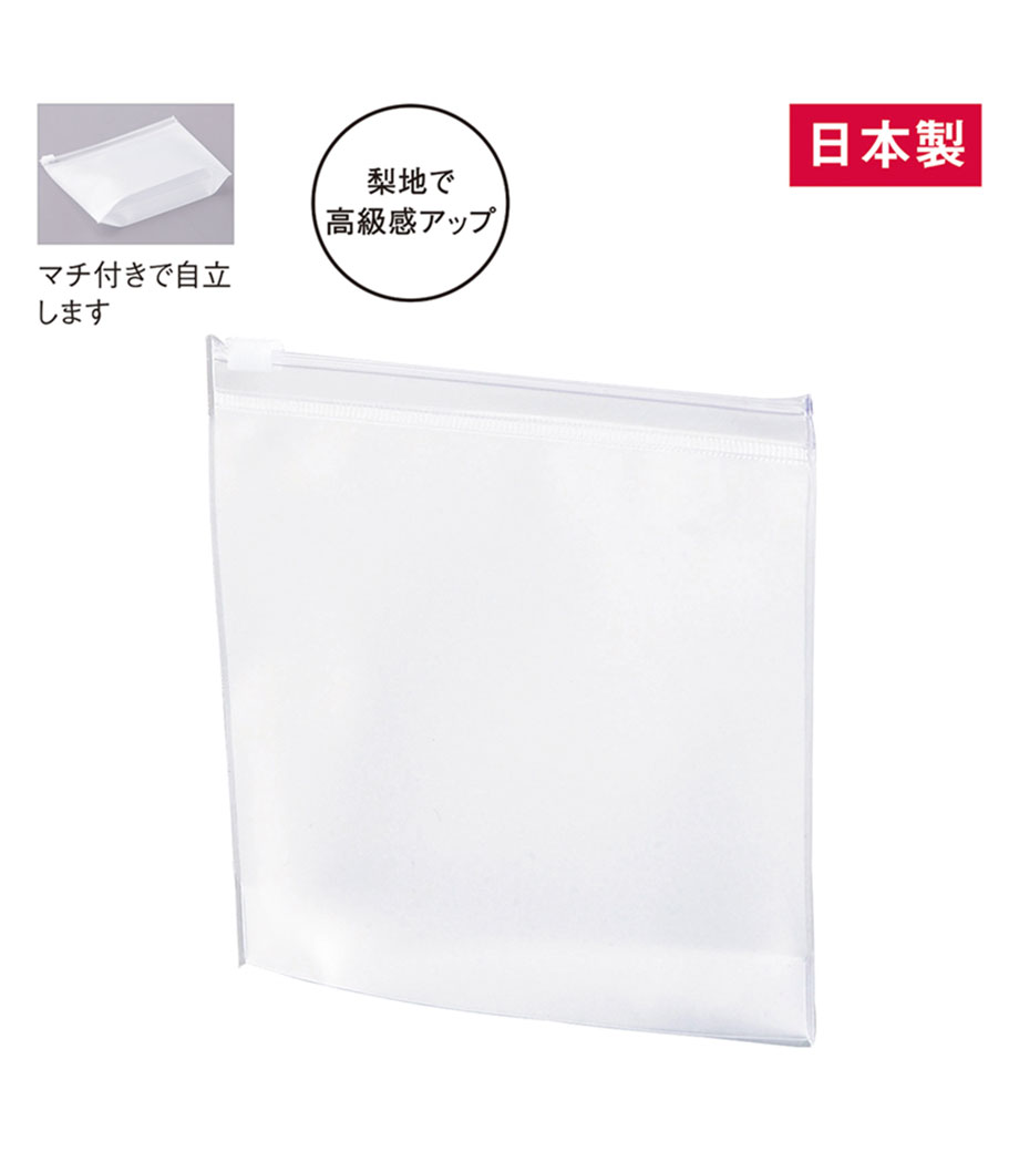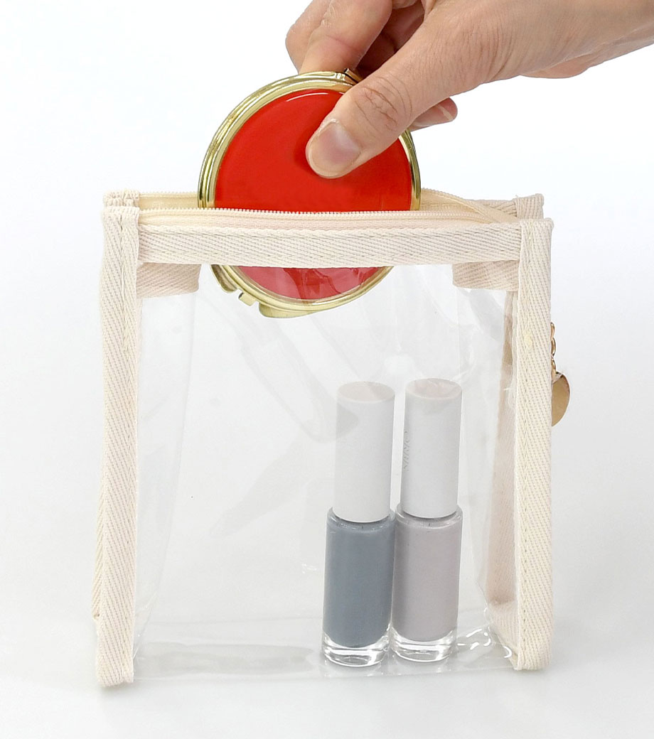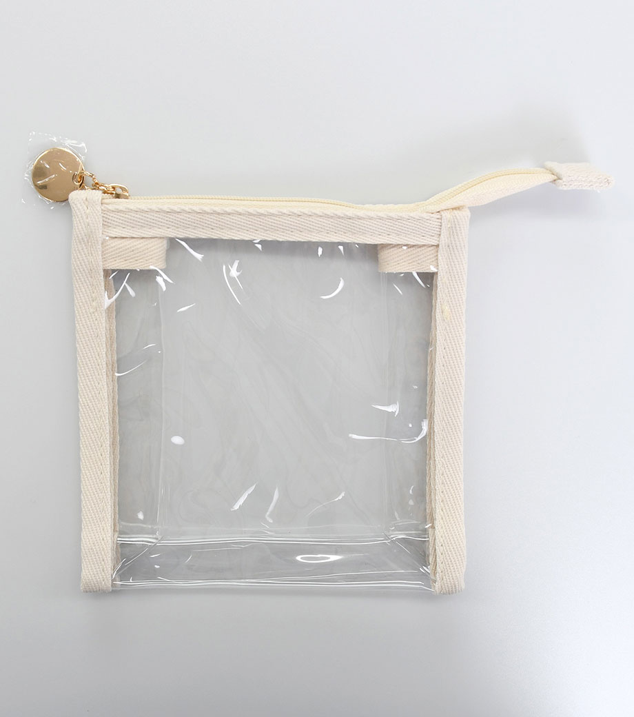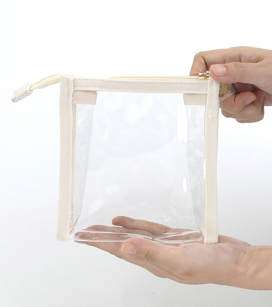 カラーファスナーがアクセントのスクエア型ビニールポーチ。四つ折りしたミニタオルが収まるサイズ感です。中身が一目でわかるのでアクセサリーや日用品の仕分けポーチに大人気。水に強いPVC素材で、アメニティ入れとしても使えます。