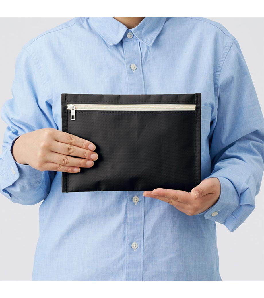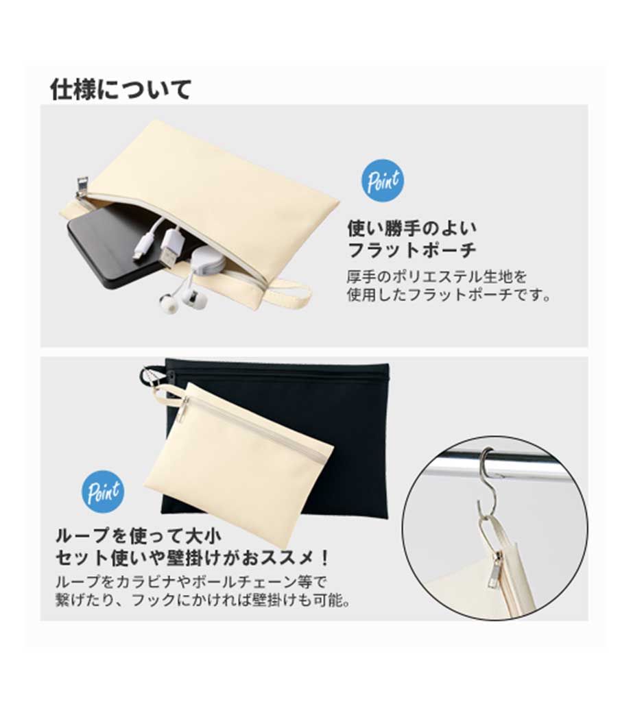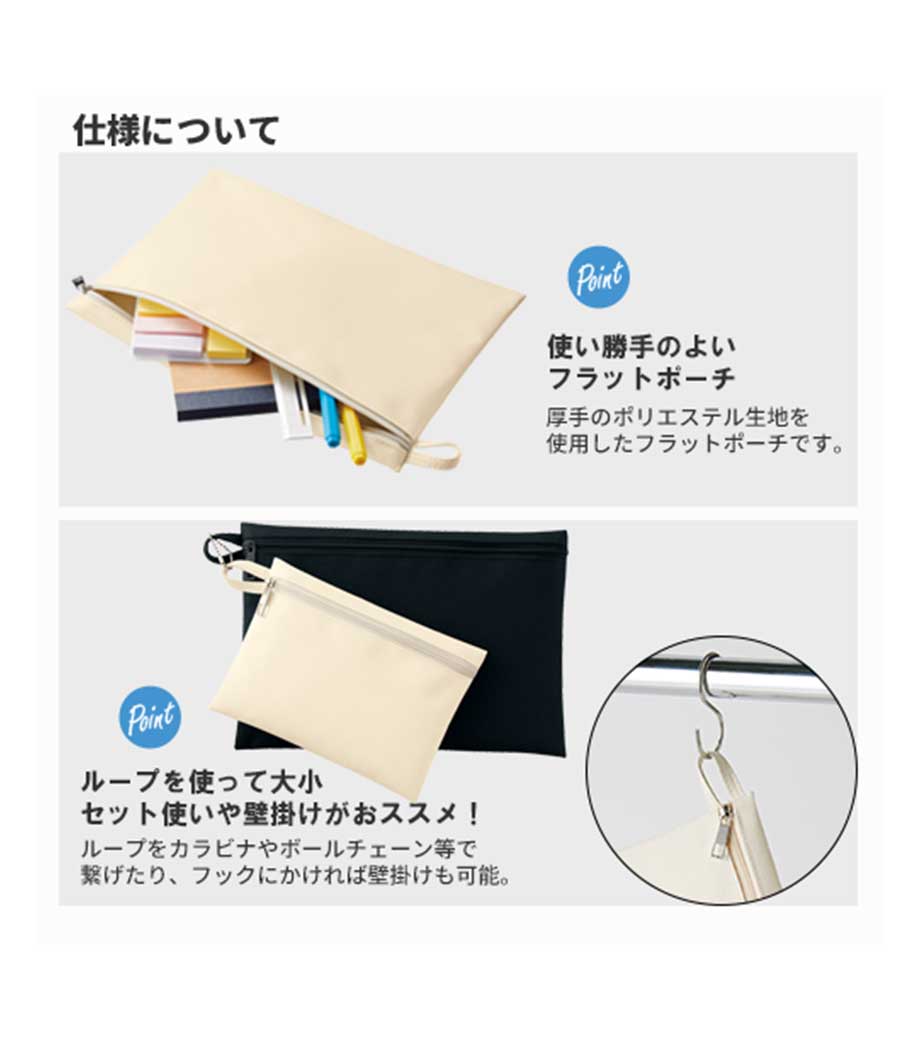 マチがない薄型なのでバッグに入れてもかさばりません。厚手のポリエステル素材でとっても丈夫!ループ付きなのでファスナーも開けやすく、壁掛けもできちゃいます。シンプルなデザインで男女問わず使えます。