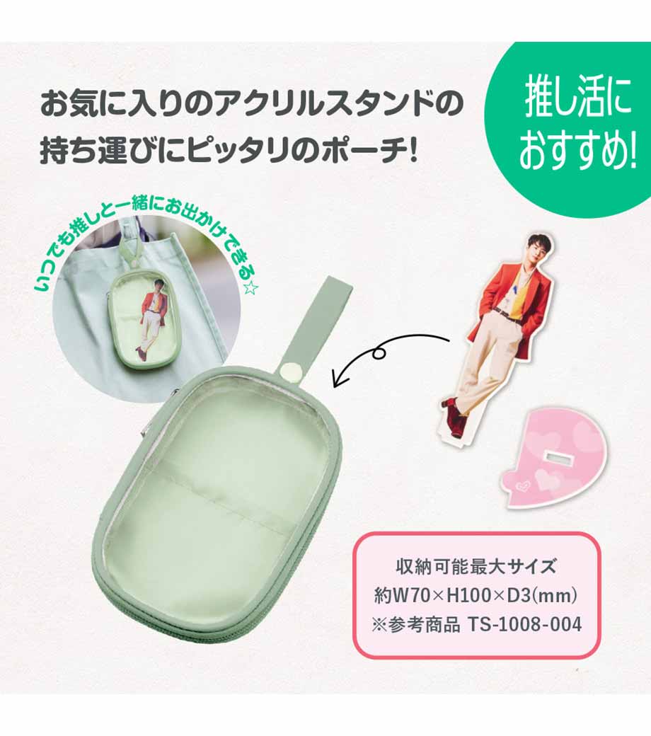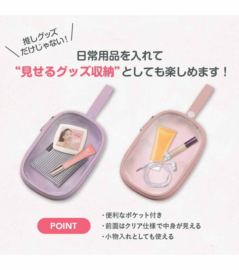 推しのグッズを可愛く持ち歩ける、カラフルなビニール素材のミニポーチ。内側には標準サイズのトレカが入るメッシュポケット付き。お気に入りのコレクションを入れて、自分だけのデコレーションを楽しめます。カラビナ付きだからバッグやベルトに簡単に取り付けられて便利。豊富な色展開で、キャラクターのイメージカラーに合わせてお選びいただけます。
