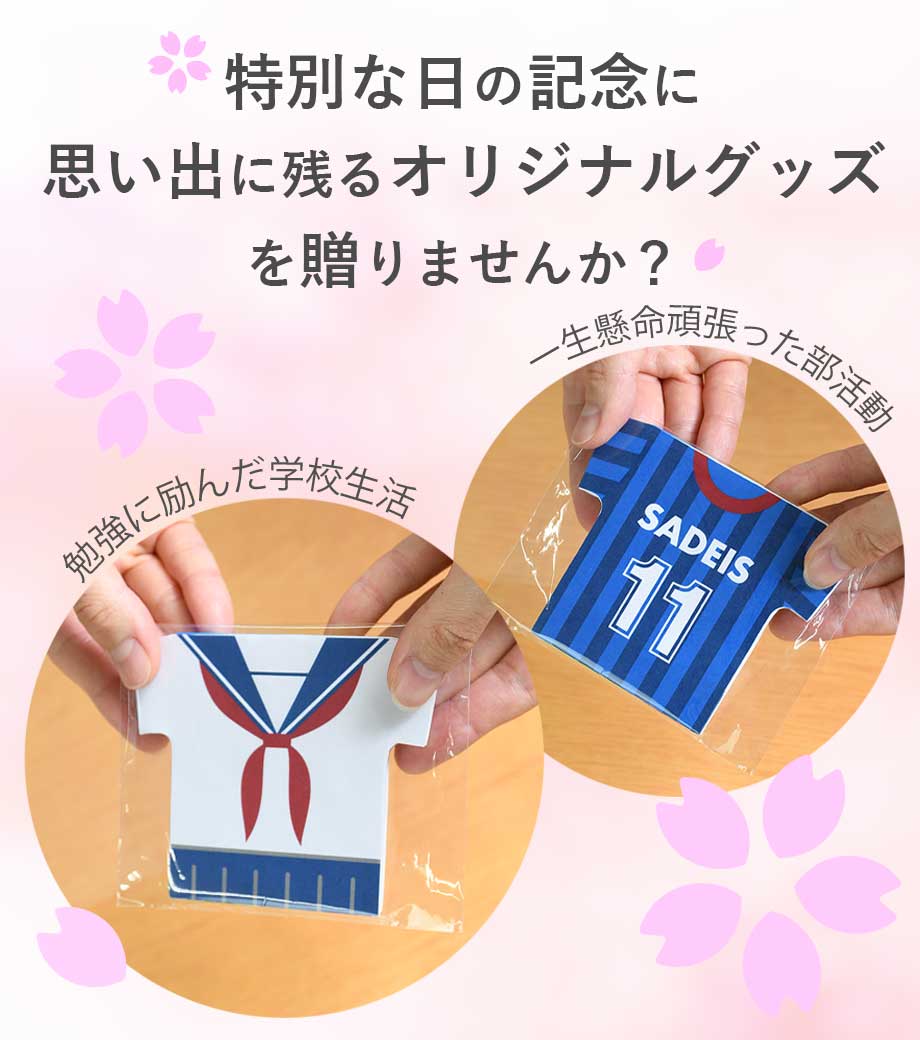 オープンキャンパス・入学・入園の記念品はもちろん、職場のユニフォームを再現した社内ノベルティや、退職・異動の記念品にもおすすめです。卒業生・卒団生への贈り物としてもご好評いただいています。
