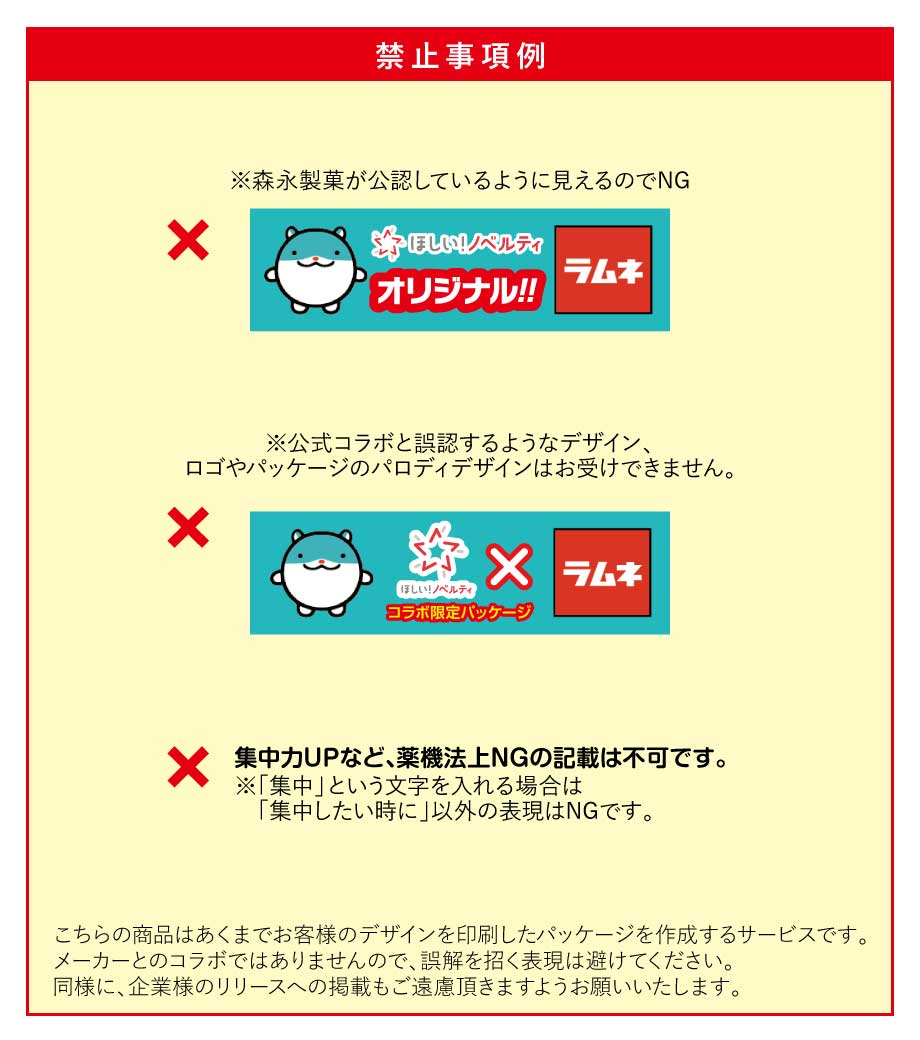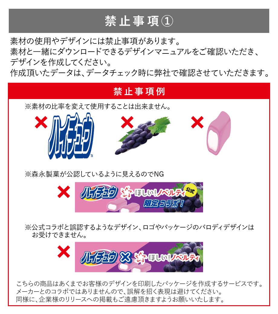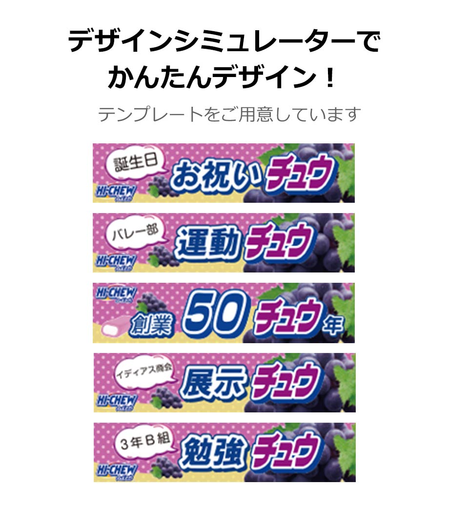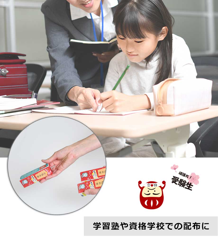 パッケージはフルカラー印刷が可能。各種素材やテンプレートがあるので、デザインが苦手な方も安心です。有名メーカーのお菓子ノベルティは印象に残りやすく、手に取ってもらいやすいのが特長。イベントや、塾・資格学校での配布にいかがでしょうか。