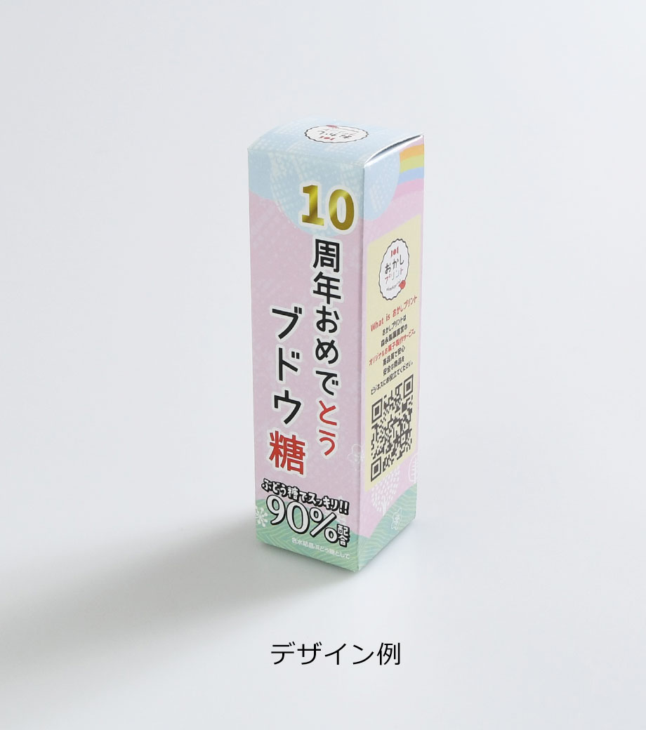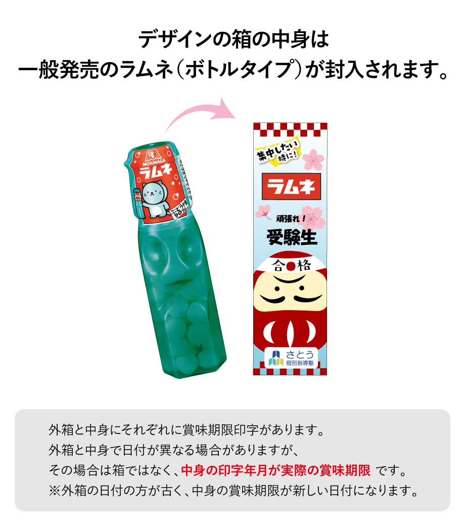 身近なおやつの定番として50年以上愛され続けている森永製菓のラムネ。おなじみの緑のボトルをオリジナルデザインの箱に入れたノベルティが作成できます。ぶどう糖90%配合でさわやかな甘さのラムネは、おやつとしてだけでなく仕事や勉強のリフレッシュにもぴったりです。