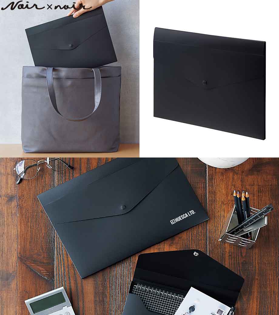 リヒトラブ Noir×noir エンベロープケース(A4)は、日本で初めてカラーファイルを発売したLIHIT LAB.の“黒だけ”シリーズのホルダーです。「プラスチックと、ともに暮らす。」をコンセプトに、プラスチックのシートから製品を作る過程で出てしまう端材を集め、新しいシートに生まれ変わったeco商品です。ノートや書類を折らずに持ち運べる厚みのあるPP製ケース。様々なシーンに馴染みやすい黒のマット仕上げで、表面は傷や指紋が目立ちにくいのが特長です。A4サイズのクリヤーホルダーごと入ります。コピー用紙は約100枚収納可能。ホックボタンで留められ、スマートに持ち運べます。