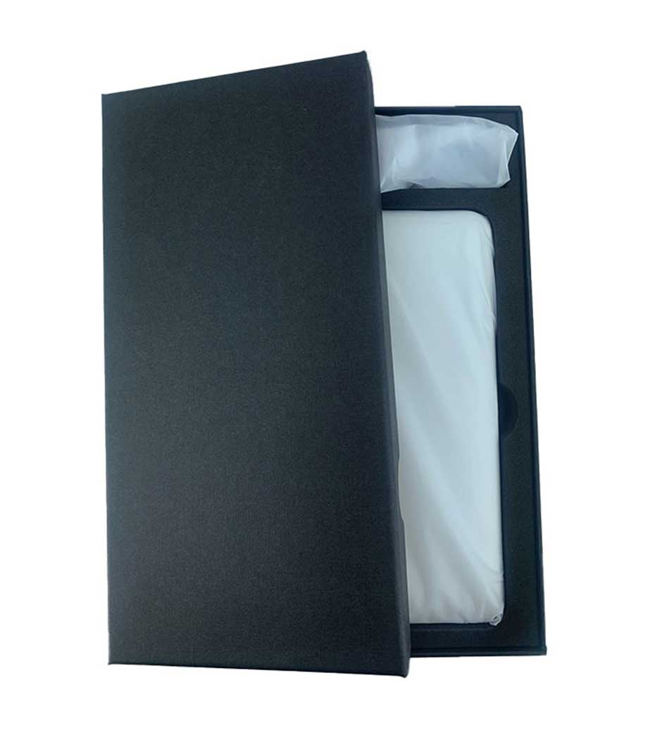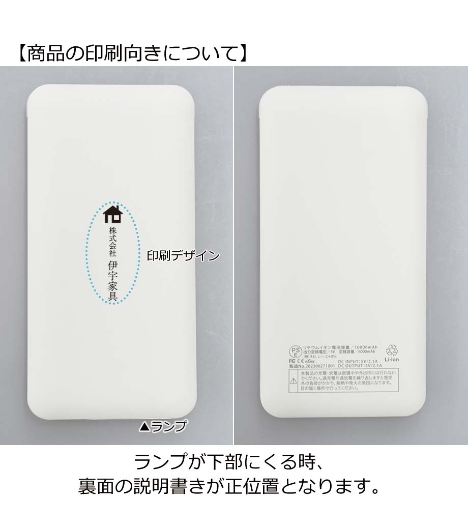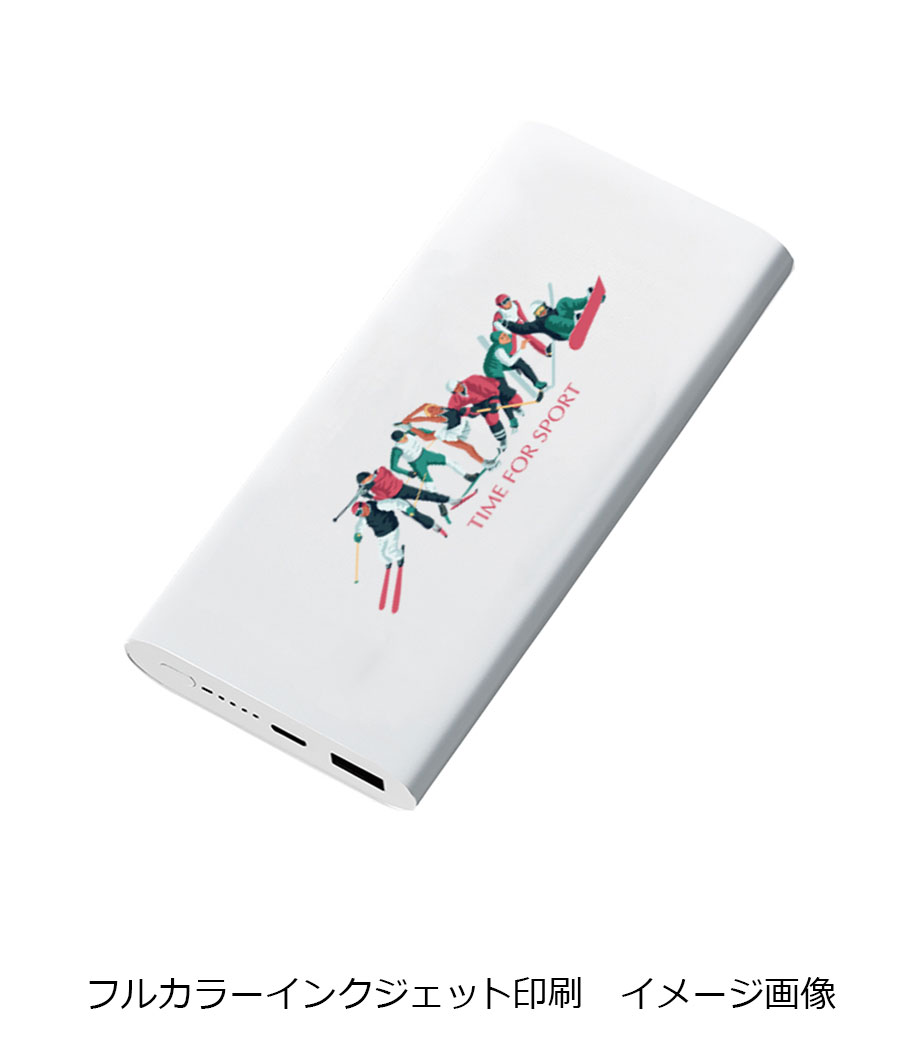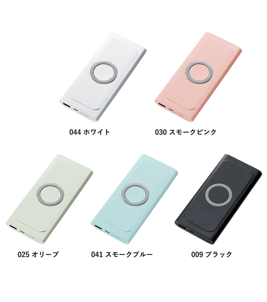 定番カラーとくすみカラーの全5色展開。裏面にはフルカラーで大きく名入れが可能です。防災アイテムとしても注目されているモバイルバッテリーは、ノベルティや記念品に喜ばれるアイテムですよ。