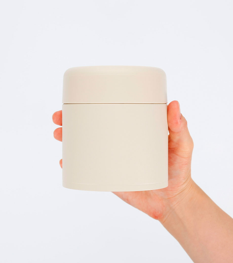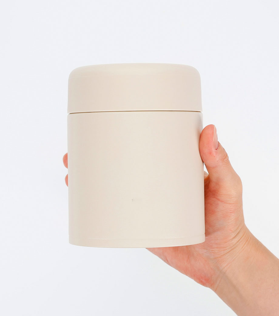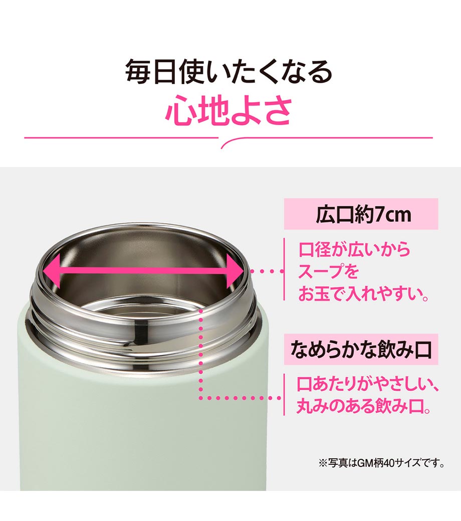 飲み頃温度を長時間キープできる真空二重構造です。広口でコップのような心地よい飲みやすさが魅力。蓋は持ち運びに便利なハンドル付きで、密閉しやすいスクリュー形状です。表面は少しザラっとしたマットな質感で、ニュアンスカラーがおしゃれ。