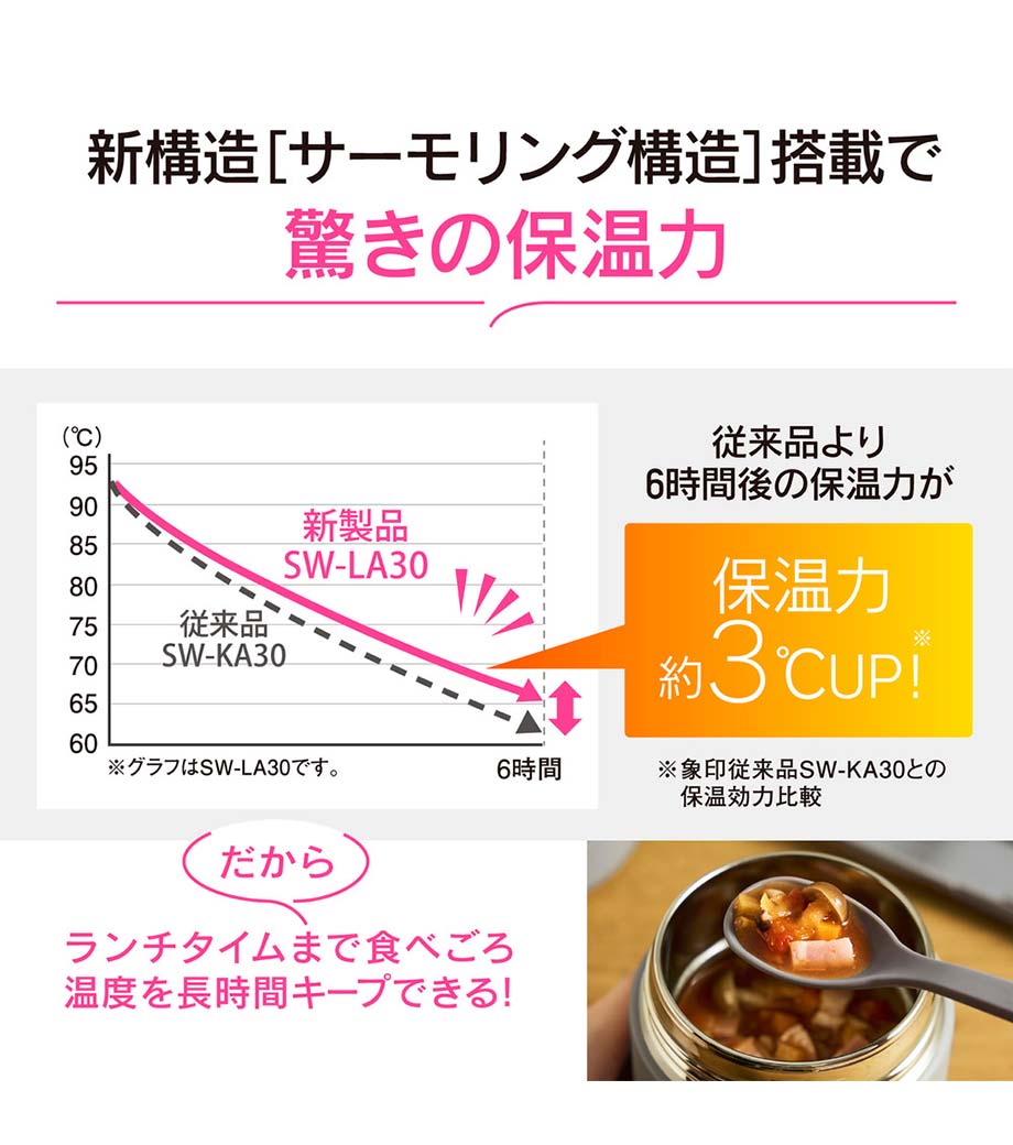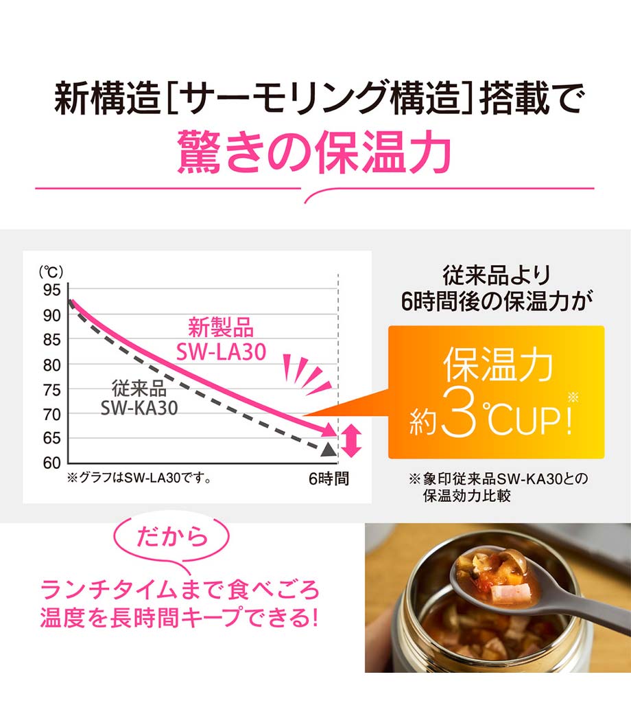 いつものお弁当タイムが楽しみになるスープジャー。軽量で持ち運びもラクラク!小ぶりな円柱形状は手にフィットし、フタはすべりにくく開けやすい設計です。真空断熱構造により保温・保冷効果が高く、おいしい温度をしっかりキープ。