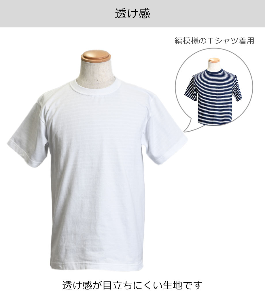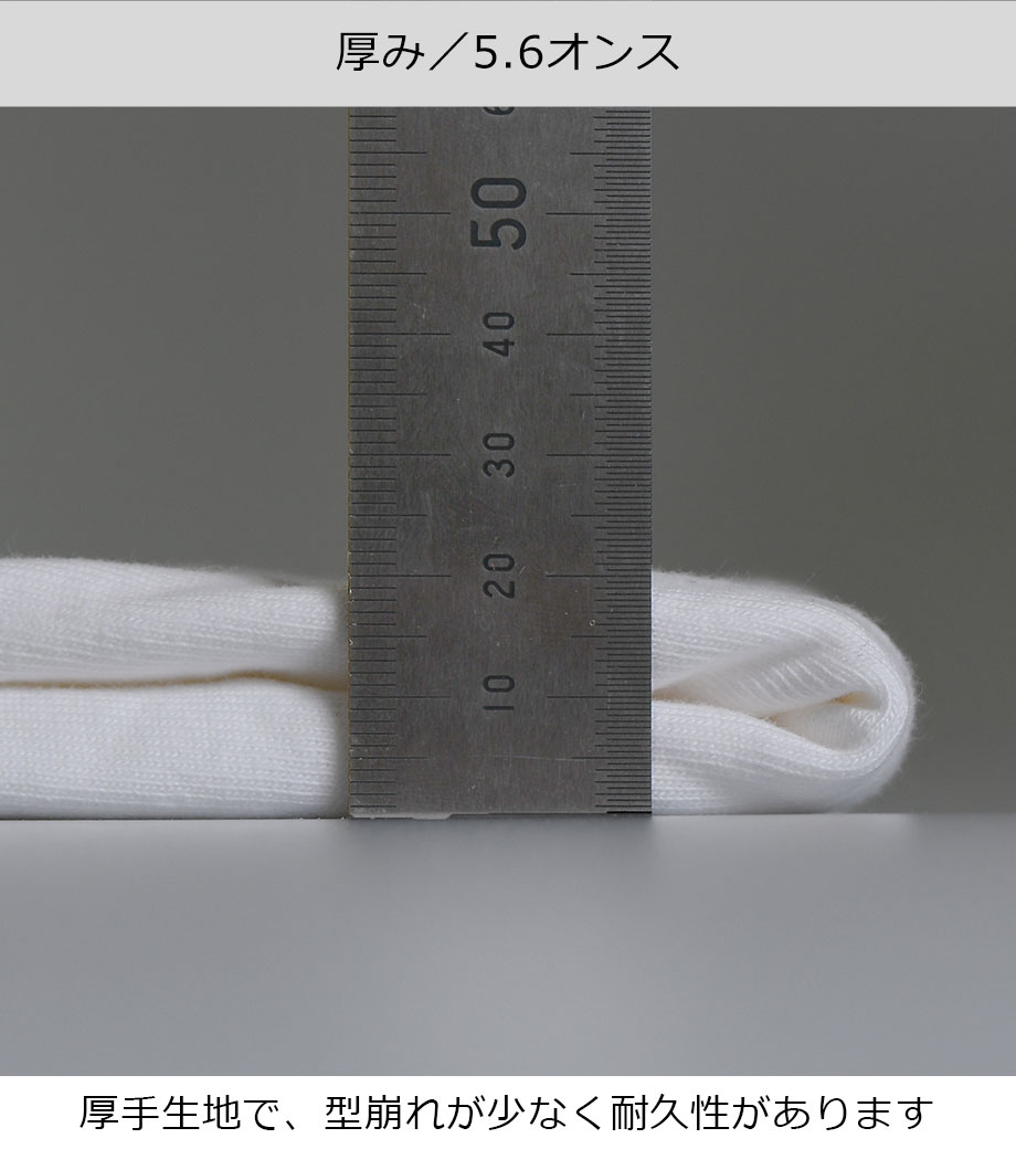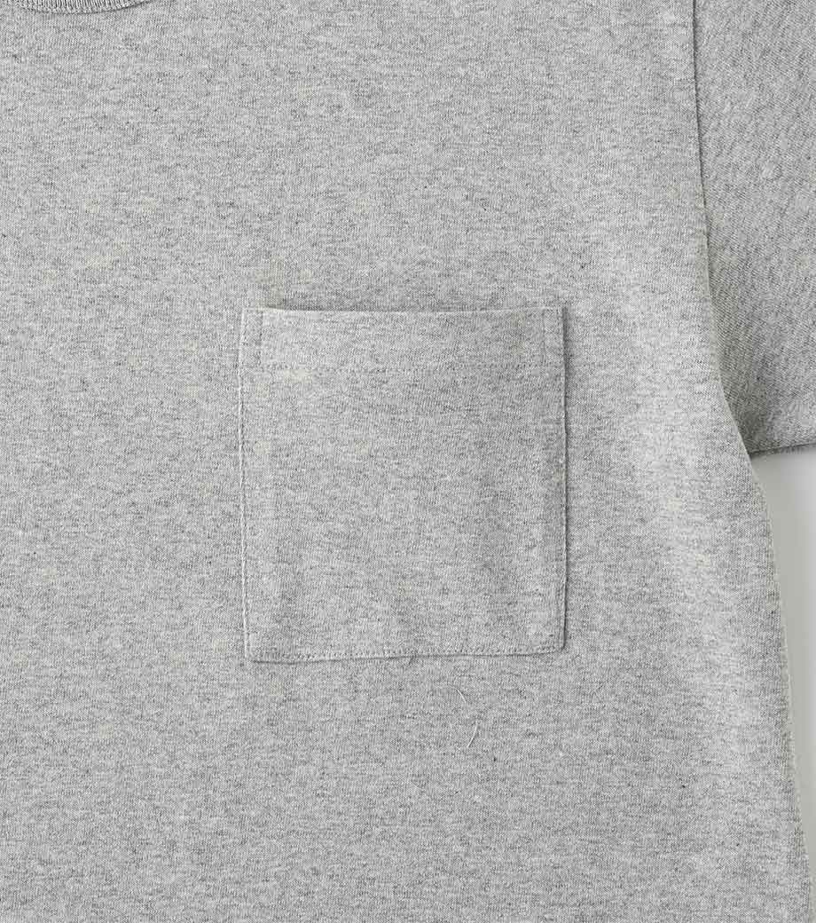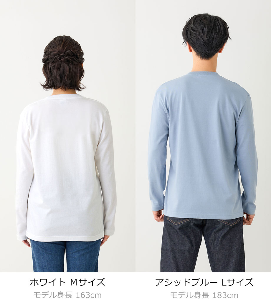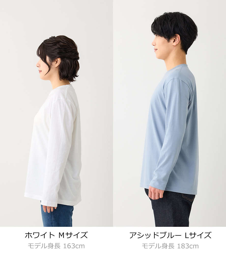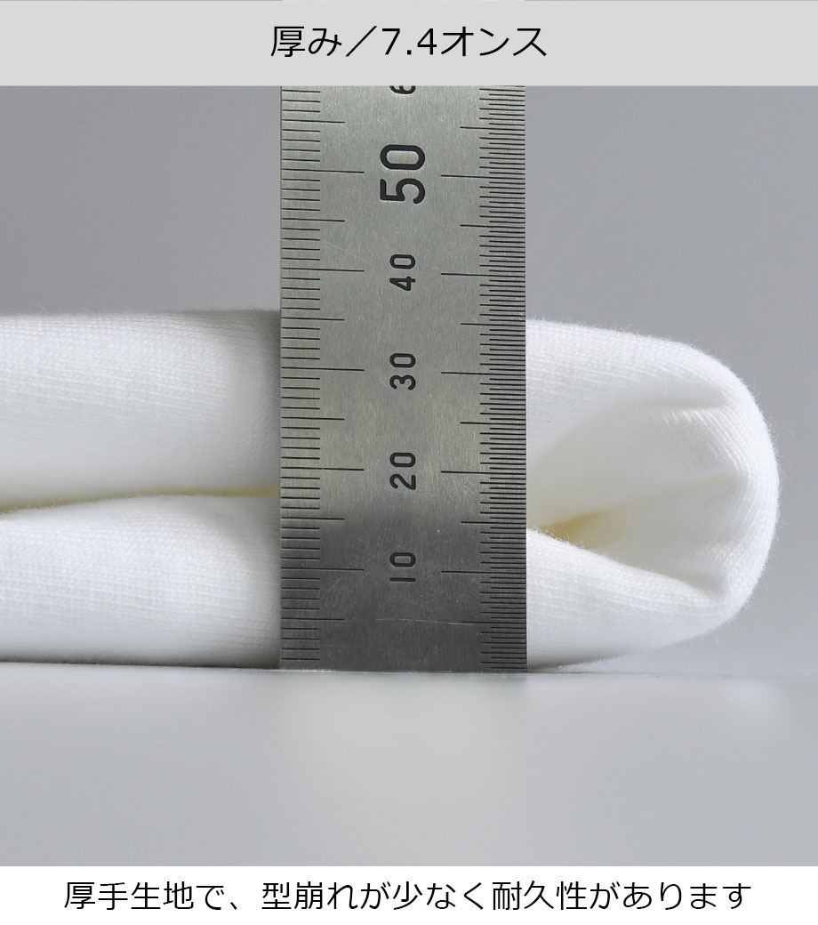 綿100%の優しい肌触りで、着心地の良さも抜群。首回りのステッチを二重にするなど、よれにくく、長く使える機能性と耐久性が魅力です。適度な厚みで、オールシーズン活躍する大定番のアイテムです。