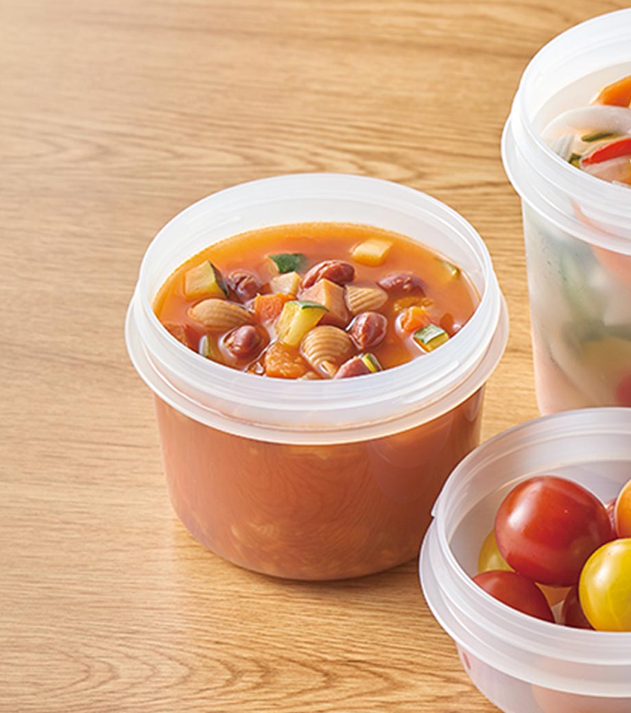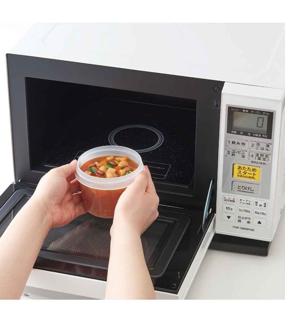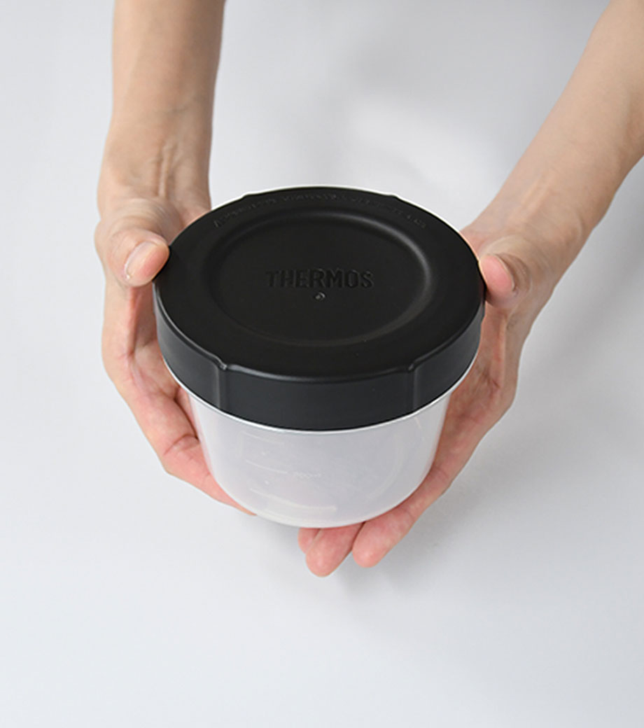 サーモスの丸型保存容器です。汁気のあるおかずやスープを1人分入れるのにピッタリな500mlサイズ。フタを外せば電子レンジOK!もちろん冷凍保存も対応しています。フタ内側の溝から圧を逃がせる設計なので、熱いものを入れた後に中身が冷めても簡単に開けられます。