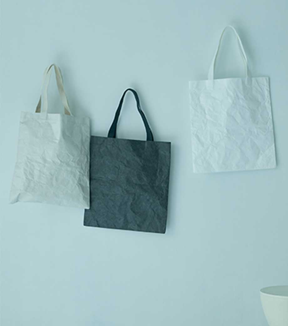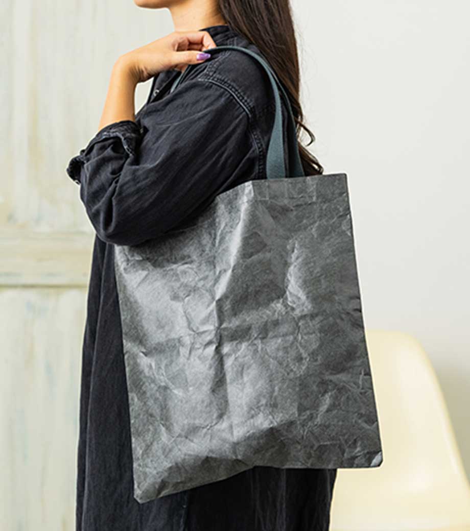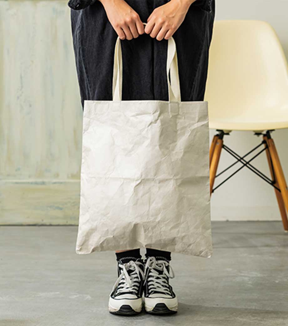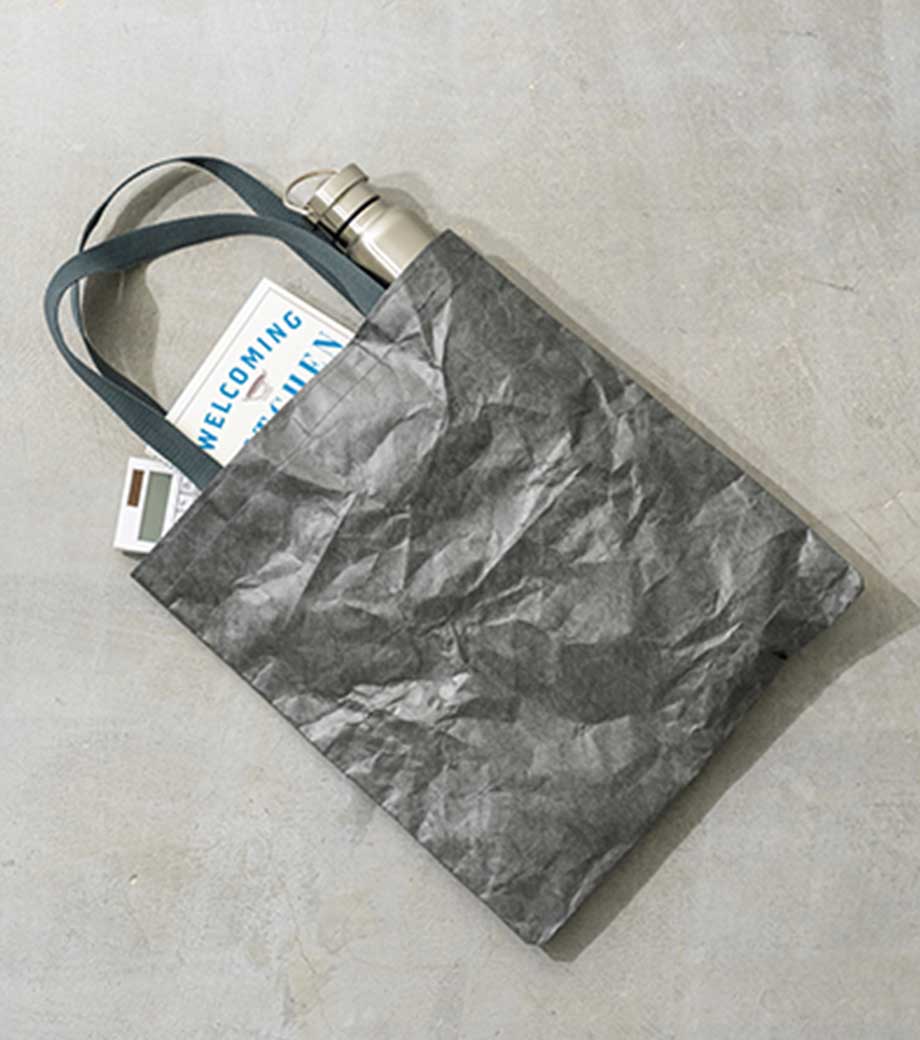 独自の紙のようなくしゃっとした風合いがスタイリッシュなトートバッグです。軽量でありながら耐久性に優れたタイベック素材を使用し、通気性を兼ね備えた実用性抜群のアイテムです。A4サイズが余裕で入るサイズで日常使いやお出かけ、カフェタイムのお供にも最適。