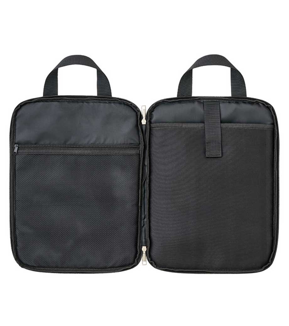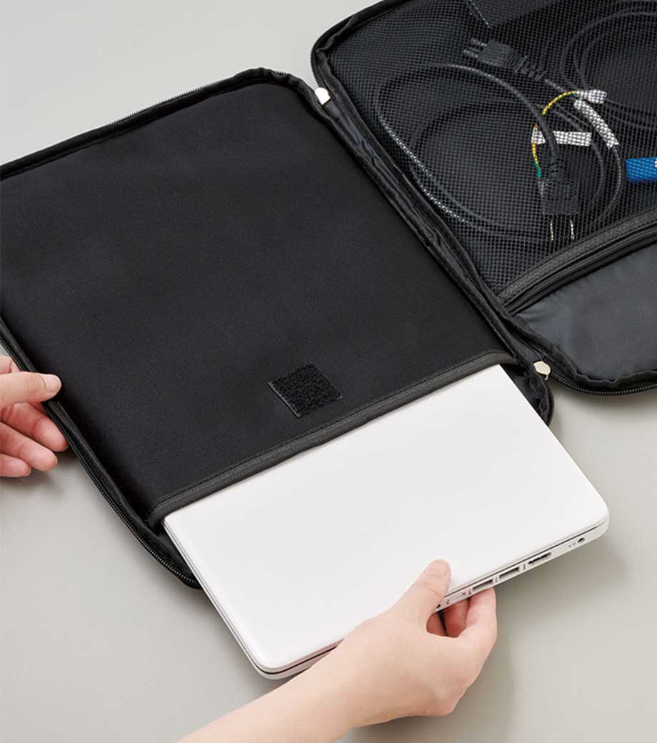 文房具やデジタルガジェットの仕分けに便利な収納バッグ。内側にはペンが入るサイズのファスナー付きメッシュポケットが1つと、スマホが入るくらいのミニポケットが2つ付いています。外側もポケット付きでメモ帳やスマホを入れておけます。片面を倒してゴムで留めることで中身を確認しやすい形態にチェンジ可能。自立するので作業アイテムをまとめて机に置いておけます。