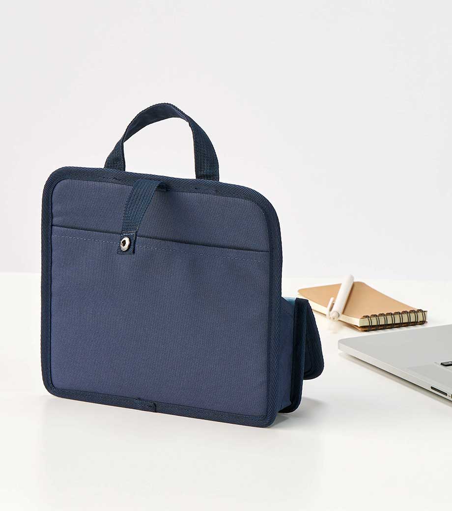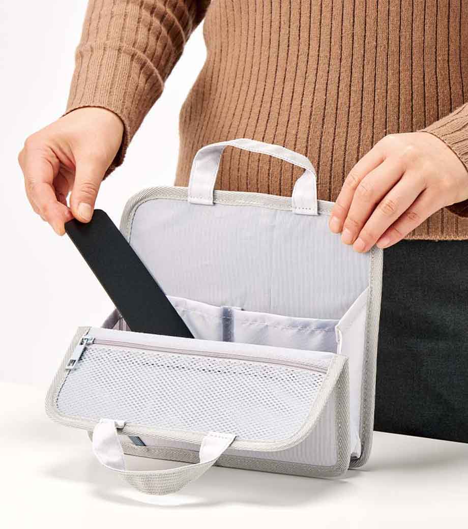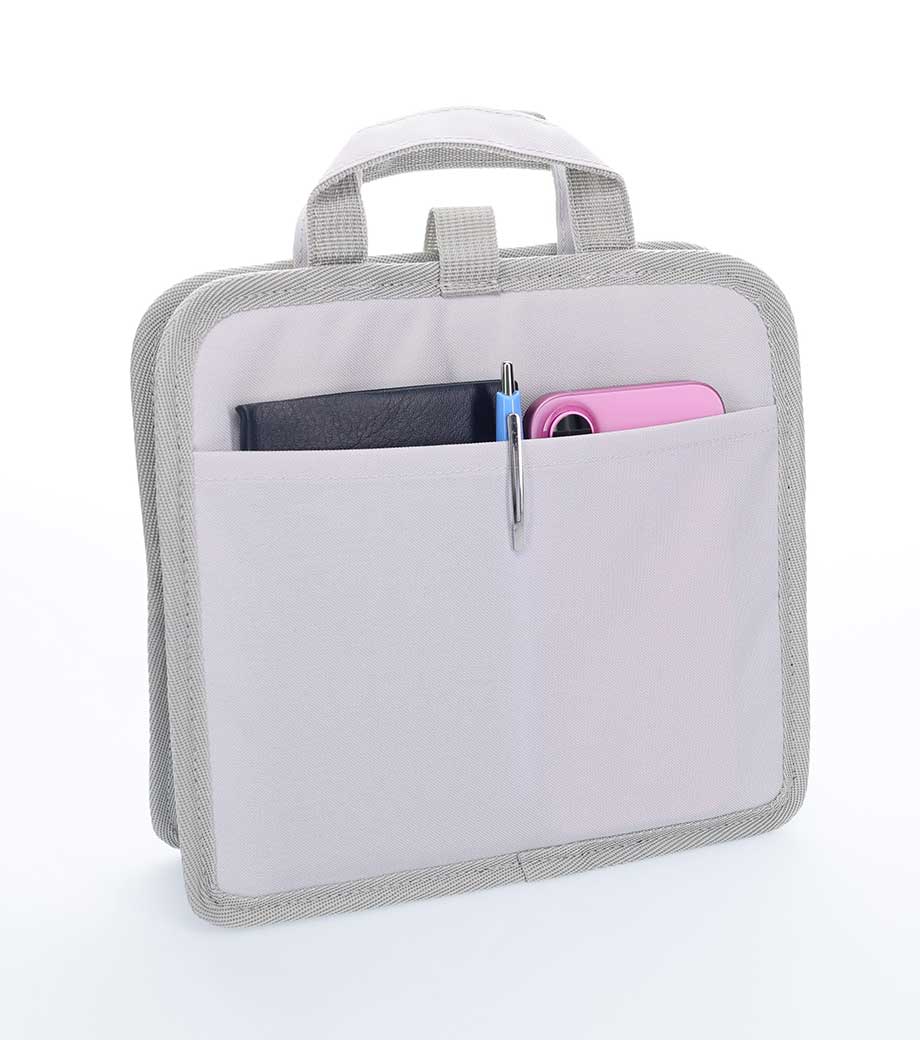 リヒトラブ SMART FIT クリップファイルは、A4サイズの用紙がしっかり収まるサイズ感。クリップボードのクリップは開いたまま固定でき、用紙を揃えて差し込みやすいです。内側と裏面にもポケットがあるので、書類と用紙のストックを分けて収納することもできます。内側のポケットは、ふせんやペンなどのこまごました物を引っかけられる切れ込み入り。これ一つあれば、書類も筆記用具もスマートにまとめて持ち運べますね。