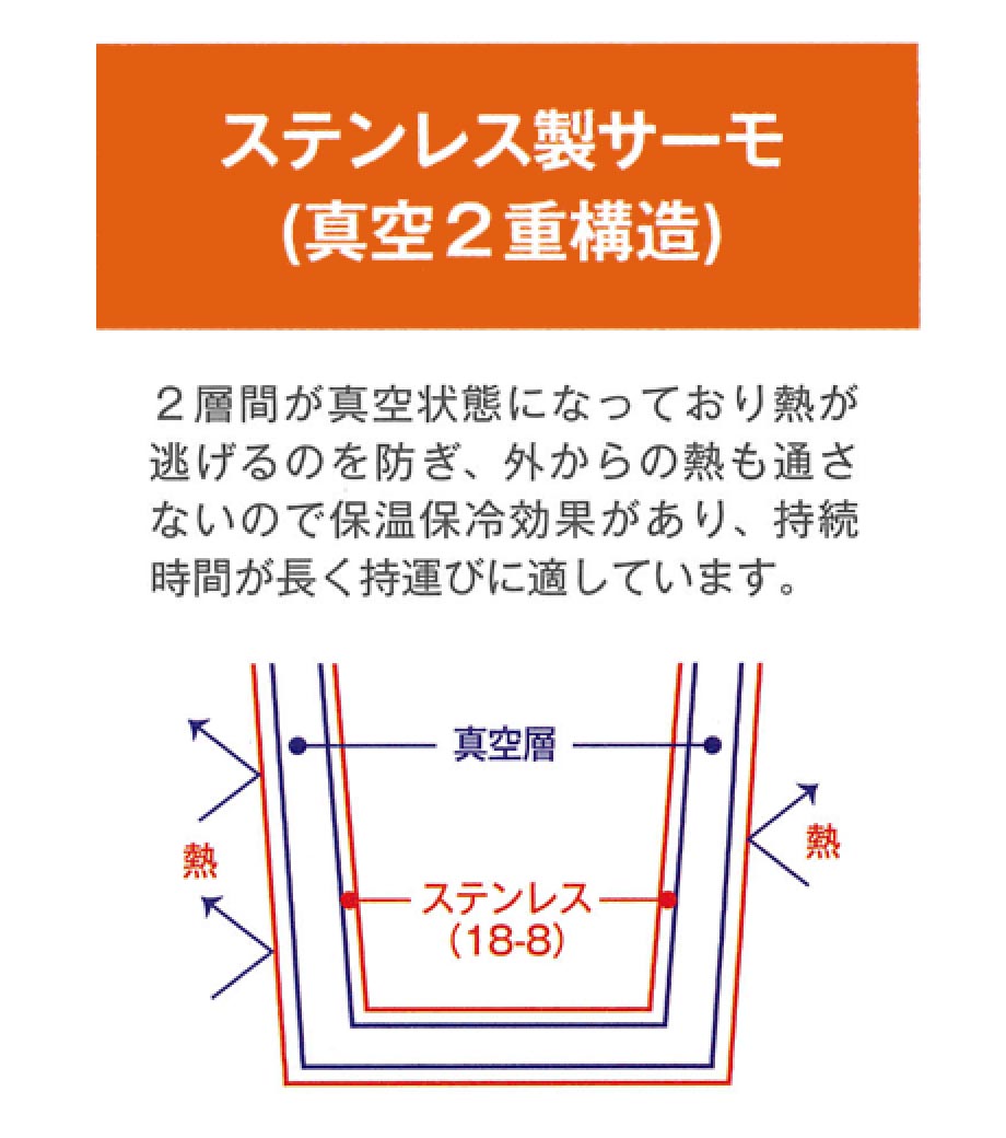 保冷・保温に優れた真空二重構造のステンレスボトル。JIS規格に基づく保温効力試験でも優れた結果を残しています。