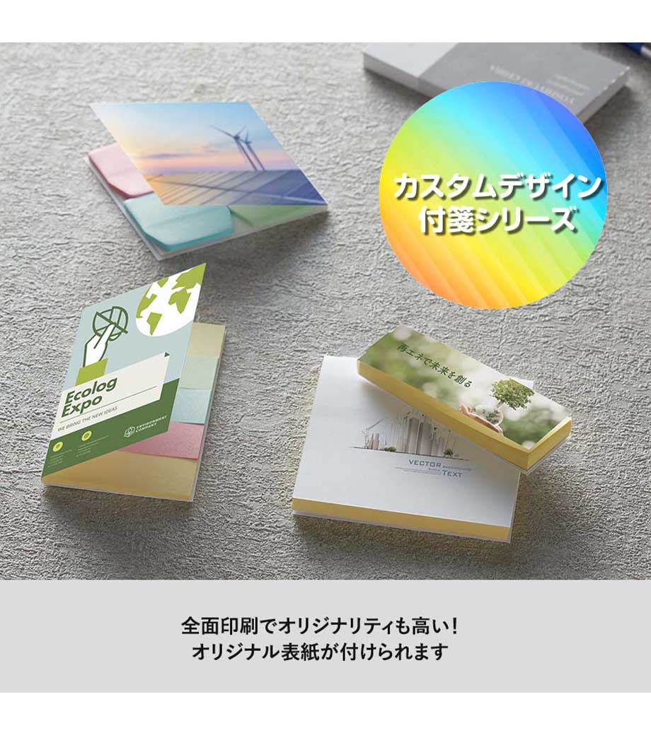 【フルカラー名入れ】カスタムデザイン付箋(S)は、表紙に最安値でオリジナルのデザインをフルカラー印刷できるフセン。100個から印刷可能です。