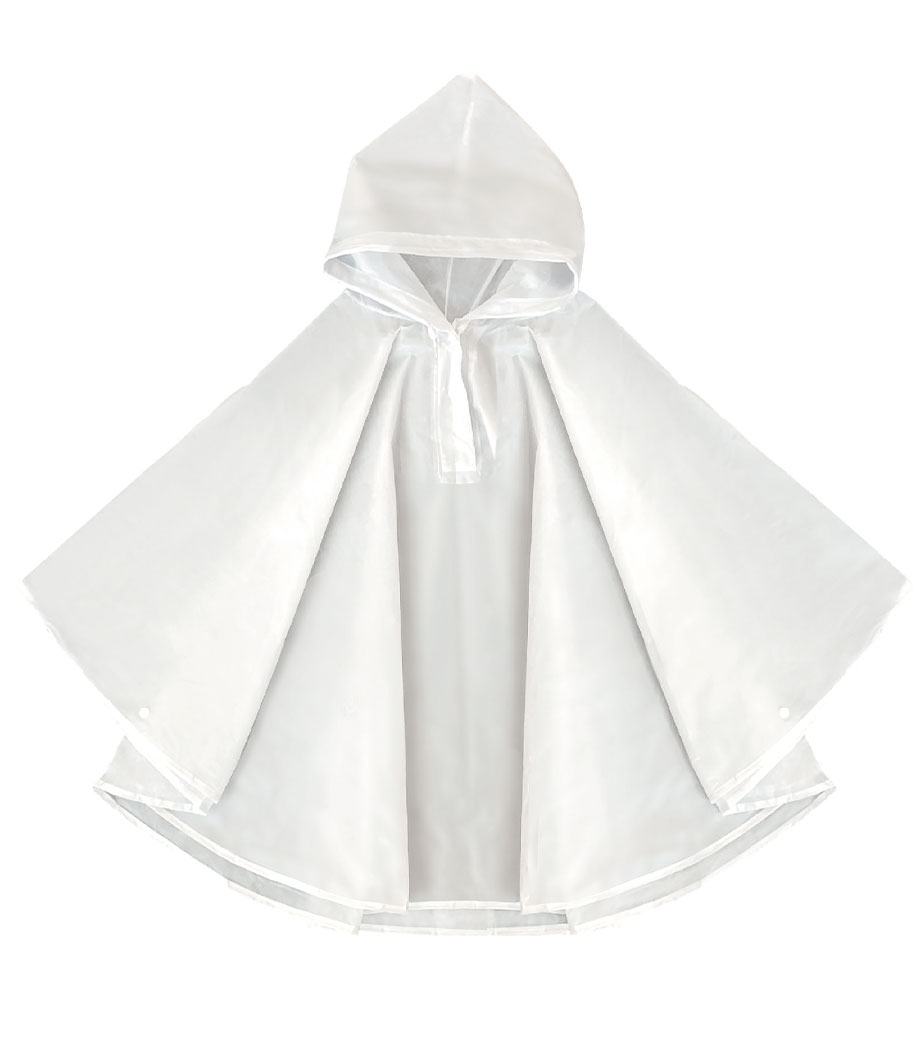 やわらかで薄手。被るタイプの白いポンチョです。ケースのお色はオレンジ・グリーン・ブルーの3色取混ぜでお届けします。