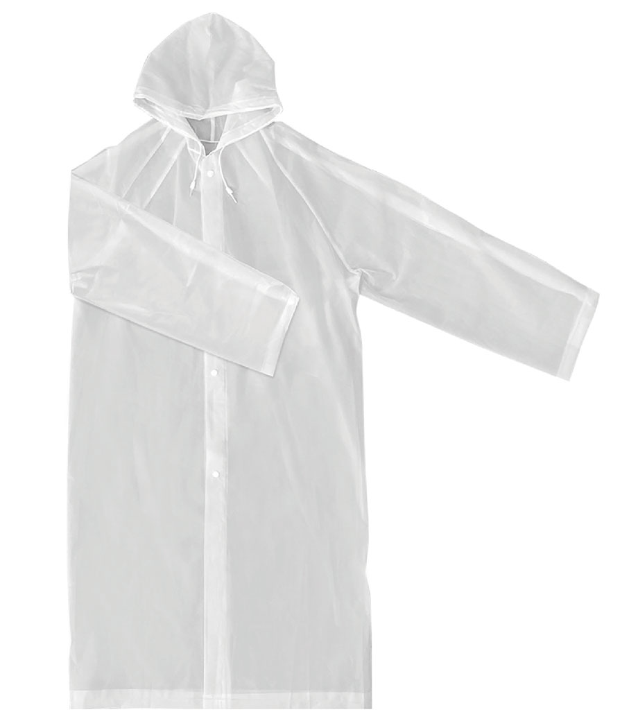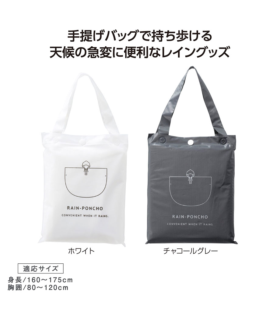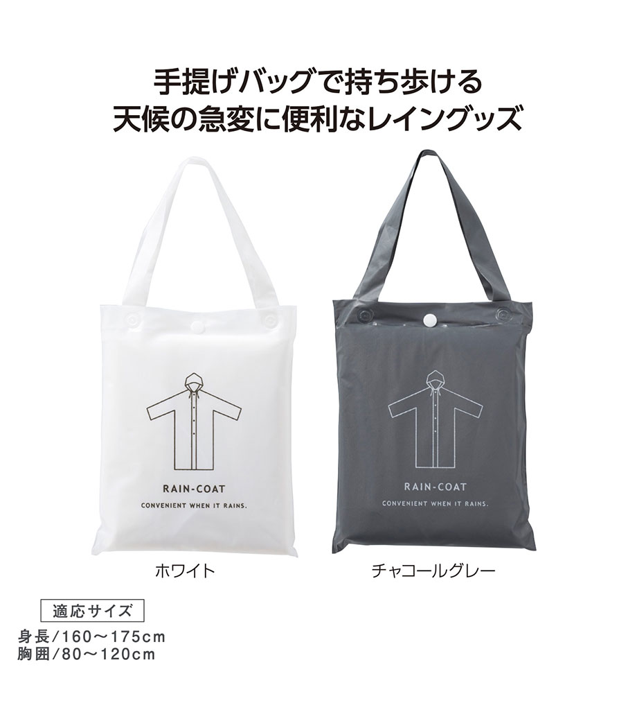 カラーは使いやすいホワイトとチャコールグレーの2色取混ぜ。身長160~175cm、胸囲80~120cmに対応し、ゆったり着られるサイズ感です。着脱しやすいスナップボタン式でフードには調節可能な紐付き。突然の雨にもスマートに備えられる一着です。