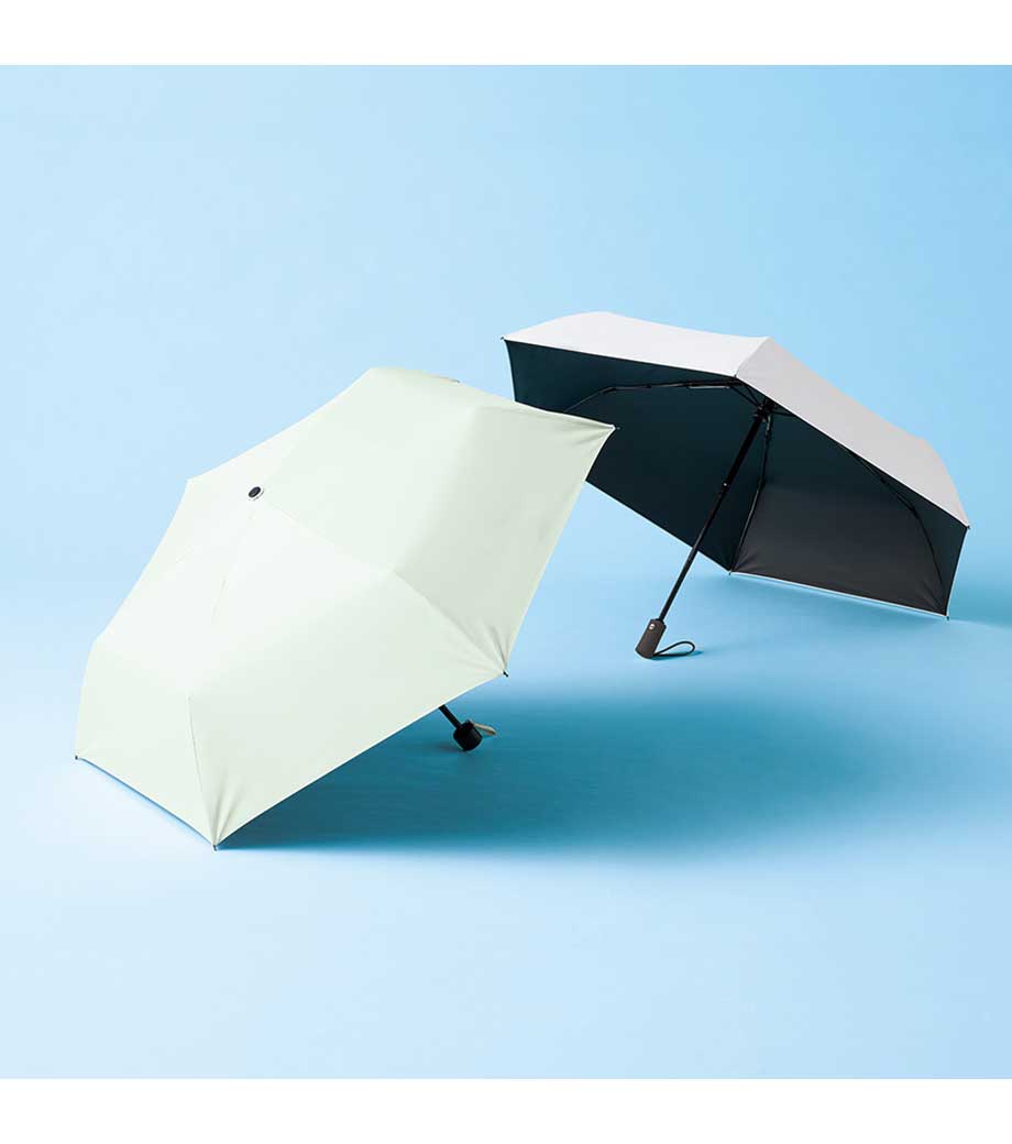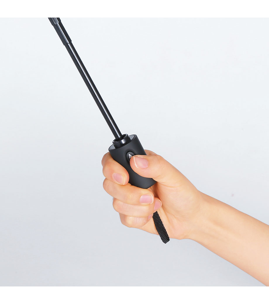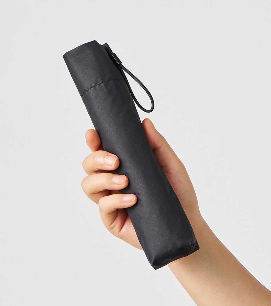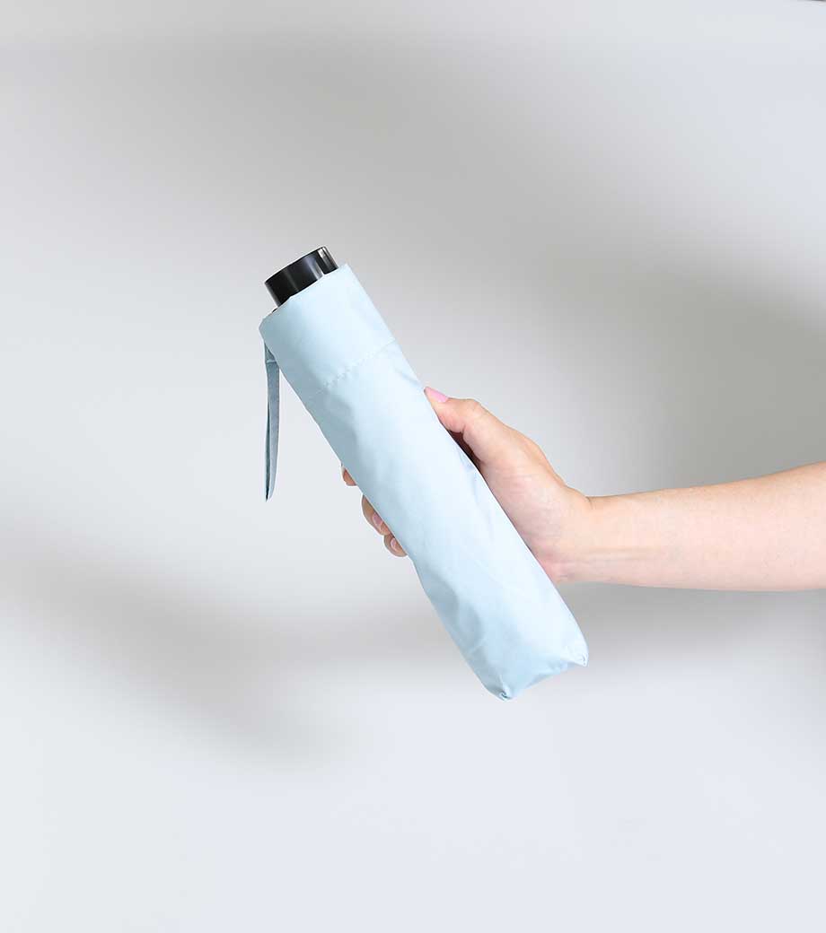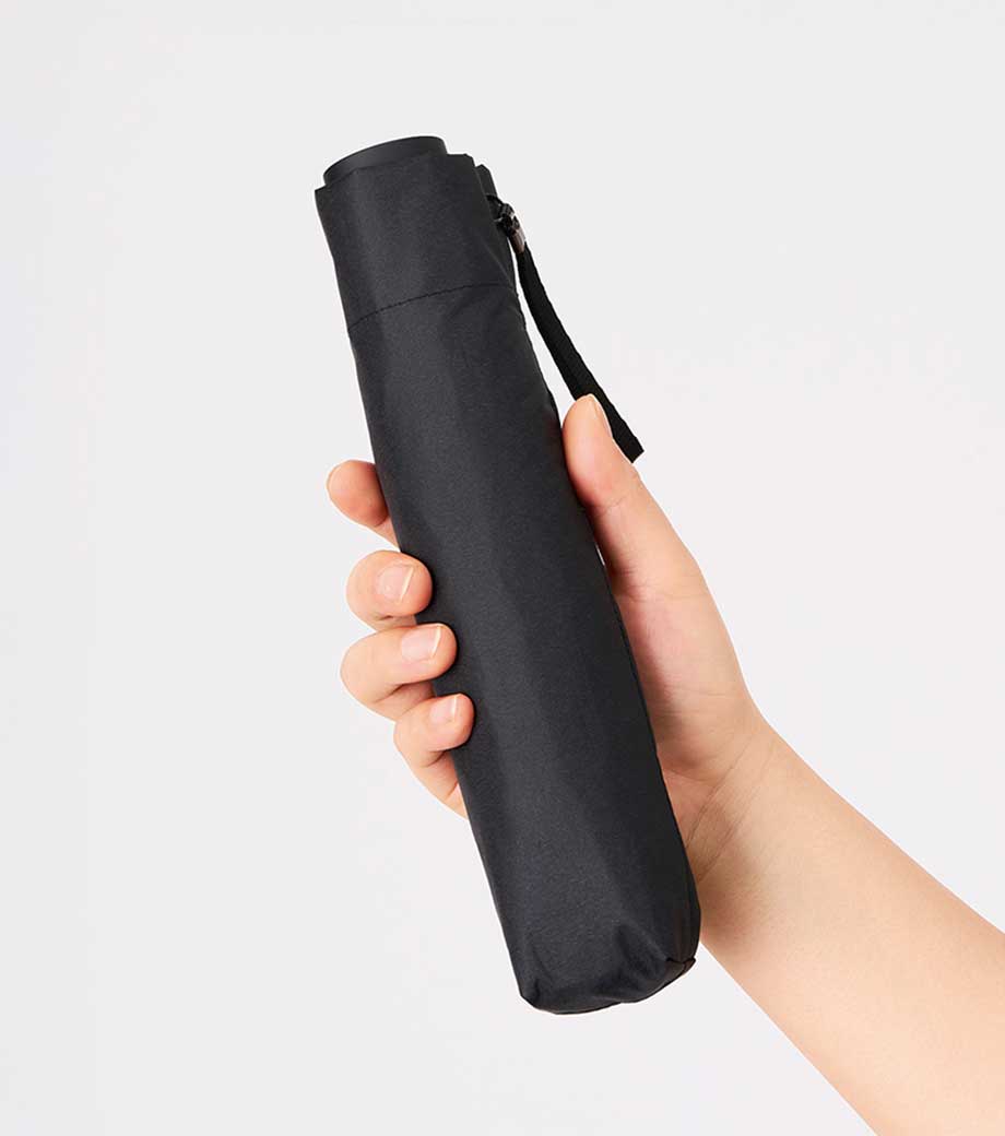 5段設計でスマホ程度のコンパクトサイズになる折りたたみ傘。晴雨兼用で一年中使用できます。遮光率100%、UVカット率90%以上・UPF評価50+を取得しており、日差しが強い季節も安心。持ち手とストラップの色を傘本体に合わせることで、スタイリッシュなデザインになっています。
