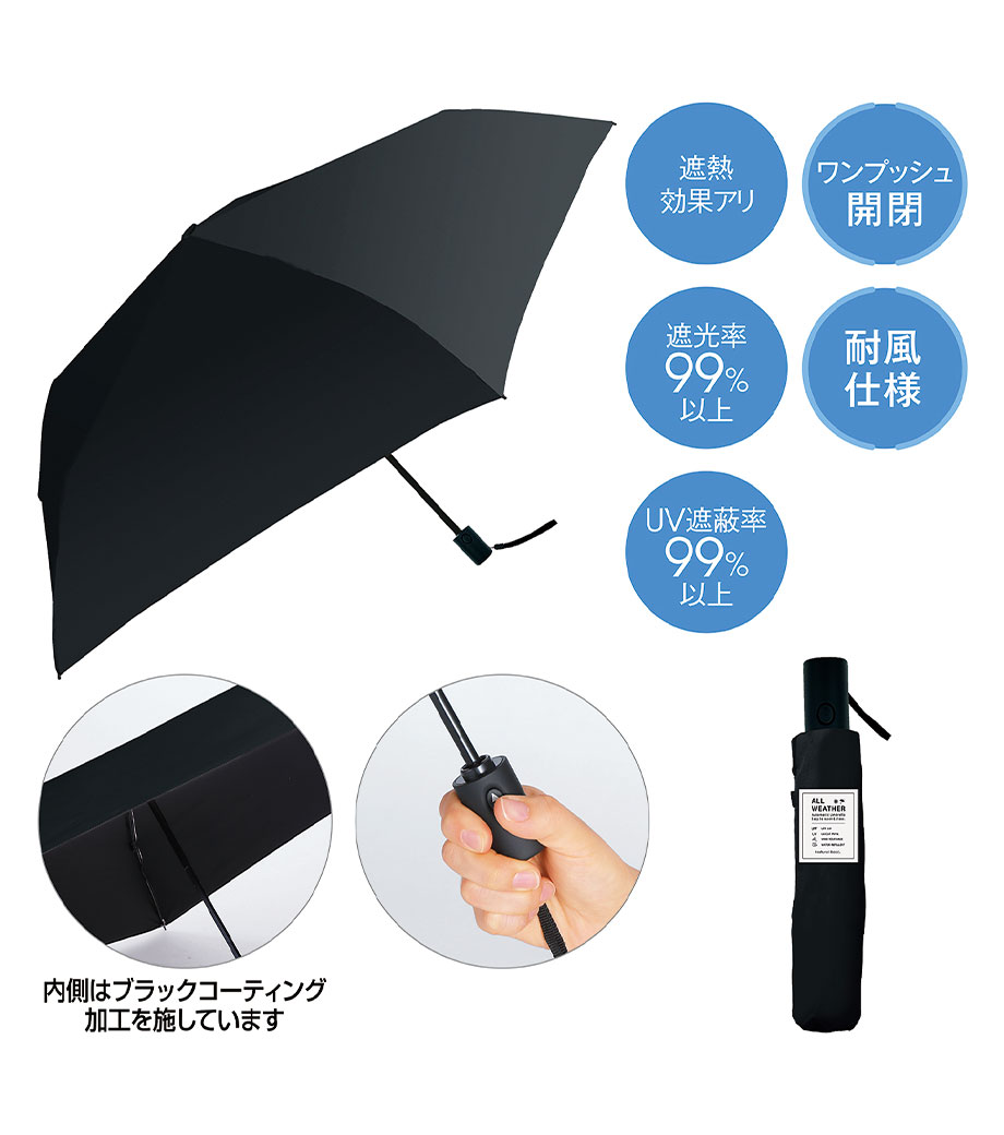 ボタンを押して片手で開閉できる、便利な自動開閉タイプの折りたたみ傘です。遮光・遮蔽率99%で紫外線をしっかりブロックし、遮熱効果もあるので夏の日差し対策にぴったり。内側のブラックコーティングが地面や建物からの反射光も吸収してくれます。晴雨兼用で耐風仕様なので、悪天候にも備えられて一年中使えるアイテムです。