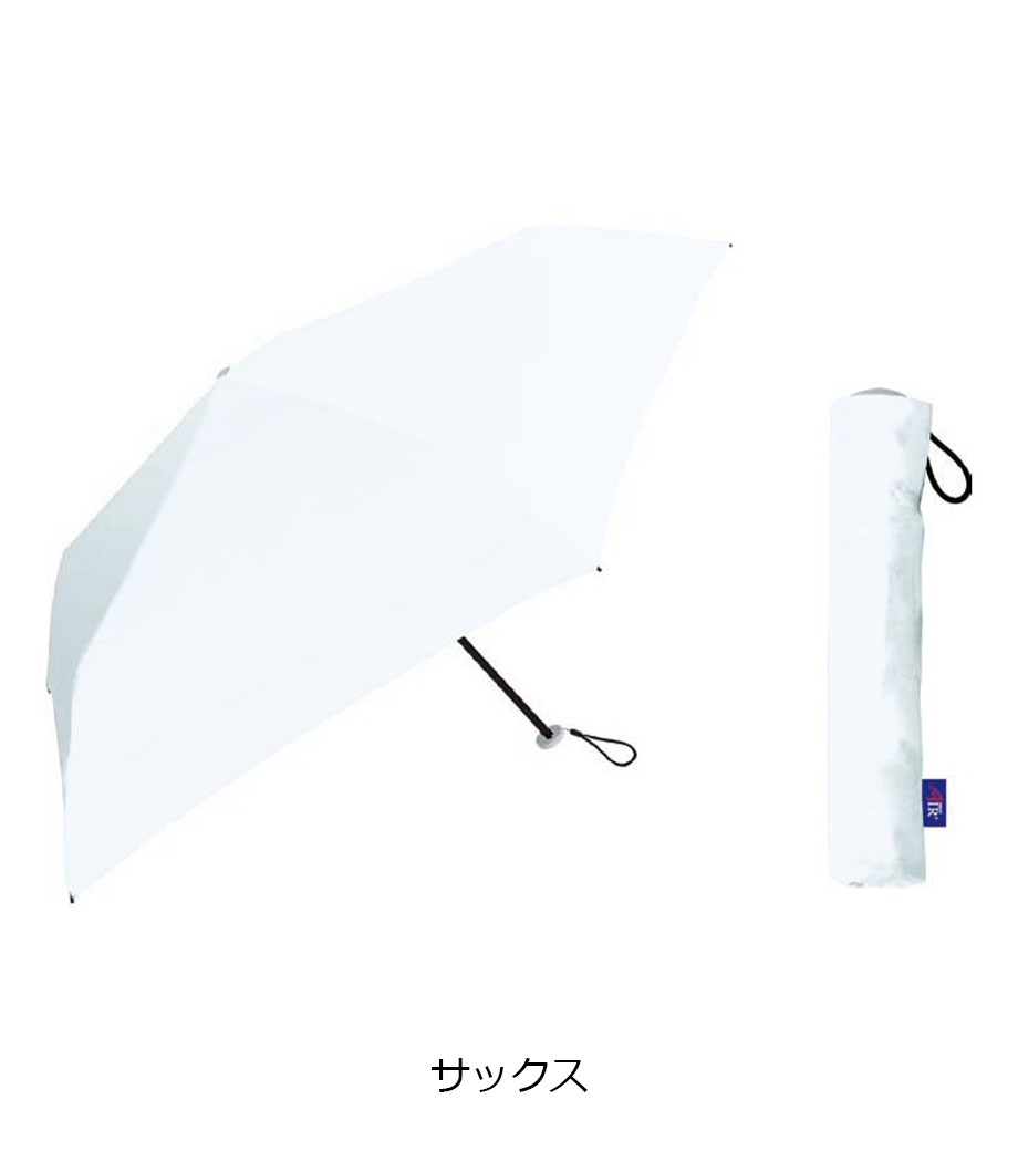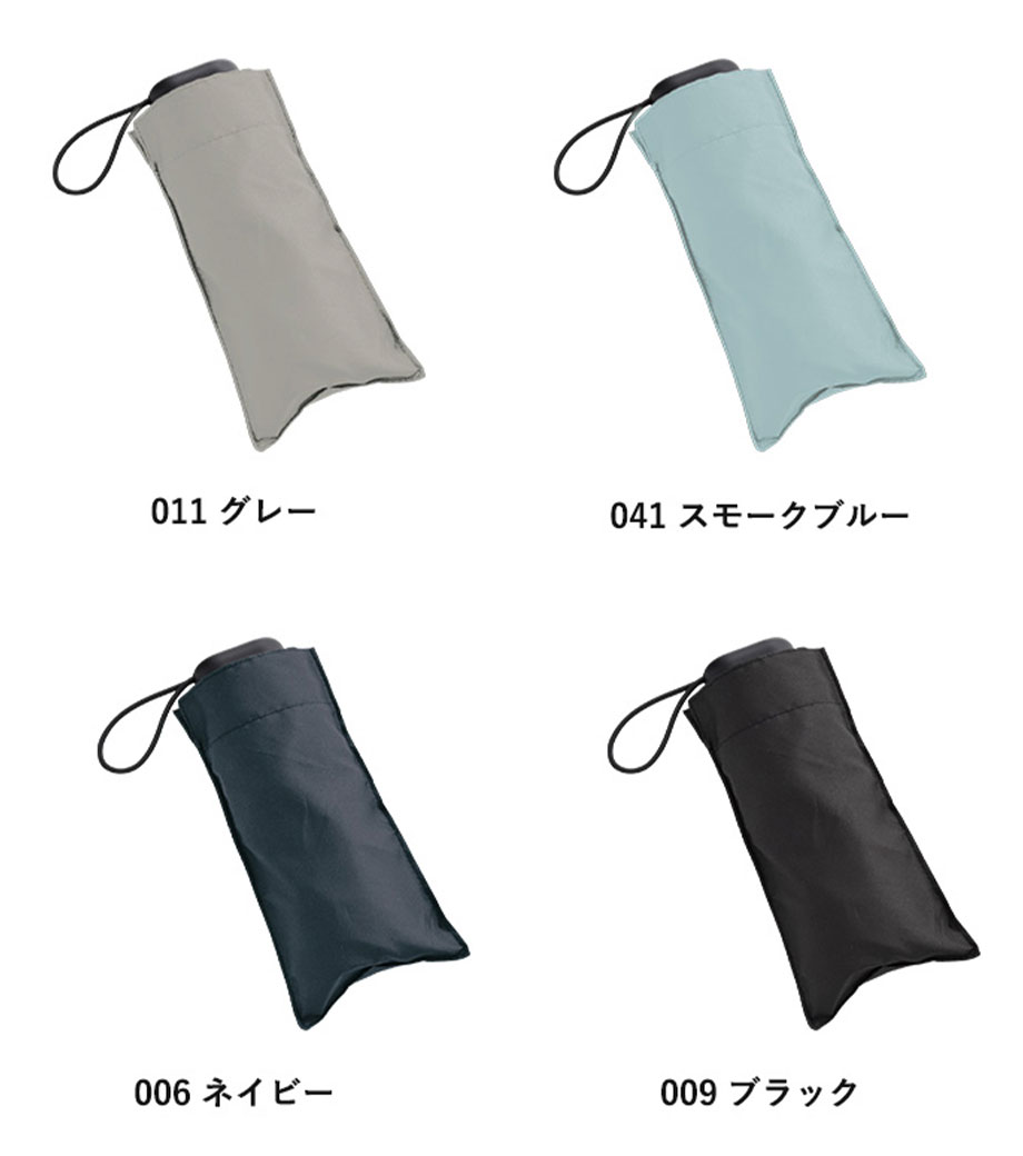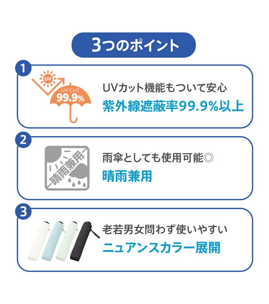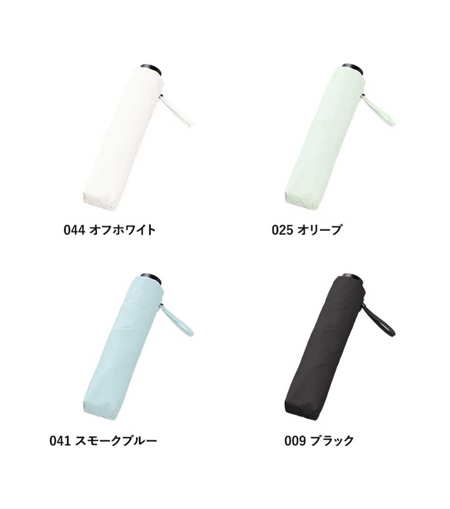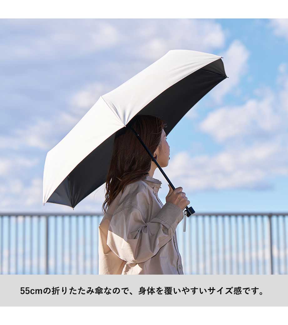 遮光率100%生地使用の晴雨兼用傘。遮光率が高く、日焼け対策や真夏の熱中症対策としてはもちろん雨傘としての通年使用も可能です。親骨55cmは、折りたたみ傘の中では大きめで体を覆いやすいサイズ感。老若男女問わず使えるニュアンスカラーの4色展開で、シンプルデザインです。アパレルや雑貨店の高級ノベルティにおすすめです。