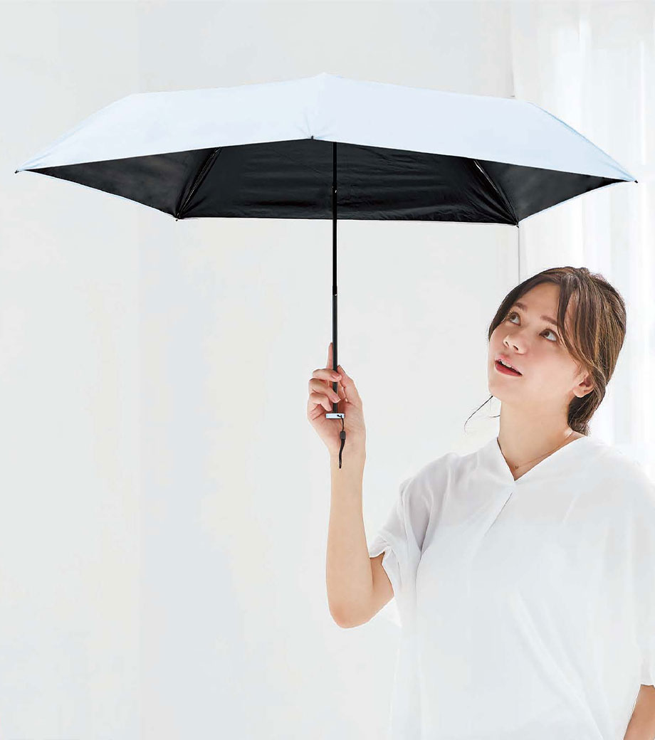 遮光・UVカット率99.9%の折りたたみ日傘。雨の日にも使えるのでオールシーズン大活躍間違いなし。傘の内生地は黒地で、遮熱率51%。日傘の使用で体感温度は3から7℃下がるとされています。日本の猛暑を乗り切るために男女問わず必須のツールはもらって嬉しいノベルティですね。安心のネイルガード付きです。