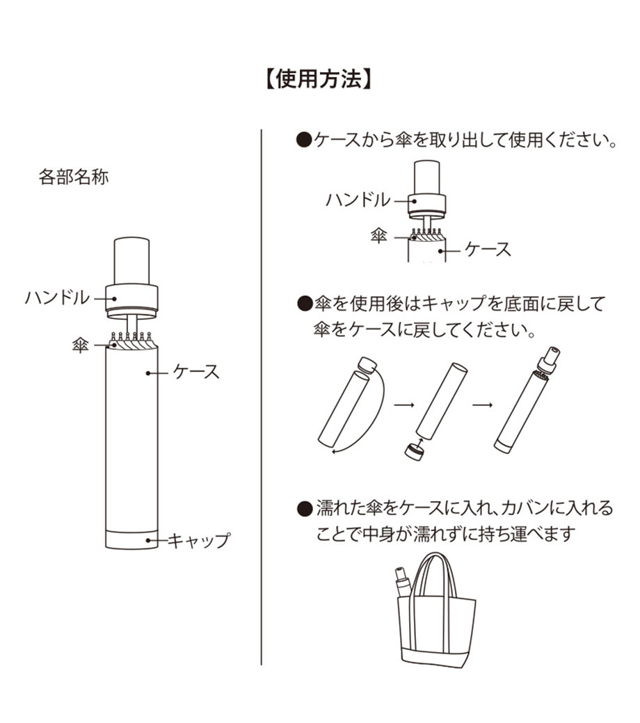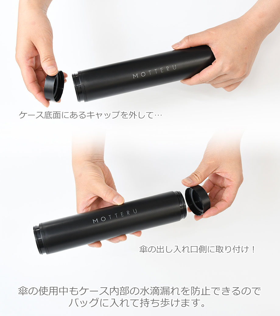スリムボトルUV折りたたみ傘は、濡れた傘をボトルケースに収納して持てるので、バッグや服が濡れてしまう心配がいらないアイテム。ケースの底にフタが付いているので、傘使用中はその蓋をつけて閉じればケース内の水は漏れ出ません。あったら嬉しいUVカット加工付きで晴雨兼用です。