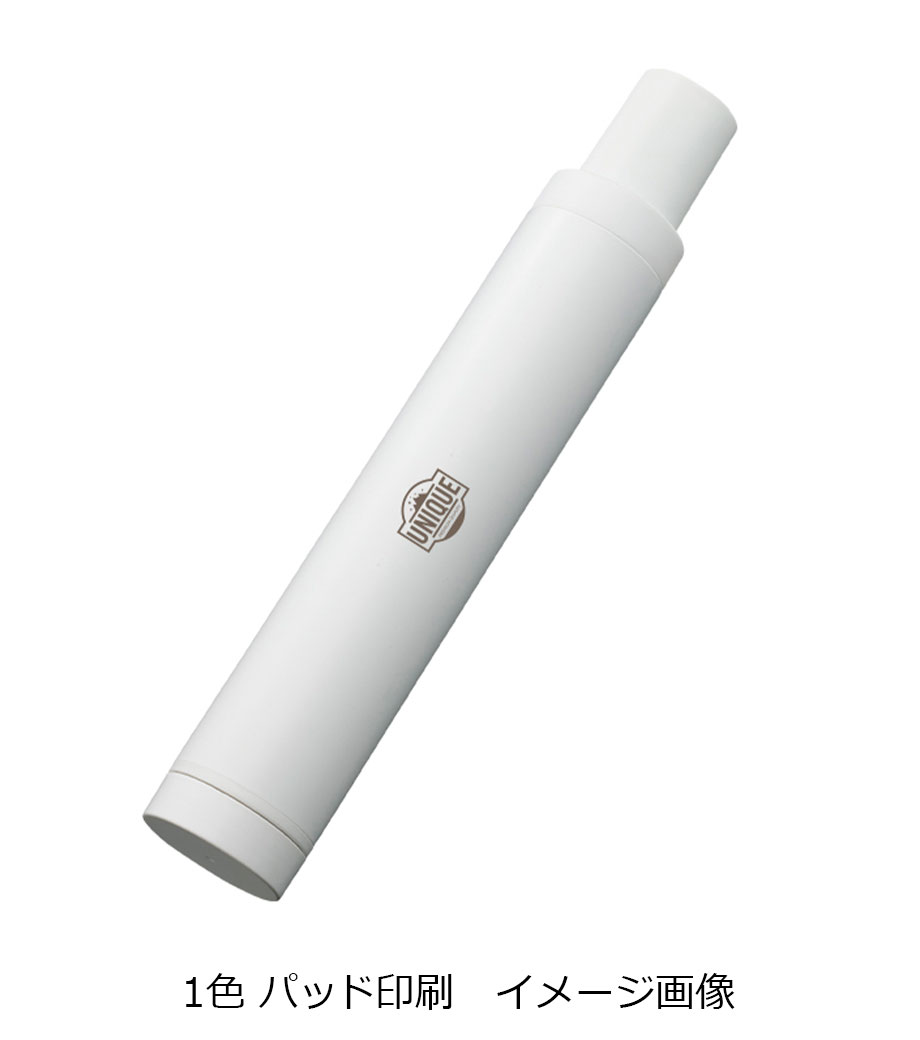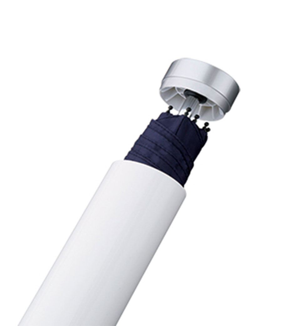 ケースに1色でクルっと印刷できPR効果大です。ホワイト×ネイビーのみフルカラーで広く名入れも可能。また、傘のパネル部分にも1色でロゴを入れられます。ユニークかつ画期的なデザインなので、一味違ったノベルティをお探しの方にピッタリです。