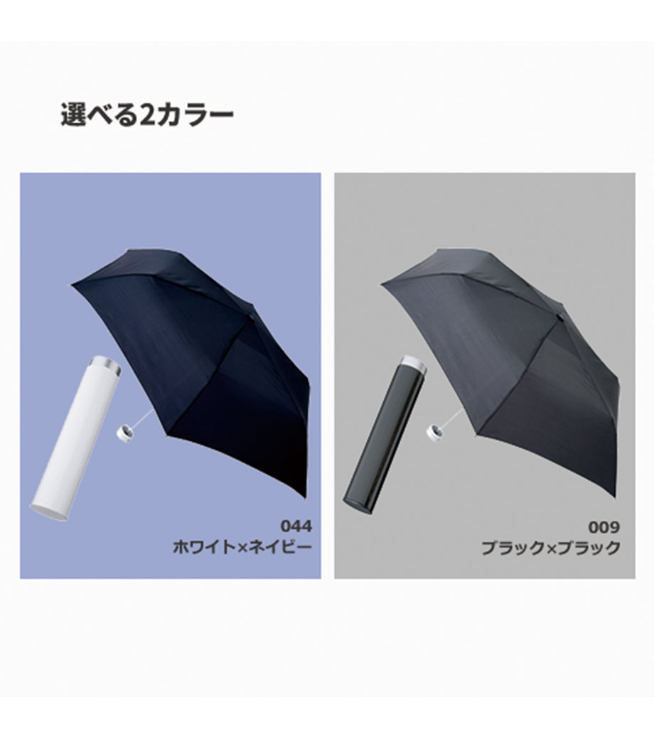 傘袋・傘本体の一方または、両方に1色の名入可能。傘の本体色はビジネスシーンでも使いやすい色展開です。夏の暑さが過酷になり日傘を持つ男性が増えた今、男女共もらって嬉しいノベルティです。