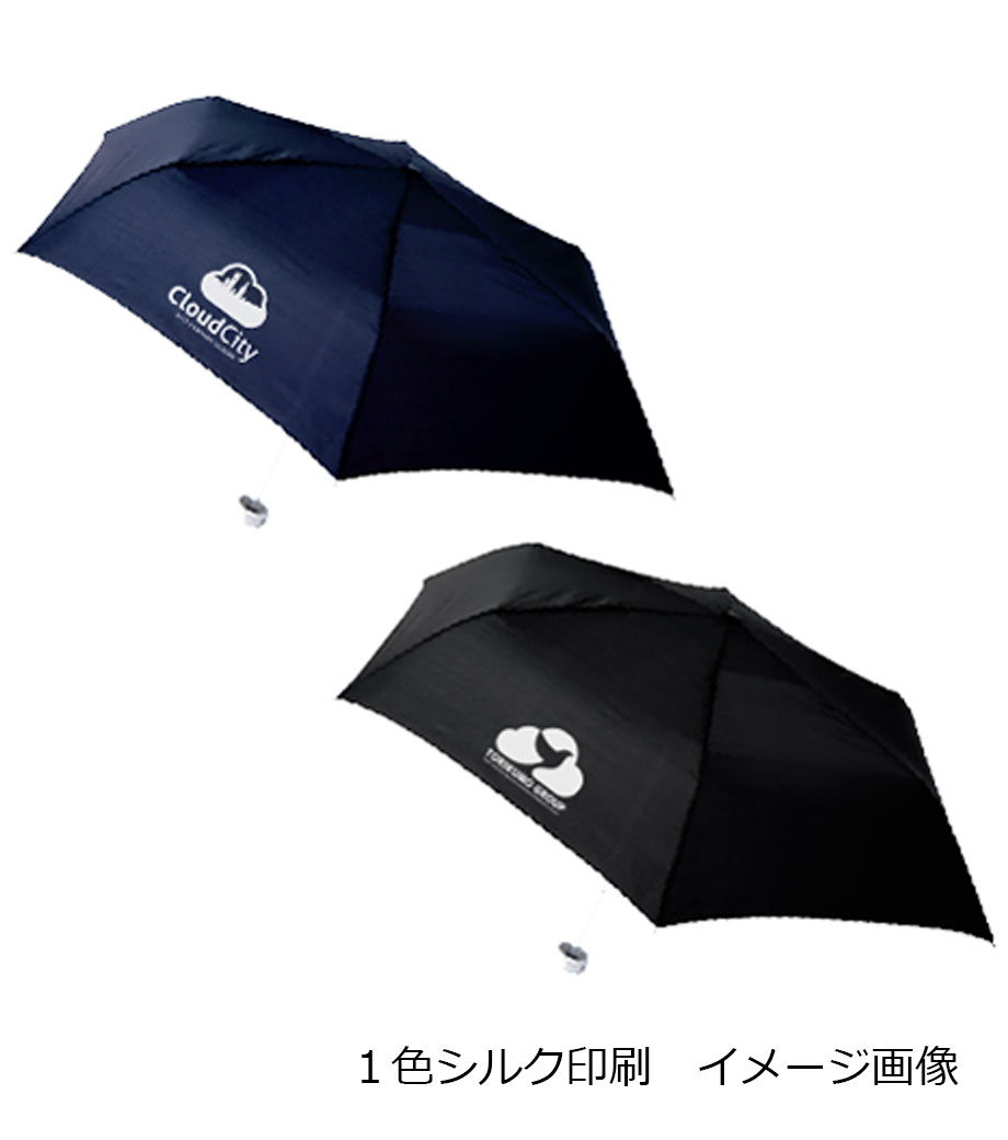 傘本体、傘袋に1色でロゴを名入れし、オリジナル折り畳み傘が作れます。記念品にピッタリのノベルティです。