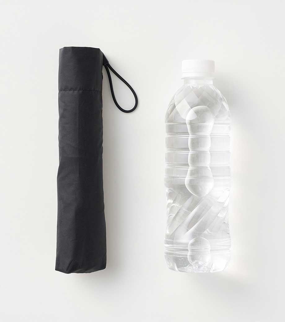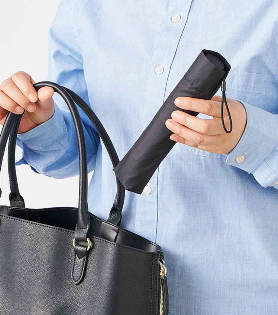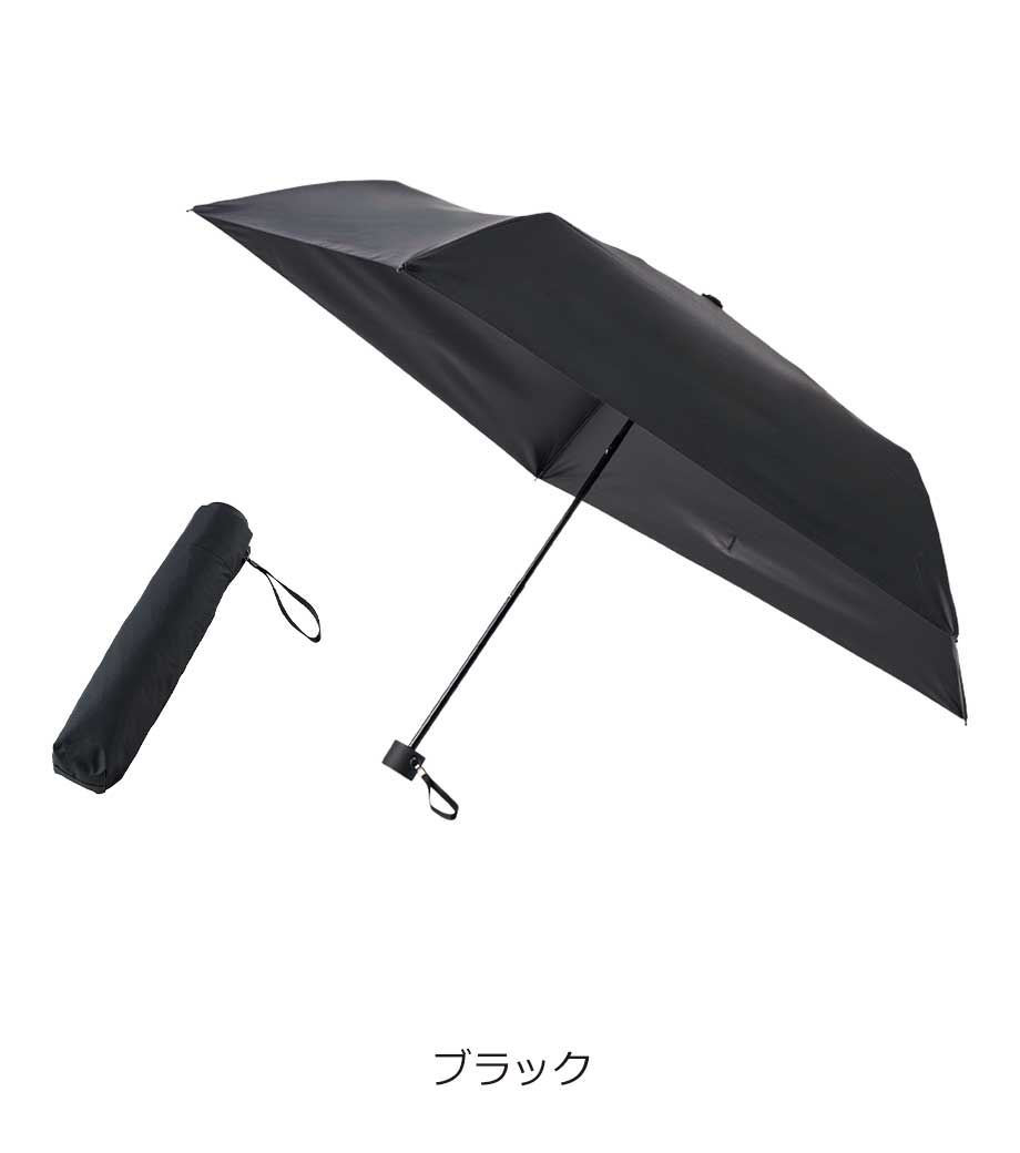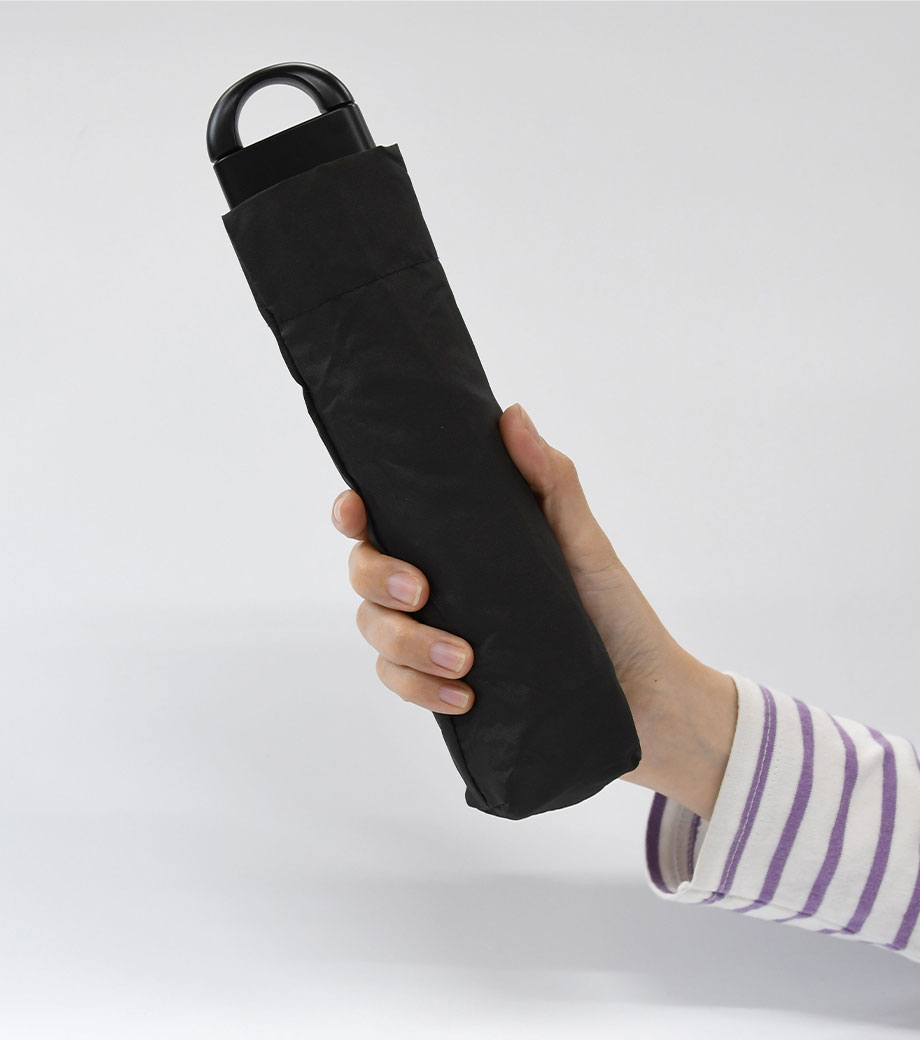 超軽量でスリム形状の晴雨兼用折りたたみ傘です。重さはバナナ1本と同程度の約150gで、500mlペットボトルより細身のボディ。バッグにすっきり収まり持ち運びに便利です。遮光率100%、UVカット率90%以上・UPF評価50+と機能性も抜群。強い日差しや急な雨からしっかり守ってくれます。