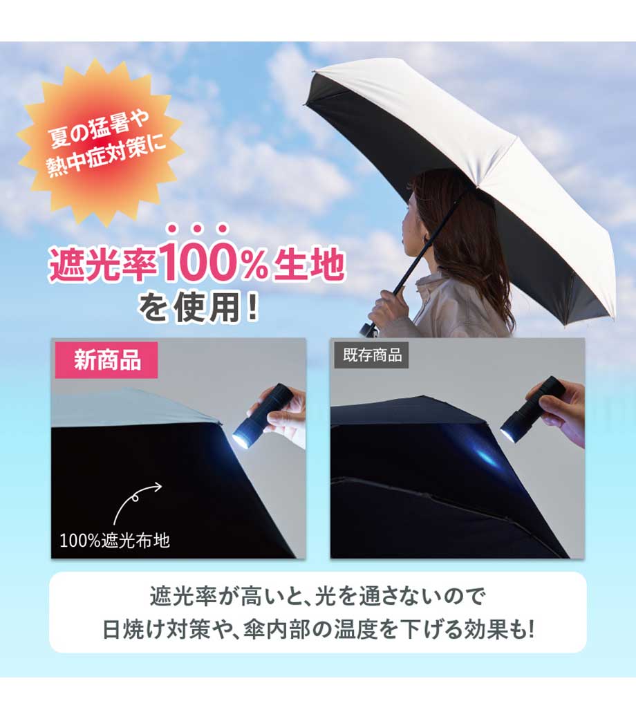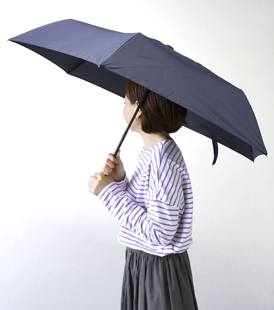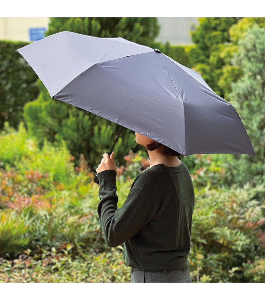 遮光・遮蔽率99%の生地を使用した高性能のビッグサイズ折りたたみ傘。雨傘としてはもちろん、遮熱効果もあるので日傘として暑い日の外出のお供にもぴったりです。8本の親骨で風に強いのも嬉しいポイント。使いやすいブラック・ネイビーの2色展開です。