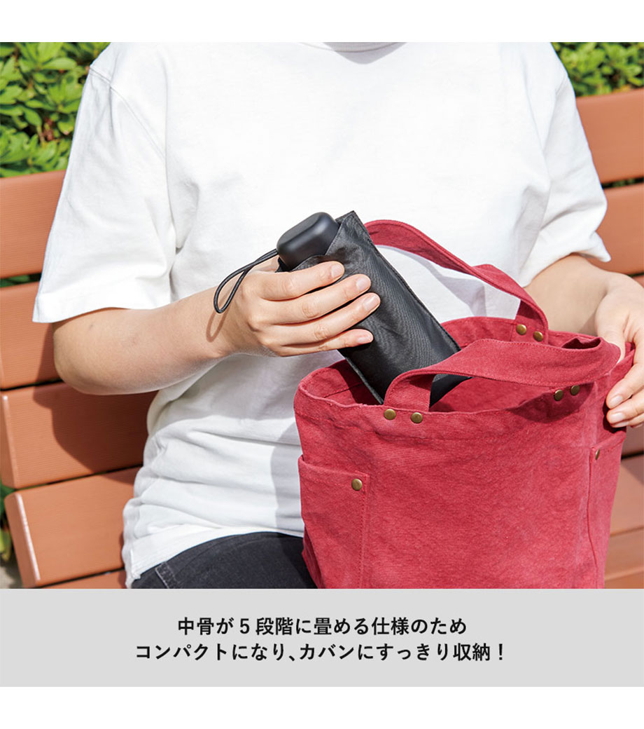 コンパクト5段UV折りたたみ傘は、コンパクトに畳めます。UVカット機能付なので、日傘としても使用可能。小ぶりなバッグにもすっぽり入るので、日常の持ち運びに大変便利です。