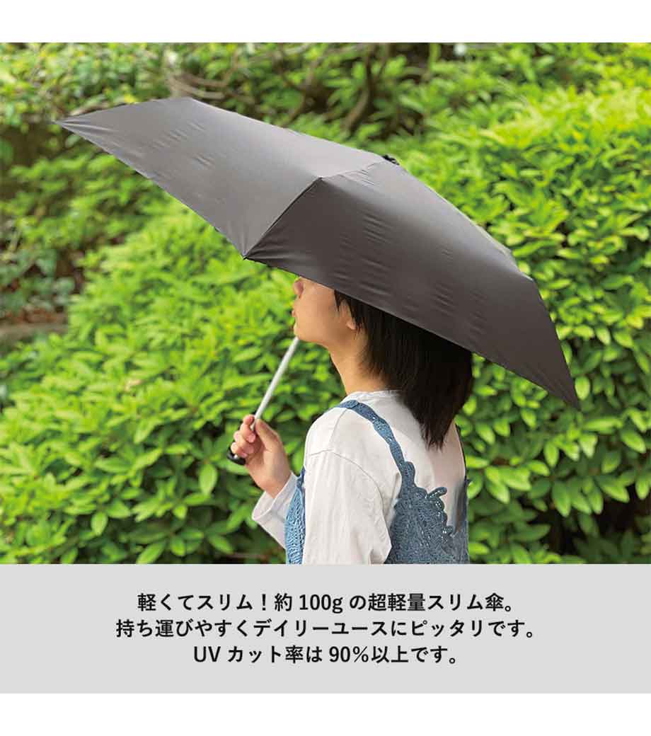 バッグにスッと収まるスリム形状と軽さが魅力の折りたたみ傘です。薄手の生地で重さは約100g。晴雨兼用で一年中活躍します。UVカット率90%以上の生地なので、突然の雨だけでなく強い日差しのシーズンも安心です。ストラップ紐はゴム仕様になっています。