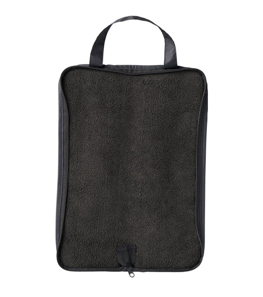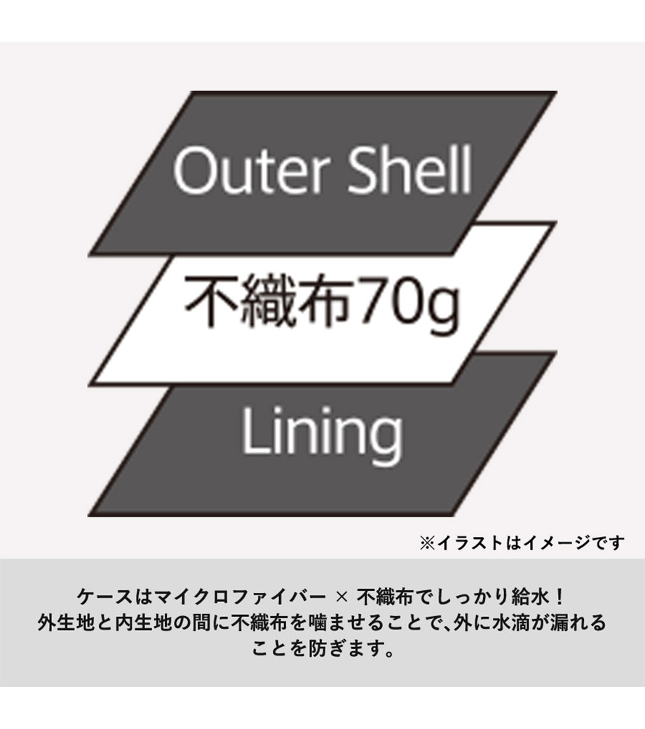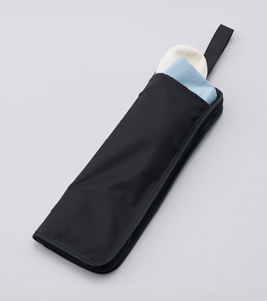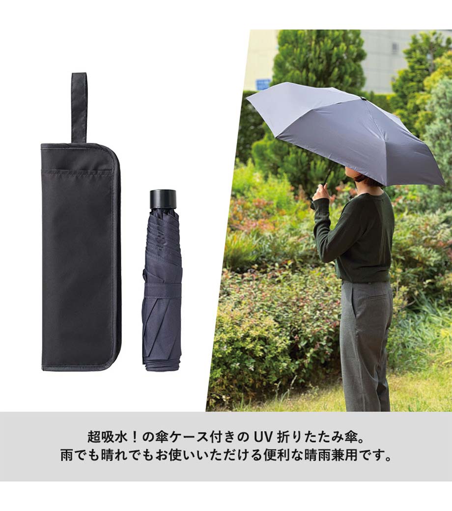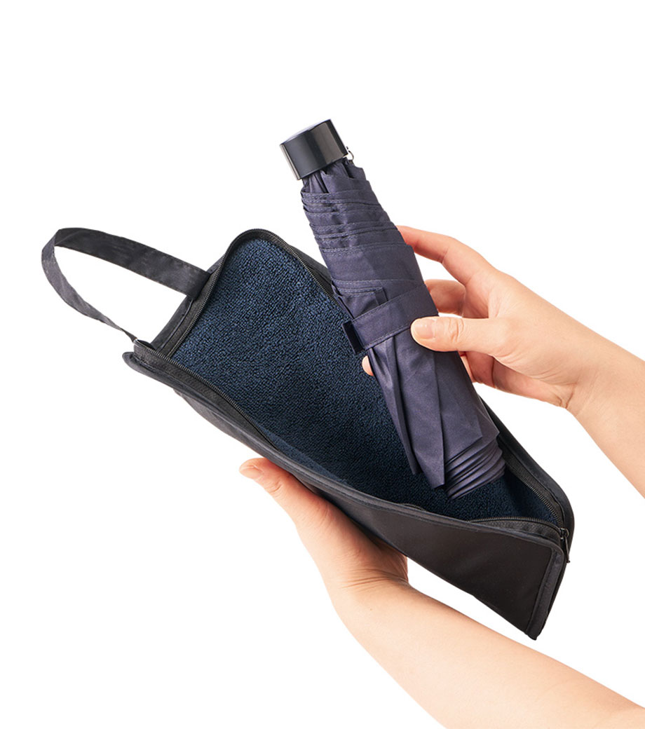 吸水マイクロファイバー生地を使った収納ケース付きの折りたたみ傘。UVカット生地なので晴雨兼用で一年中お使いいただけます。収納ケースは内生地と外生地の間に不織布を挟んだ、外に水滴が漏れにくい3層構造。傘使用後、バッグの中に安心して入れられるのも嬉しいポイントです。外ポケットが付いており、ハンカチなどを収納できます。
