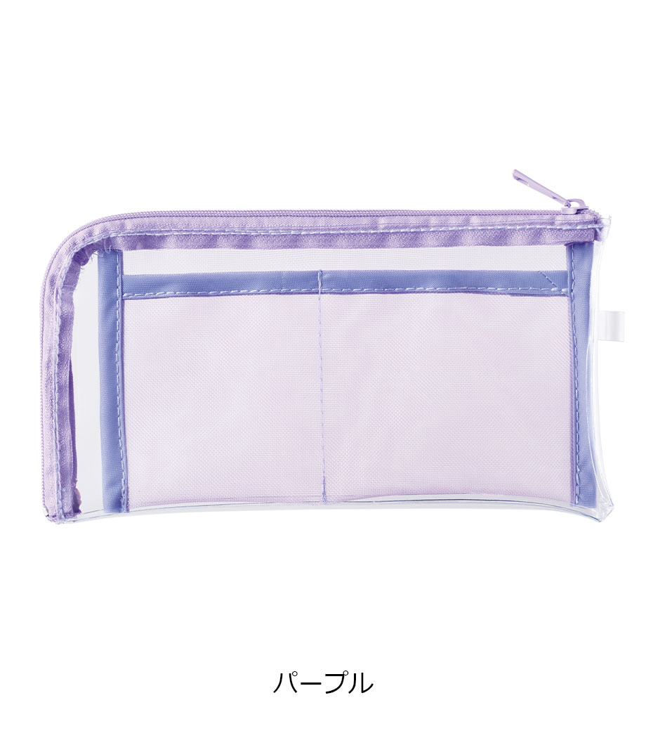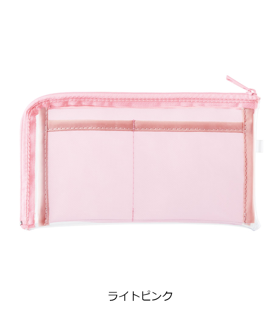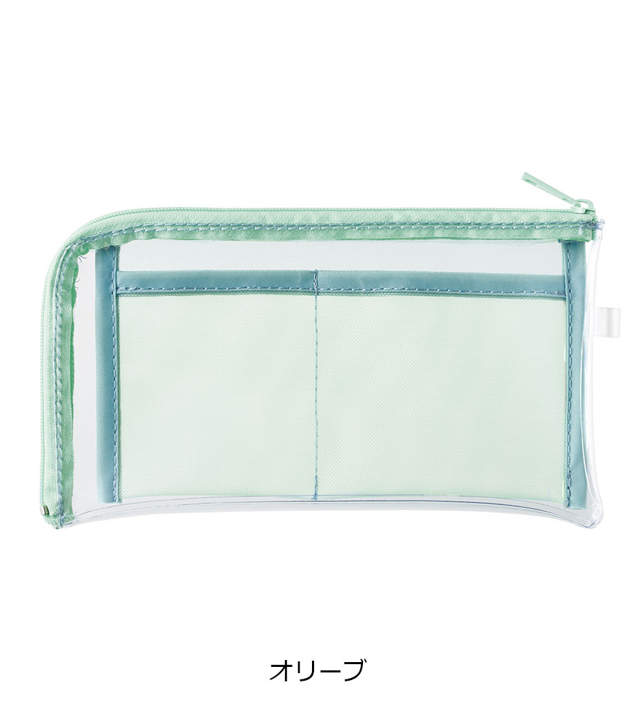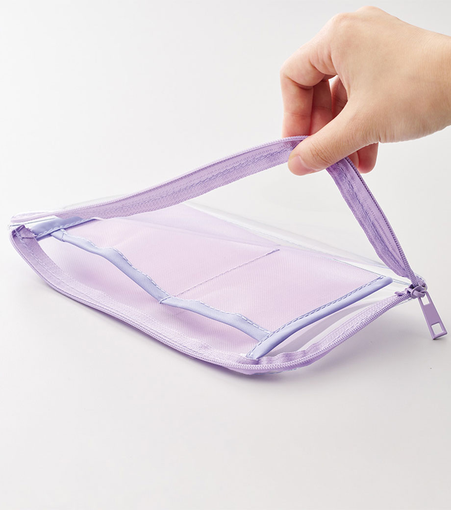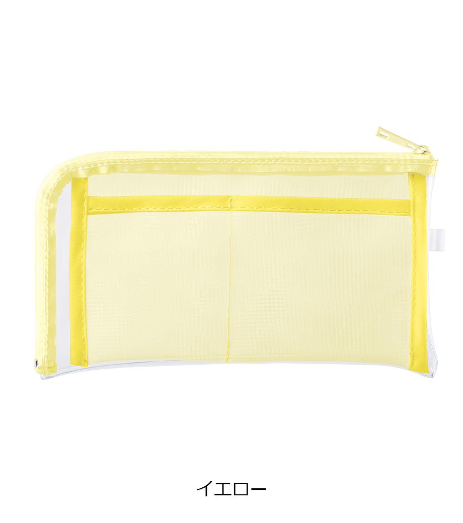 カラーファスナーがアクセントのスクエア型ビニールポーチ。四つ折りしたミニタオルが収まるサイズ感です。中身が一目でわかるのでアクセサリーや日用品の仕分けポーチに大人気。水に強いPVC素材で、アメニティ入れとしても使えます。